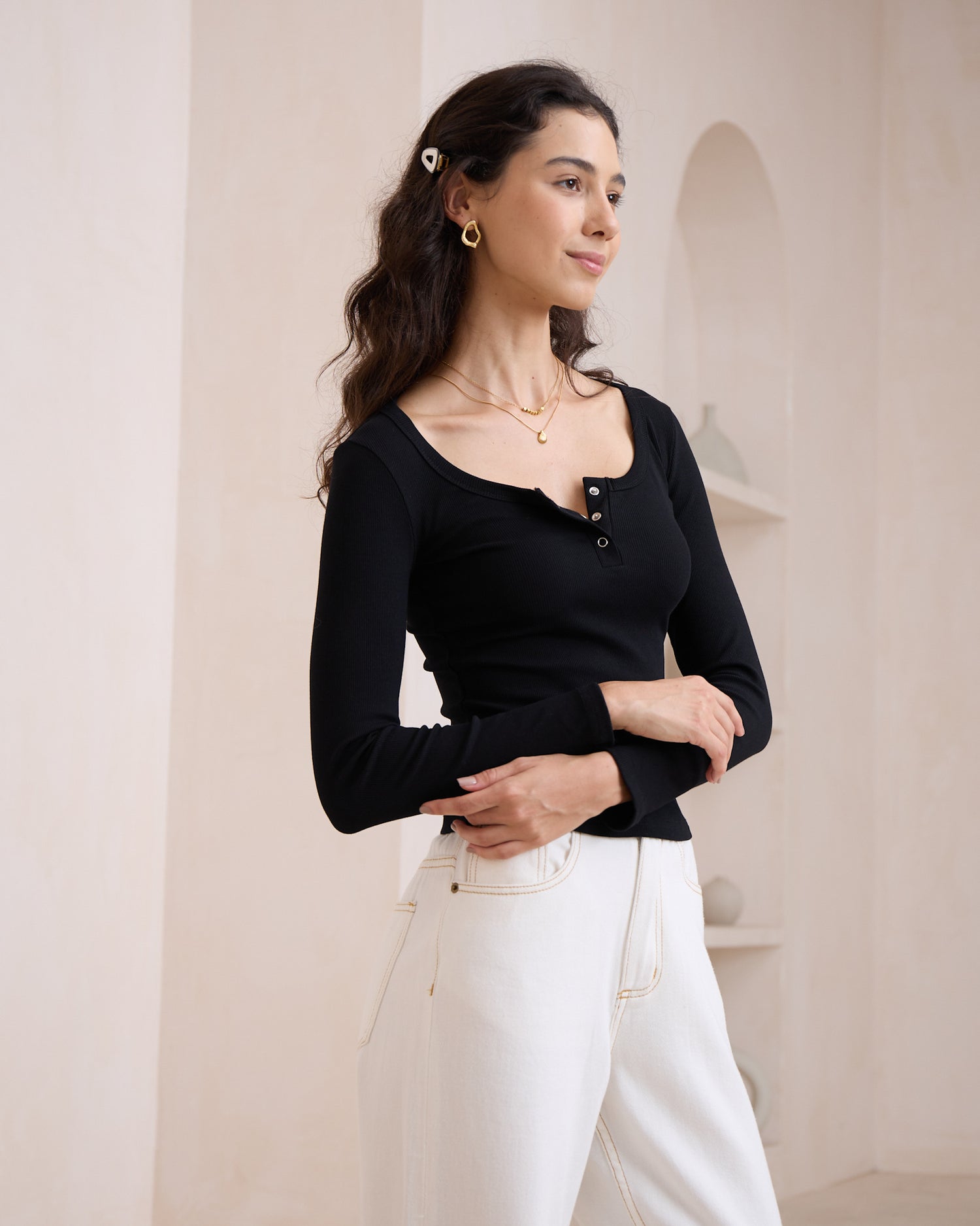 Introducing the Ada Black Ribbed Long Sleeve Top – a versatile and stylish addition to your wardrobe. This top features a ribbed knit fabric that offers both texture and stretch for a comfortable fit. The scoop neckline is enhanced with snap button detail, adding a touch of modernity to the classic design. With long sleeves and a fitted silhouette, the Ada top is perfect for layering or wearing on its own. The stretchy and comfortable fabric ensures all-day wearability, making it an essential piece for any season. The sleek black colour provides a clean and fresh look, easily pairing with jeans, skirts, or trousers for a chic and effortless style.