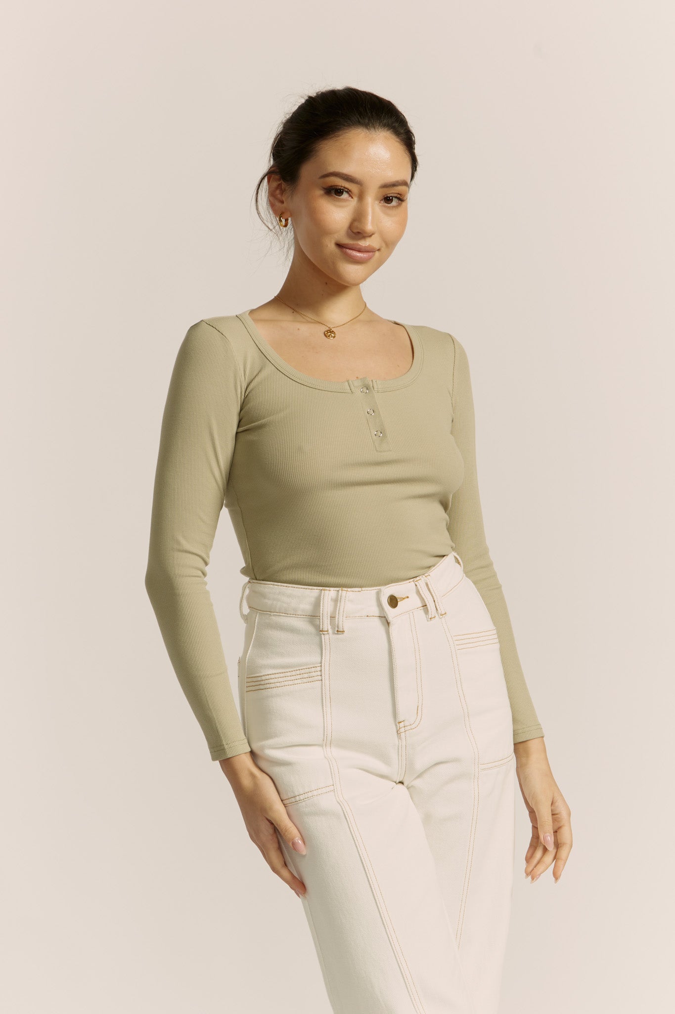 Introducing the Ada Light Khaki Green Ribbed Long Sleeve Top – a versatile and stylish addition to your wardrobe. This top features a ribbed knit fabric that offers both texture and stretch for a comfortable fit. The scoop neckline is enhanced with snap button detail, adding a touch of modernity to the classic design. With long sleeves and a fitted silhouette, the Ada top is perfect for layering or wearing on its own. The stretchy and comfortable fabric ensures all-day wearability, making it an essential piece for any season. The sleek light khaki green colour provides a clean and fresh look, easily pairing with jeans, skirts, or trousers for a chic and effortless style.