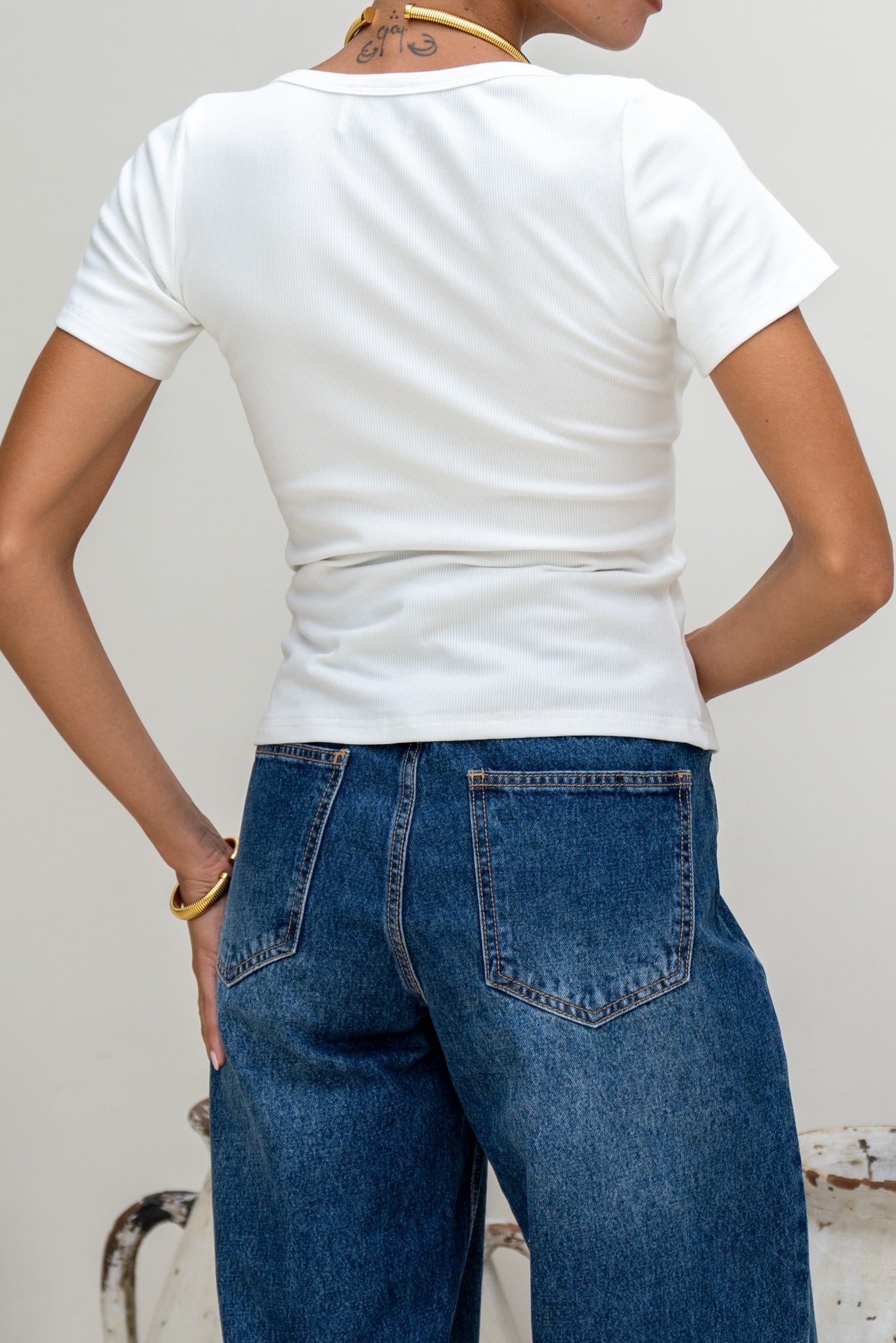 The Adi White Ribbed T-shirt is a great addition to your summer wardrobe. This simple but tasteful t-shirt features a rounded neckline and snap button for different styling options. The stretchy material offers a good fit for various body types, while the regular length makes it easy to wear both tucked-in or not.