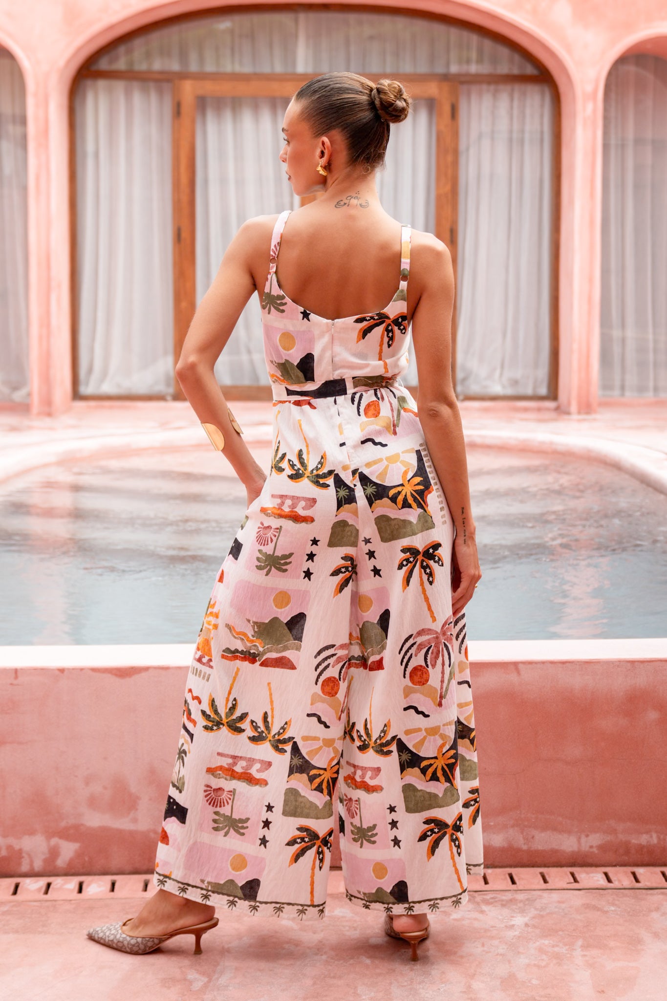 Step into colourful style with the Aeliana Multicolour Tropical Jumpsuit. This eye-catching ensemble features a playful V-neckline and adjustable shoulder straps for a customised fit. Accentuate your waist with the sleek tie detail, while the invisible zipper at the center back ensures a seamless look. The wide leg design and maxi length create a flowing, elegant silhouette that moves with you. Adorned with a multicolour tropical abstract print, this jumpsuit is a statement piece perfect for making an impression at any event or casual outing.