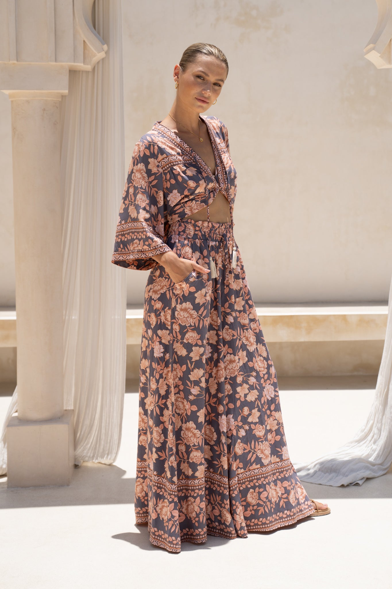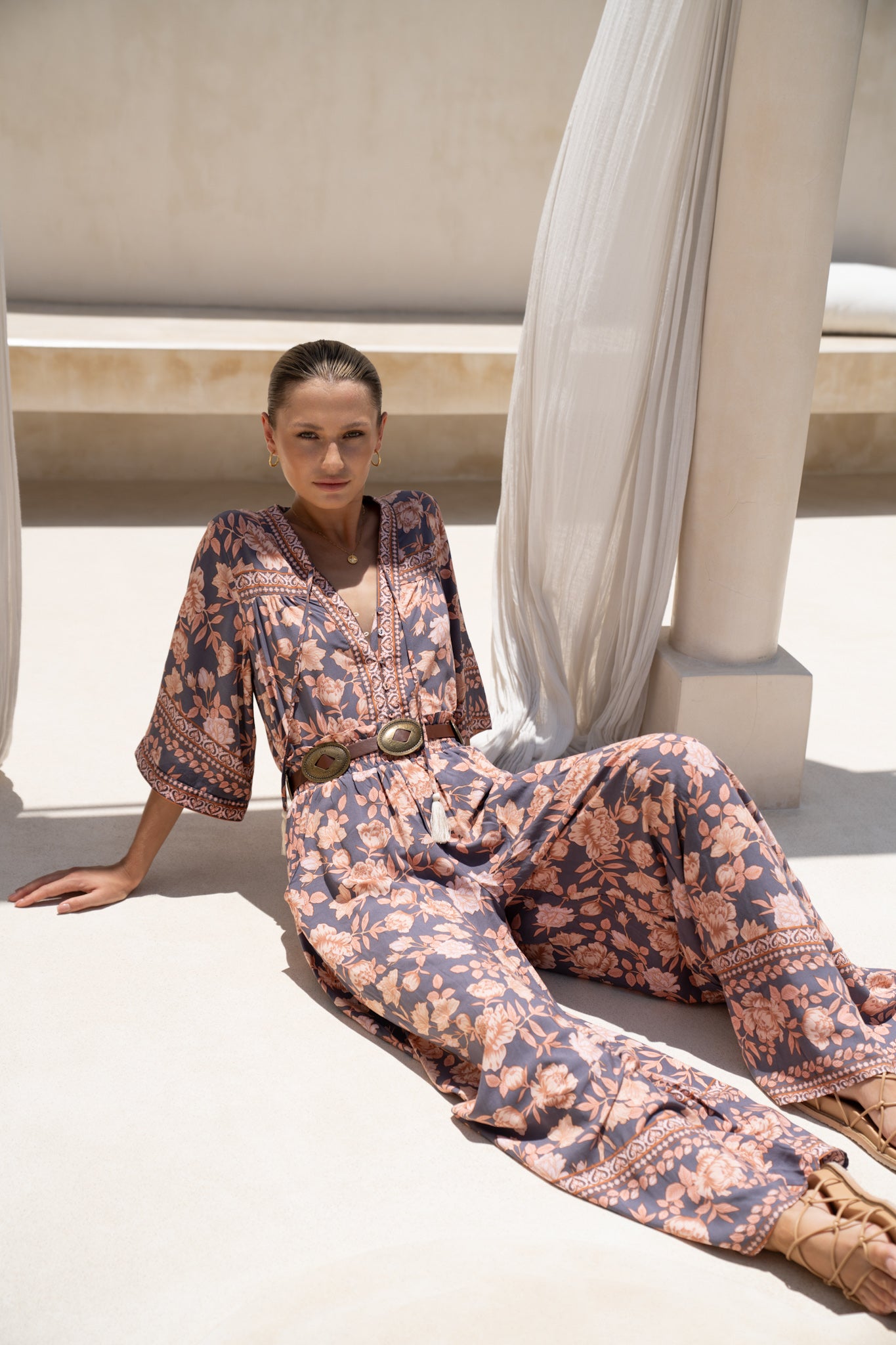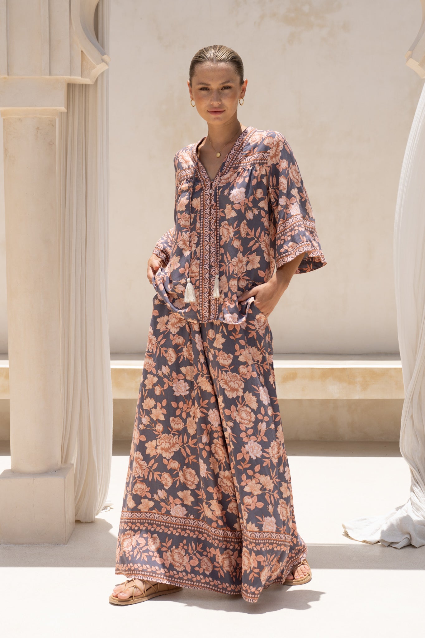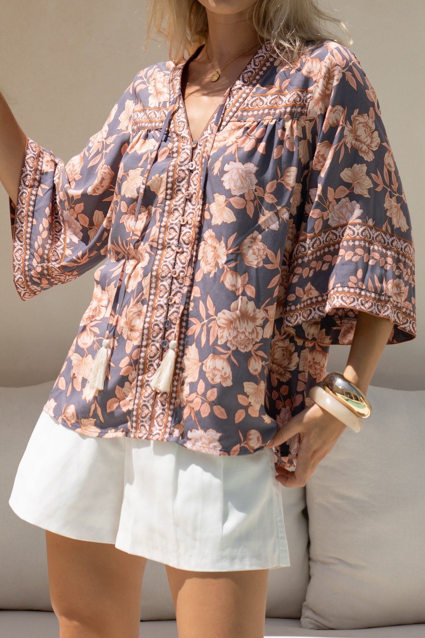 But the details... that's where the magic really happens. A deep V-neckline, framed by an intricate border print and finished with these fun little tassel ties that you can leave undone for a carefree vibe. The elbow-length sleeves flare out ever so slightly, adding a touch of bohemian drama. It’s all just so... effortless.