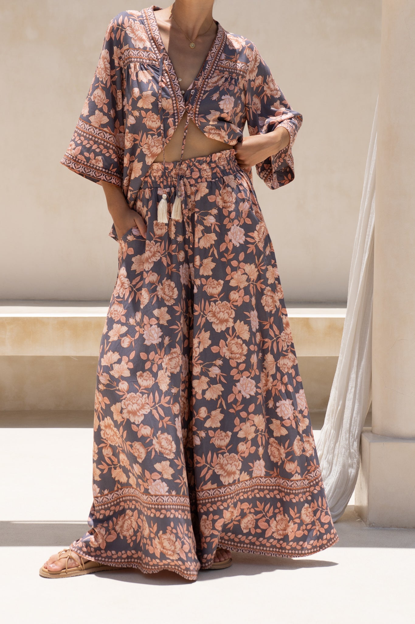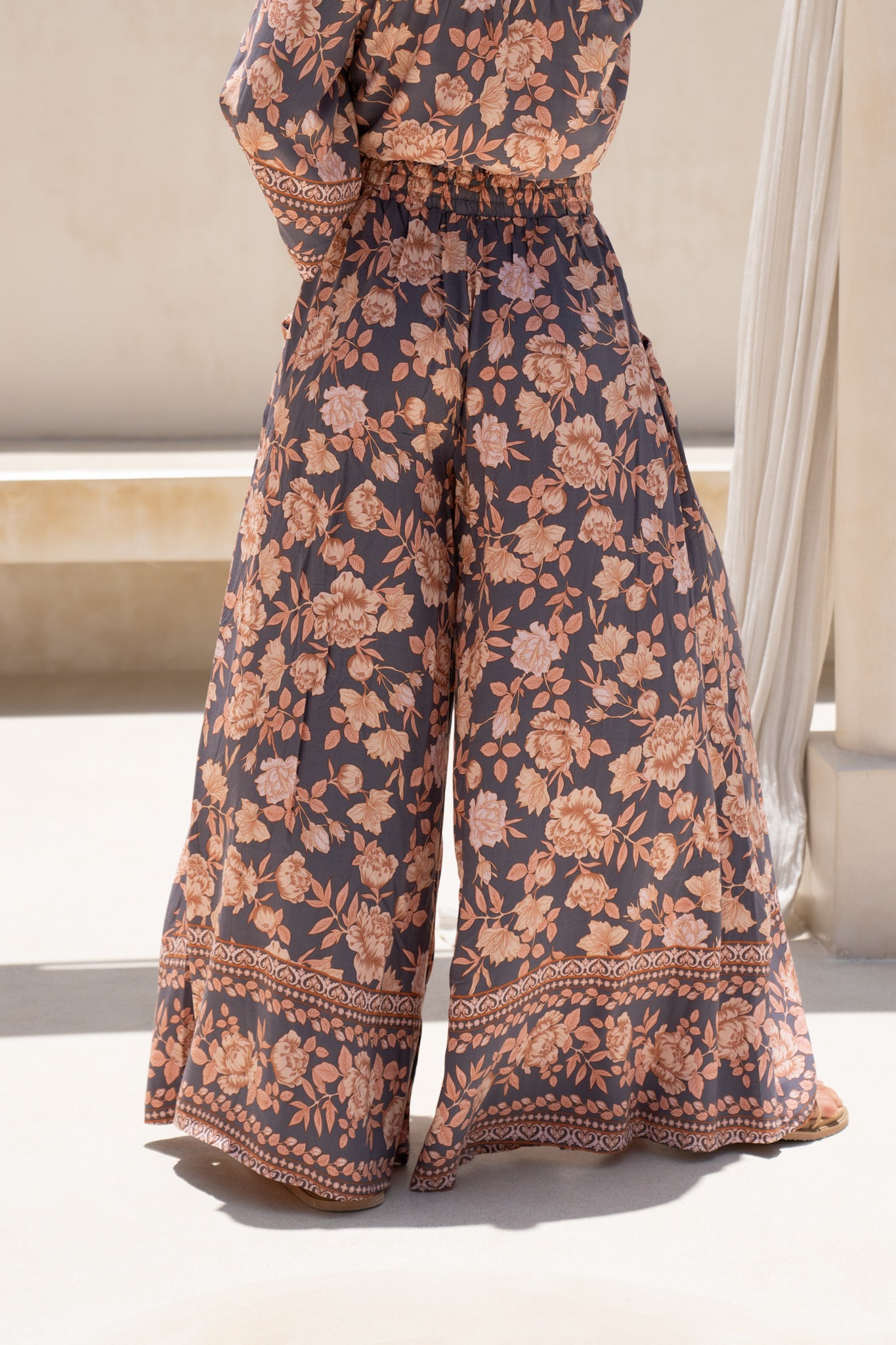 Amarante Navy Peach Floral Boho Wide Leg Pants
