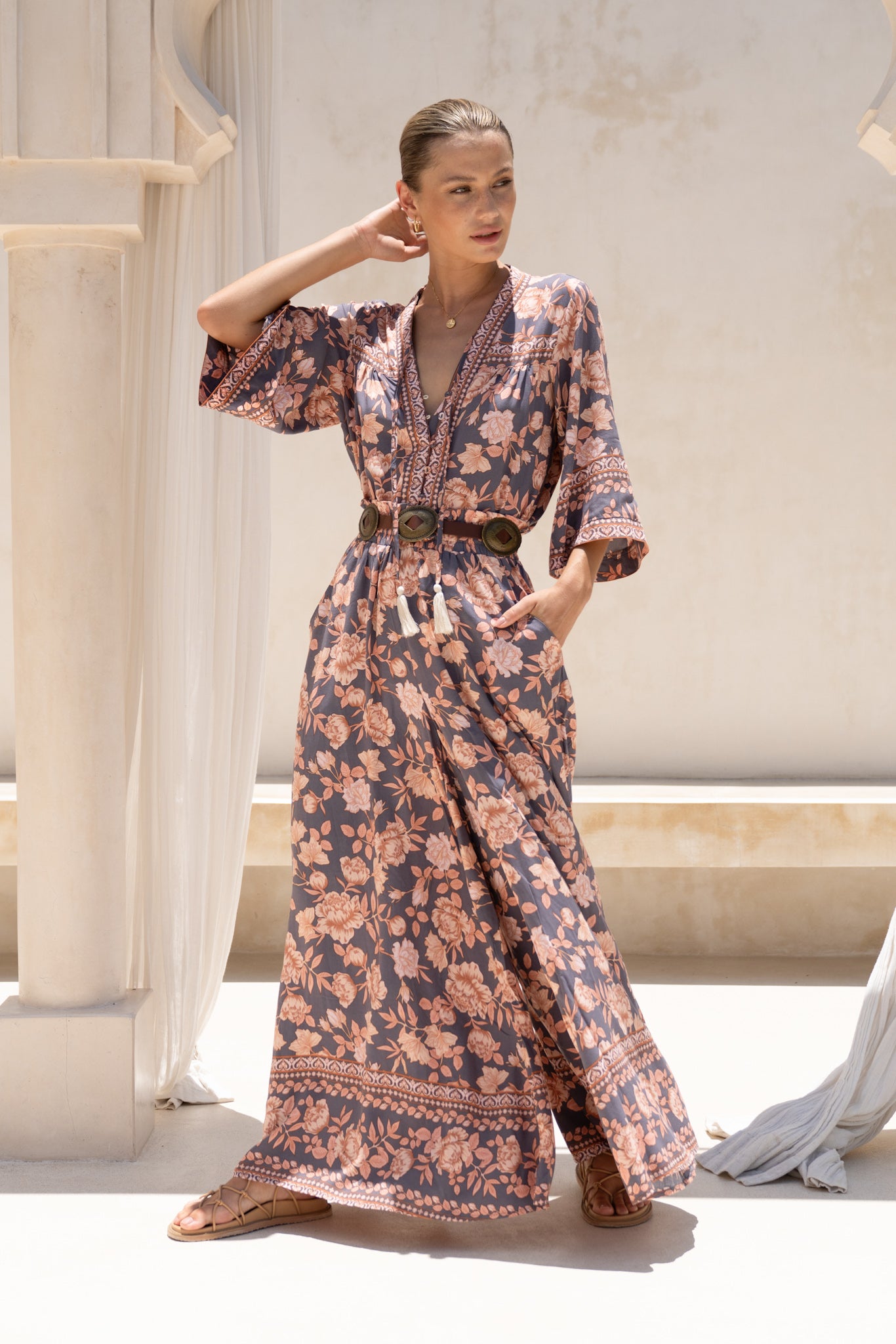 And that print. A dreamy, vintage-inspired floral in a sophisticated palette of deep navy and warm peach, grounded by an intricate border print at the hem that just screams bohemian romance. The waistband? Honestly, it's a gift. A super-comfy smocked panel with an adjustable tie means you get the perfect high-waisted fit, every single time. And because we believe in fashion that functions, yes they have pockets.