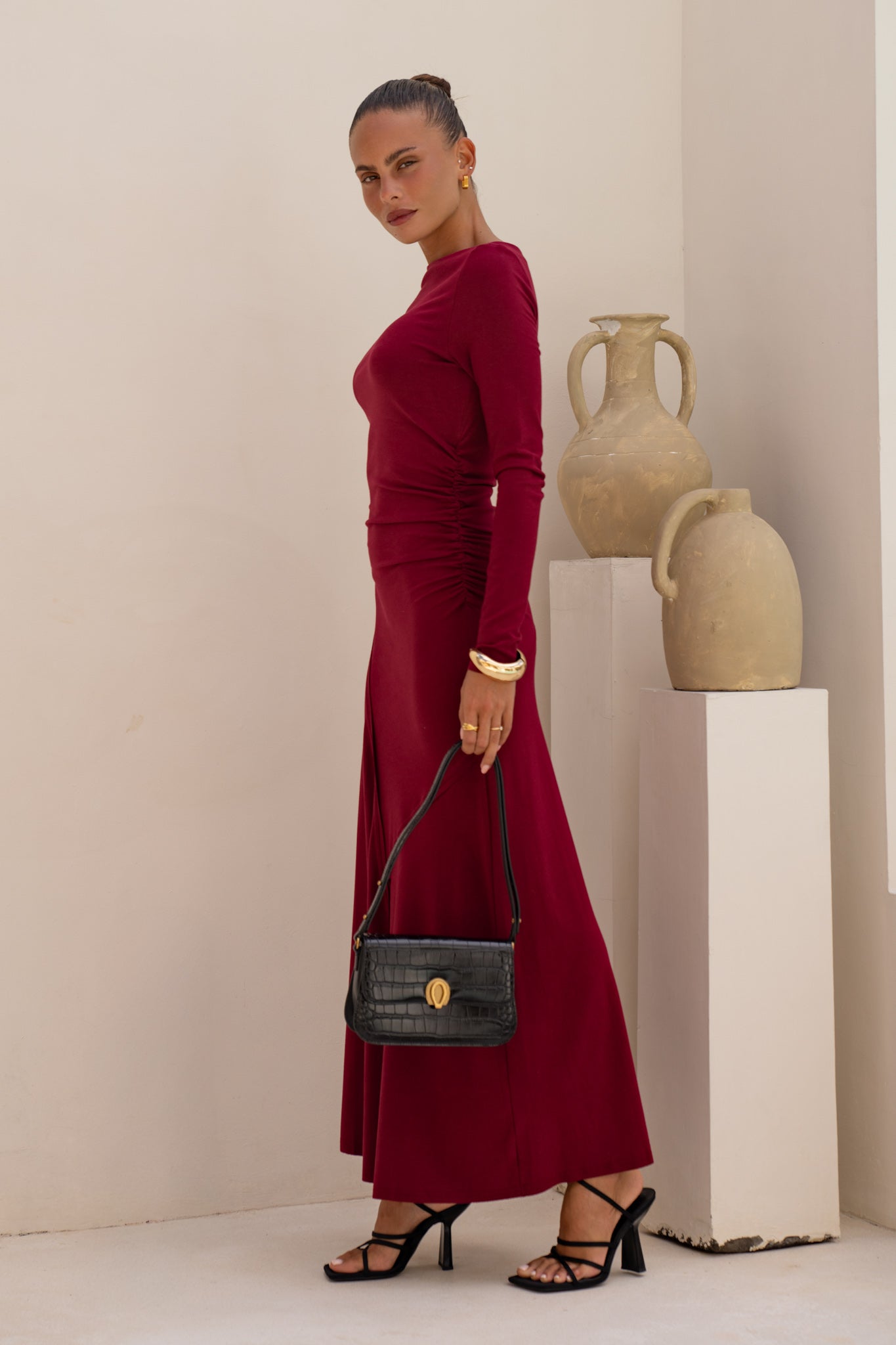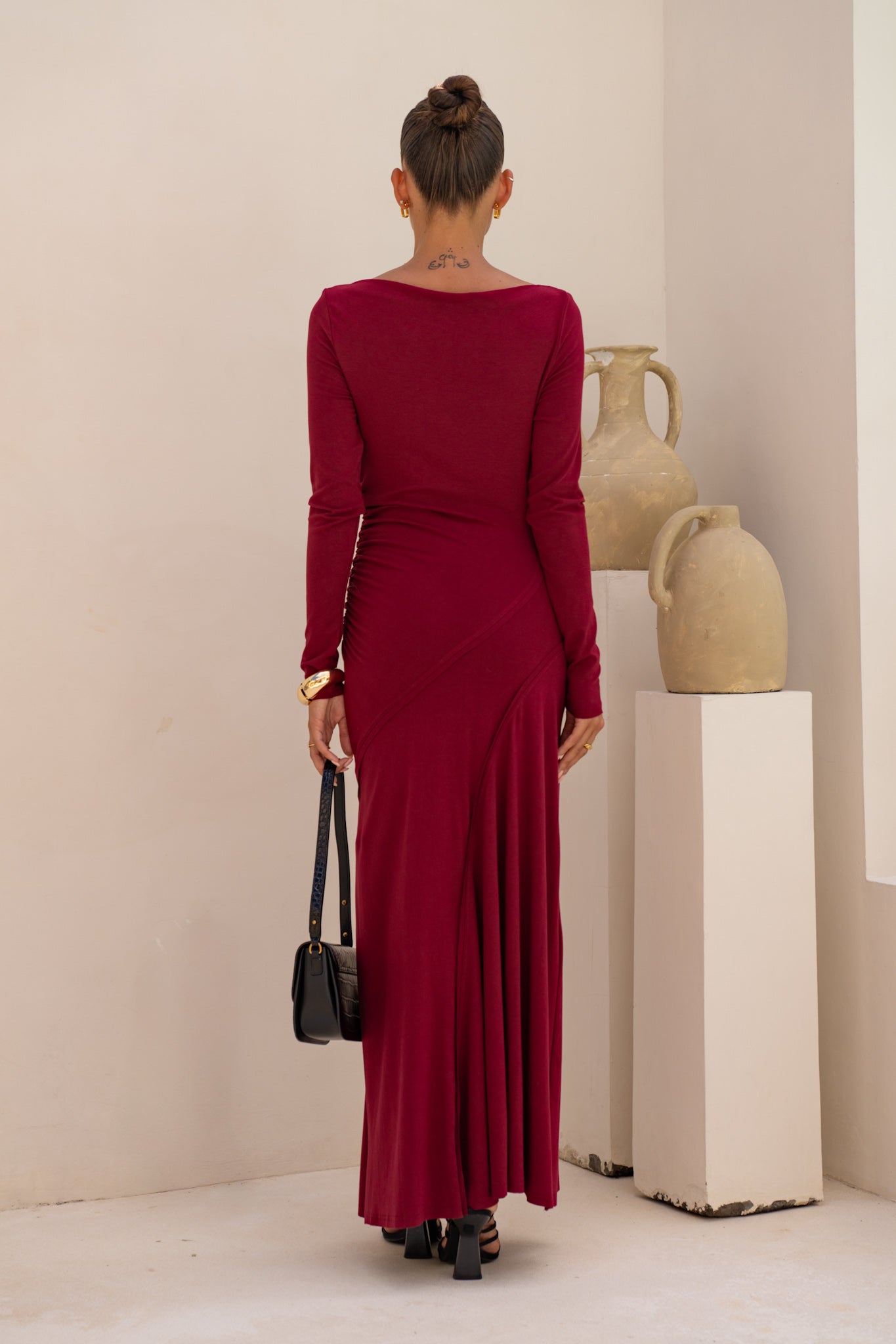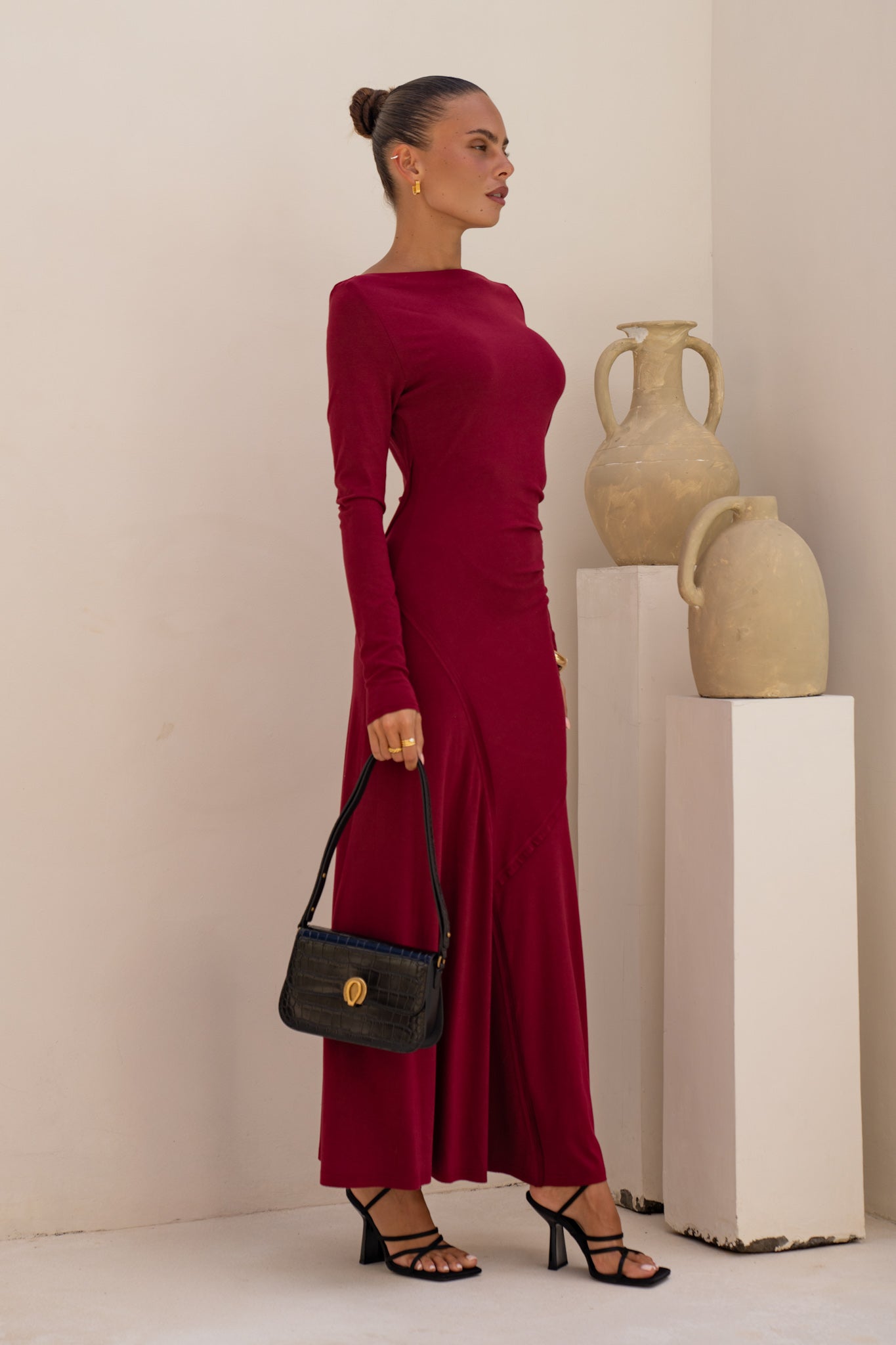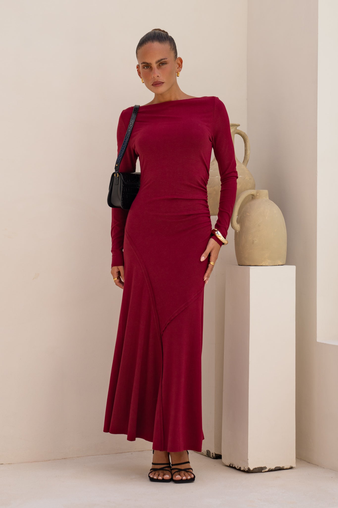 Amelyn Wine Red Long Sleeve Maxi Dress
