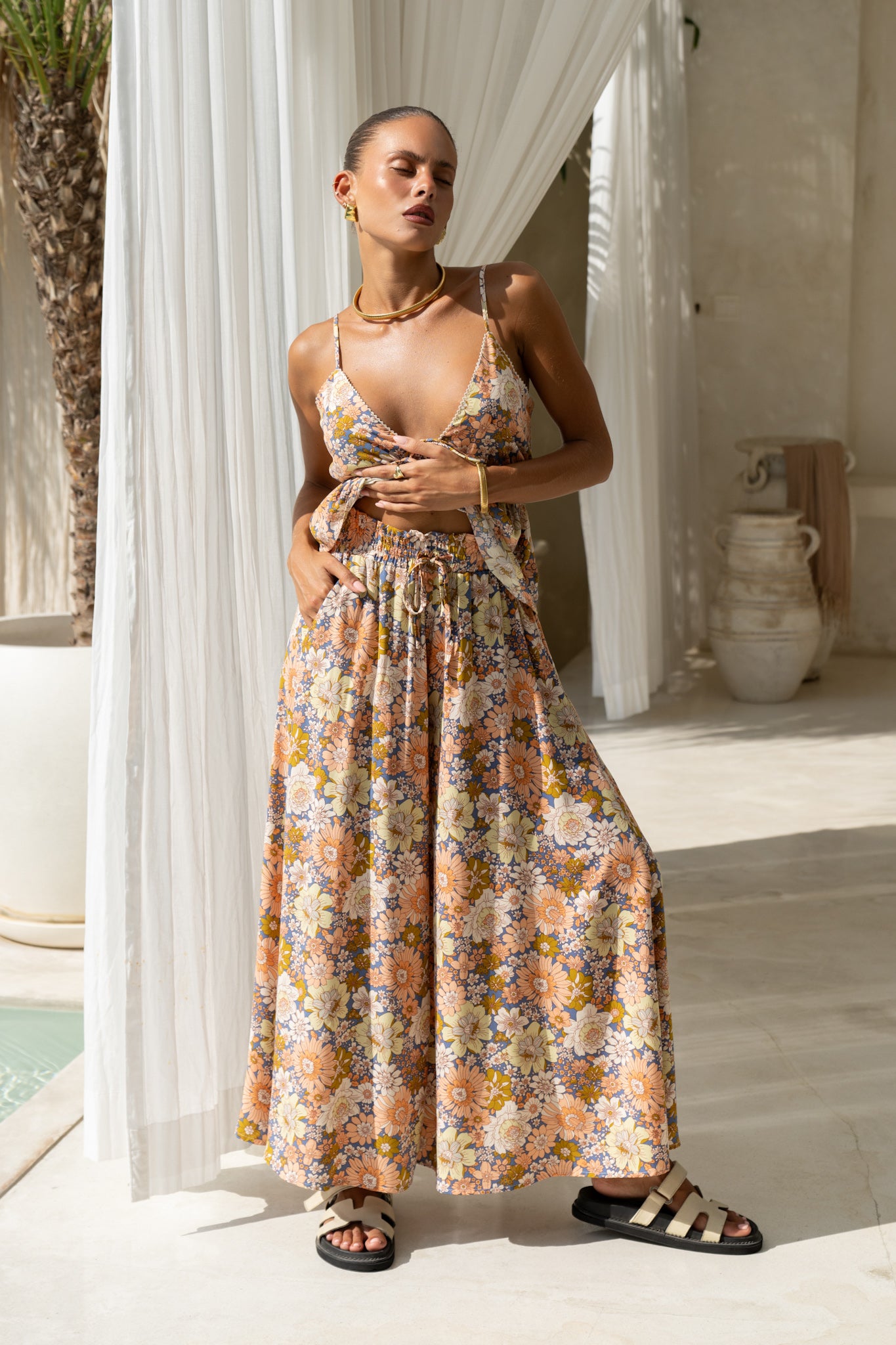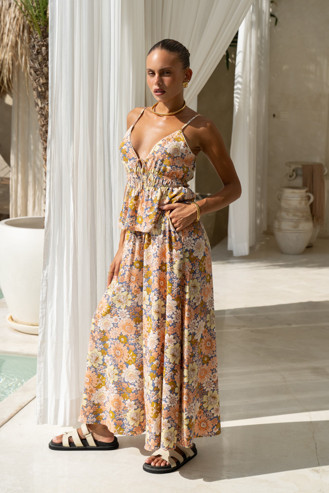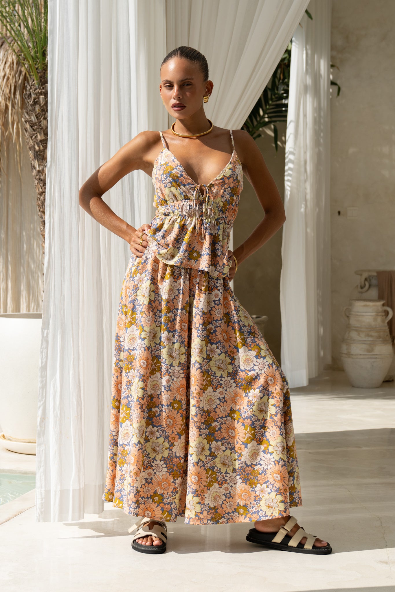 Discover the allure of the Aurelie Orange Blue Floral Lace Cami Top, featuring an adjustable tie detail at the centre front bodice and adjustable shoulder straps that let you tailor the fit to perfection. A stunning V-neckline, accented with delicate lace, leads to a beautifully ruched waist. The stretchy, elasticated high waistline ensures both comfort and a flattering hourglass silhouette. Crafted from soft, flowing rayon, it’s lightweight and incredibly comfortable, perfect for all-day wear. The orange and blue floral is so easy to pair with your favourite bottoms, making this an essential addition to your wardrobe. Complete the look with our matching Aurelie pants!