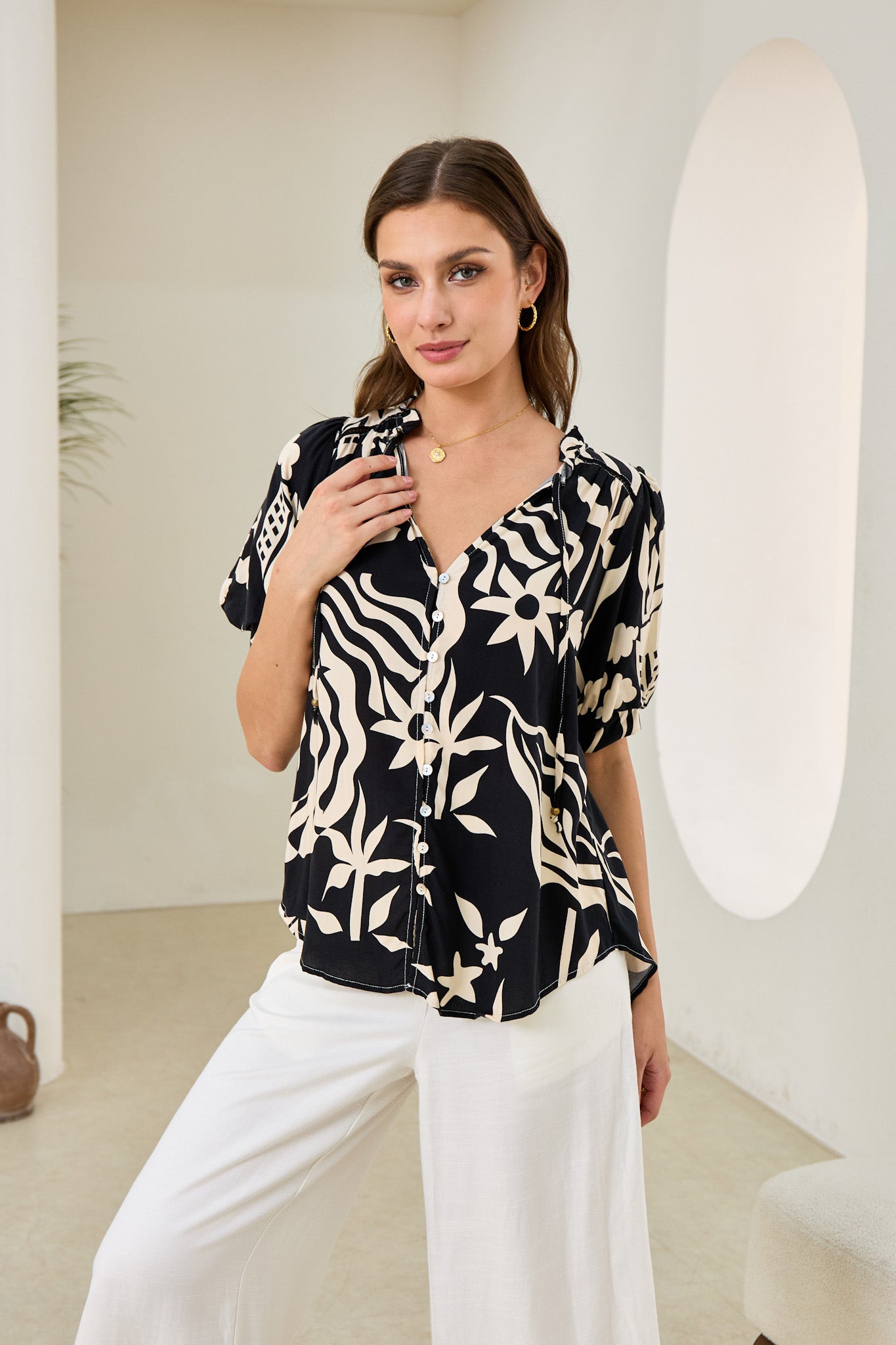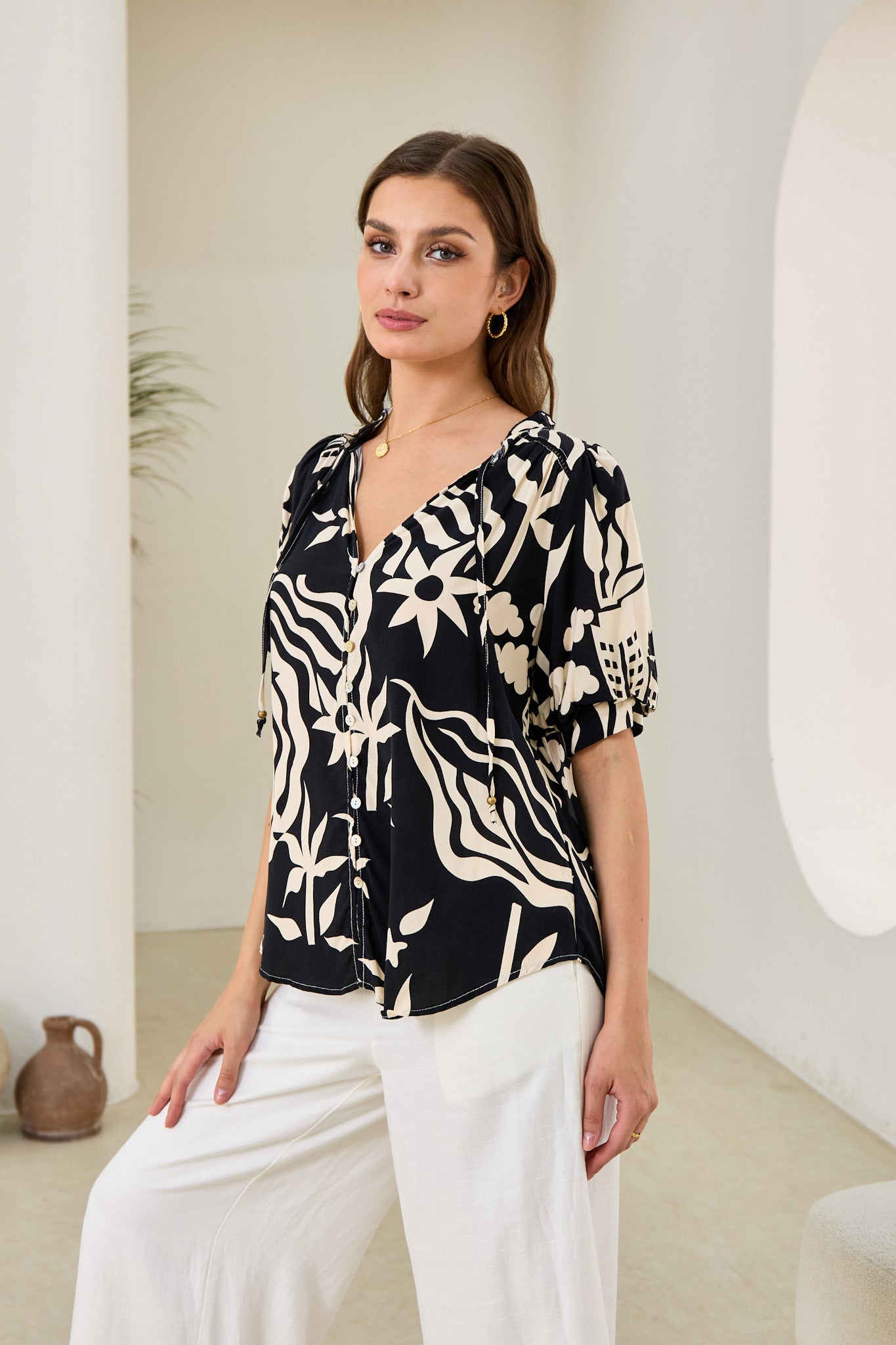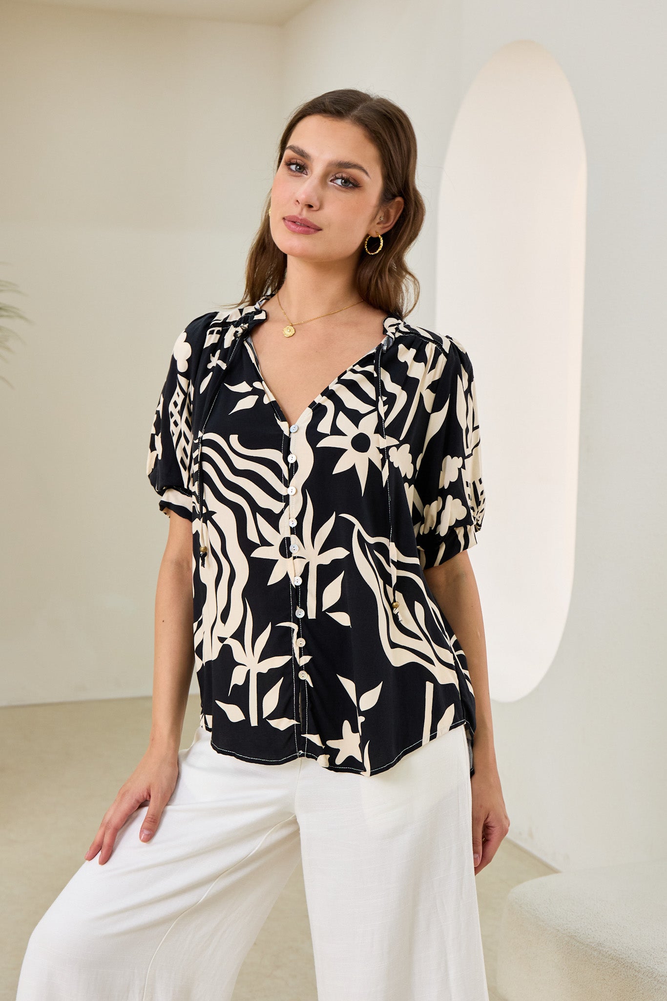 Our Cali Black Abstract Puff Sleeve Top is the epitome of modern elegance. This exquisite top features a captivating V-neckline adorned with delicate frill details that create a visually stunning effect. For added versatility, you have the option to tie the neck as you desire. The full button-down front, not only adds charm but also makes dressing a breeze. The short puff sleeves are a fashion statement in themselves, and their buttoned cuffs provide an extra touch of sophistication. Lace detailing on the shoulders and back further enhances the feminine appeal. Crafted from soft and comfortable rayon, this top is perfect for those warm, sun-kissed days. With a regular length and a black and beige abstract print, it's a versatile piece that can be dressed up or down to suit any occasion. Elevate your chic style with the Cali Black Abstract Puff Sleeve Top, a versatile and enchanting addition to your wardrobe.
