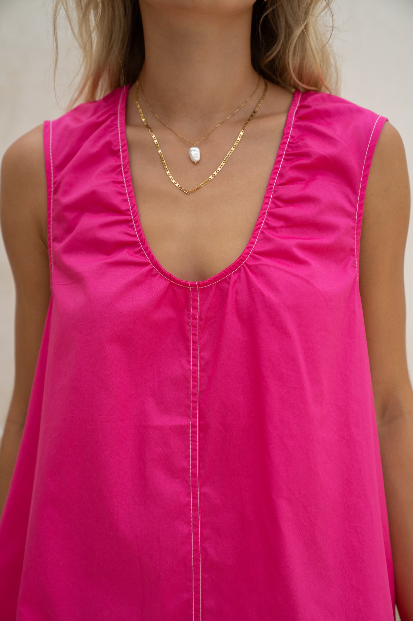 Cut from crisp 100% cotton, this pink cotton mini dress feels light and cool, like that first step out into a warm summer night. The neckline dips into a soft scoop with gentle ruching, which I think is the secret sauce: it frames your collarbones, sits comfortably over the bust, and still leaves plenty of room for layered necklaces.