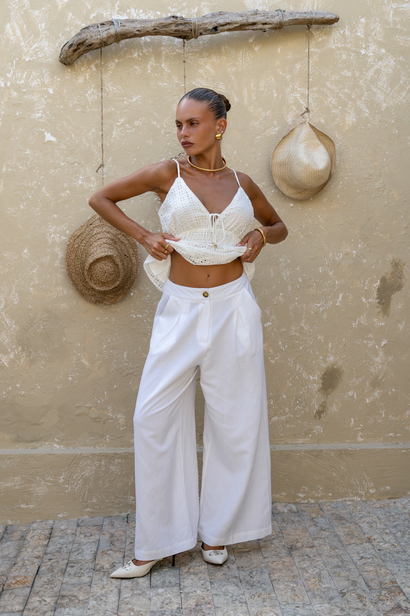 Discover the allure of the Celia White Broderie Lace Cami Top, featuring an adjustable tie detail at the centre front bodice and adjustable shoulder straps that let you tailor the fit to perfection. A stunning V-neckline, accented with delicate lace, leads to a beautifully ruched waist. The stretchy, elasticated high waistline ensures both comfort and a flattering hourglass silhouette. Crafted from dainty cotton lace, it’s lightweight and incredibly comfortable, perfect for all-day wear. The off-white shade is so easy to pair with your favourite bottoms, making this an essential addition to your wardrobe.