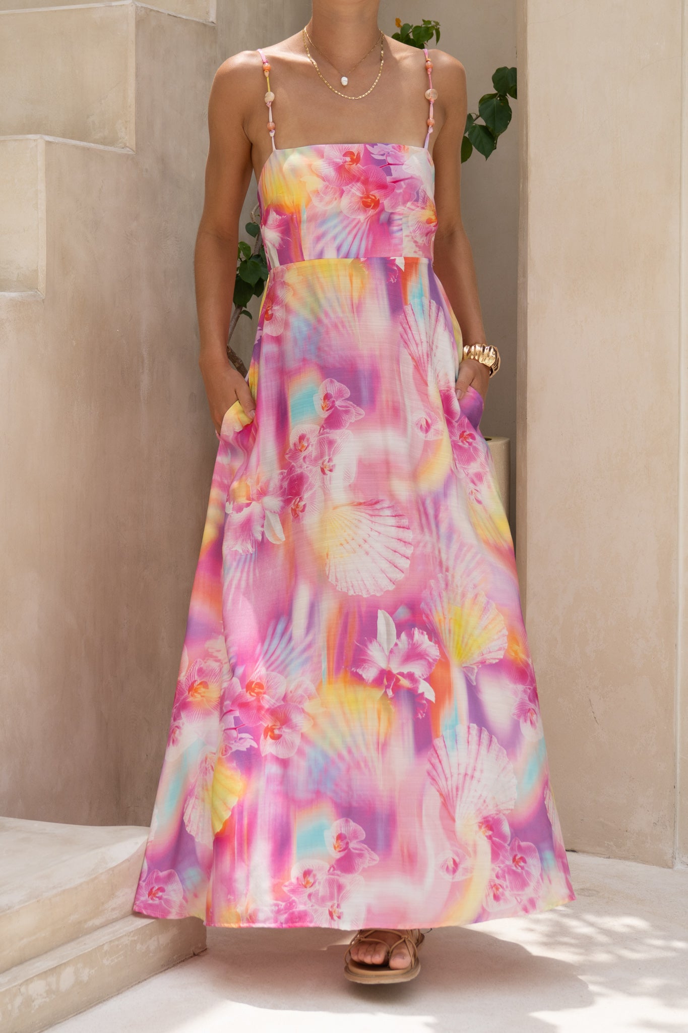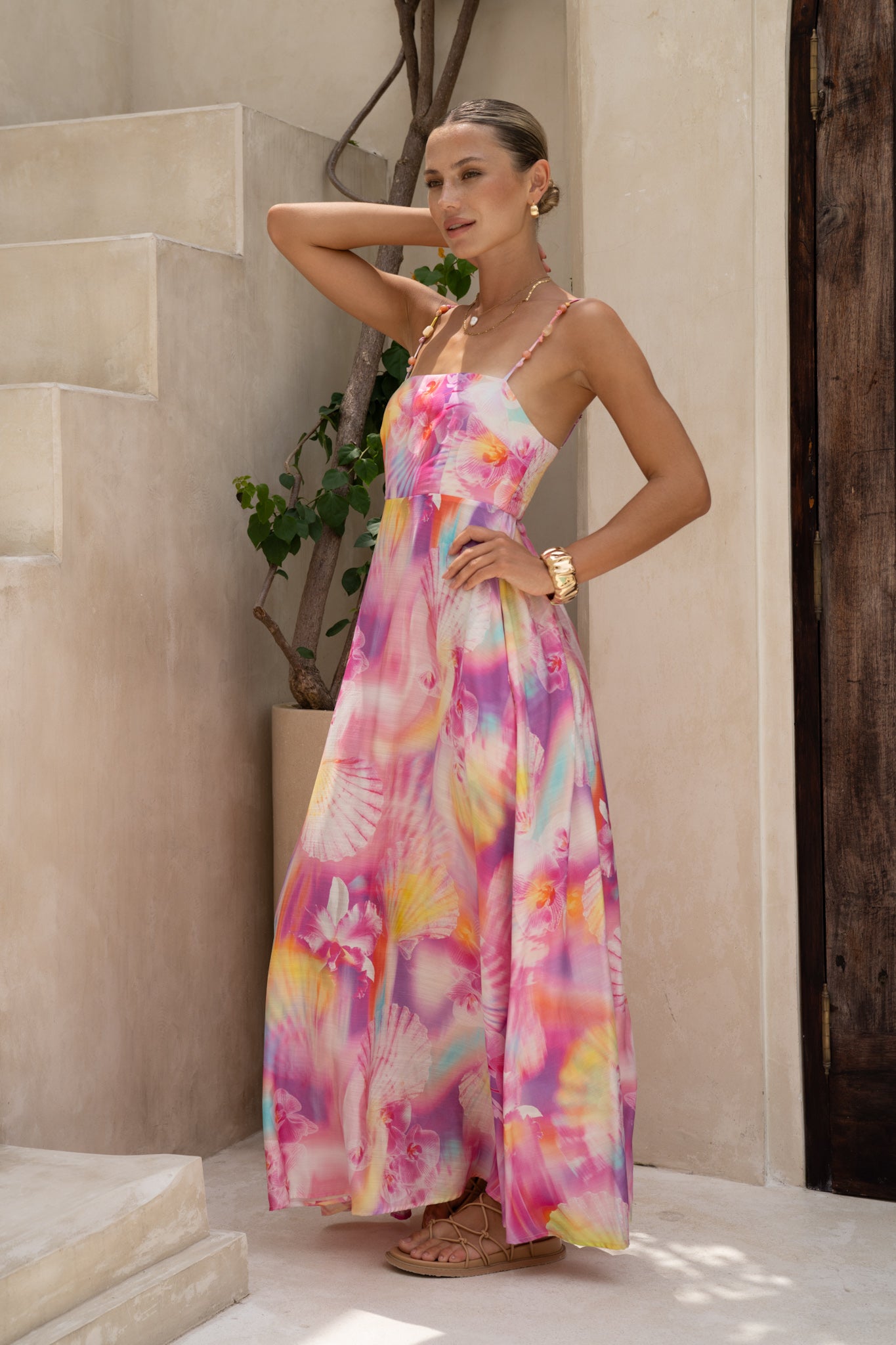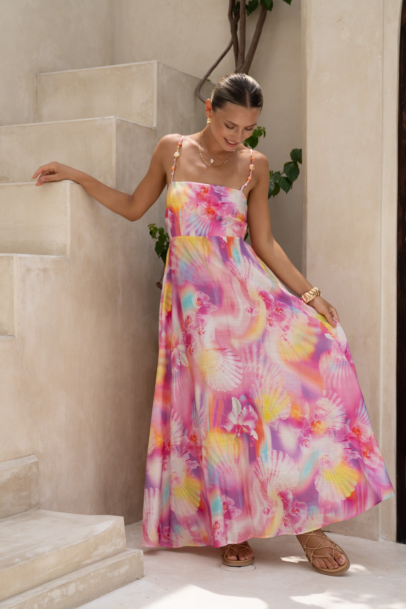 The Cirella Multicolour Abstract Beaded Flared Maxi Dress is one of those pieces that feels like a holiday — even if you’re just heading to brunch. It’s bold, joyful, and unapologetically expressive, with a swirling abstract print that blends shell-like forms, soft florals, and luminous colour washes. Think sunset skies, coastal escapes, and that feeling when summer stretches on just a little longer.