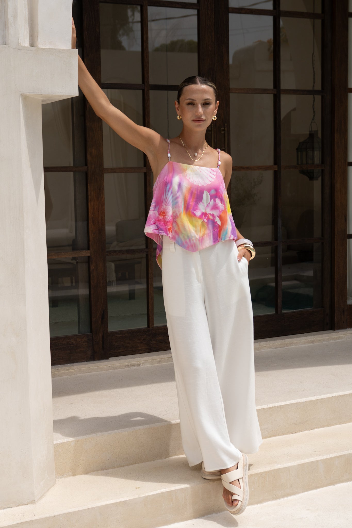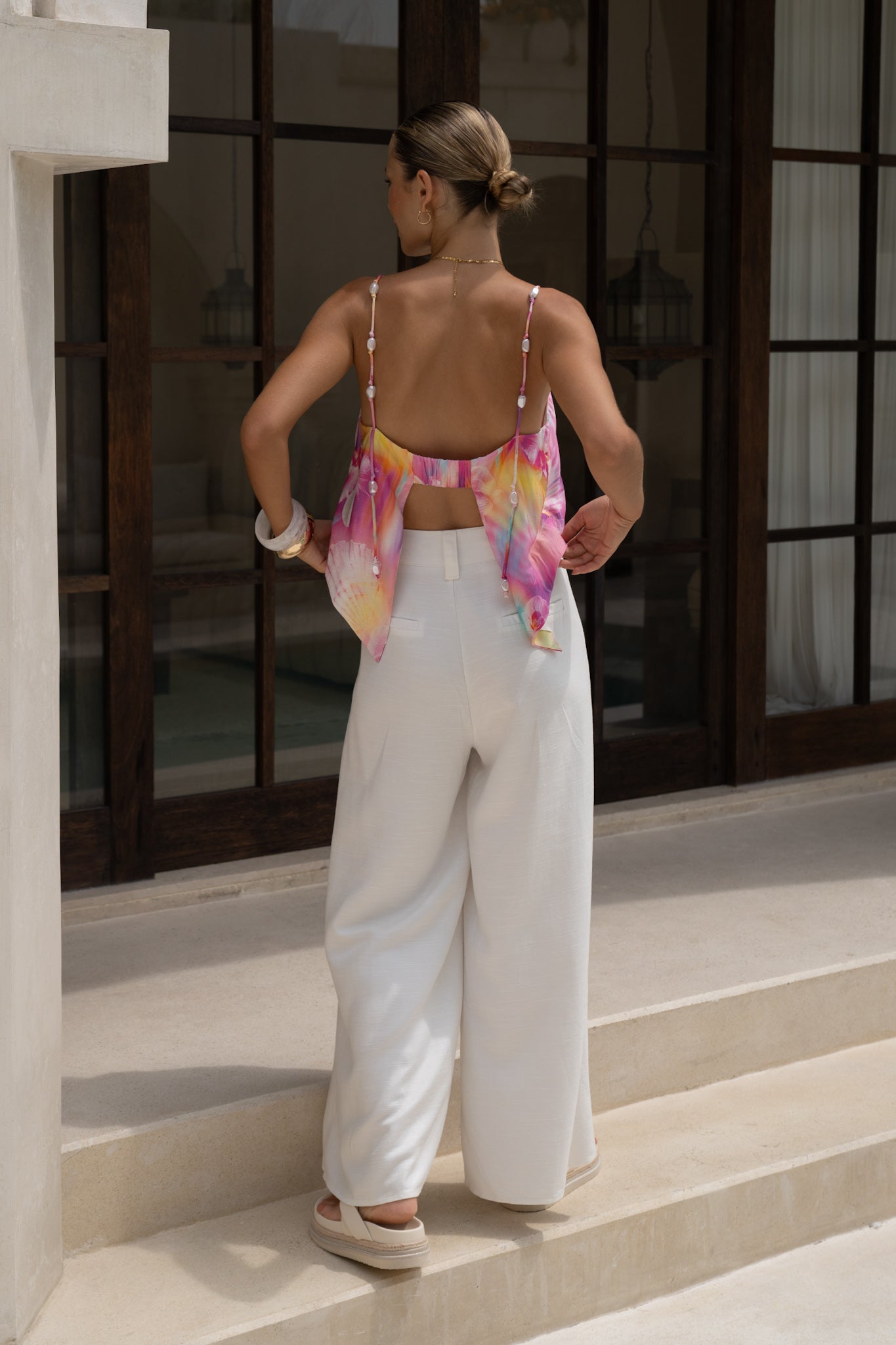 The square neckline keeps things sharp and contemporary, balancing beautifully against the softness of the print. Slim straps sit delicately on the shoulders, finished with faux pearl beads that feel a little undone, a little coastal — not precious, just interesting. At the back, an open silhouette with an elasticated band adds comfort (and a touch of drama) without sacrificing wearability.