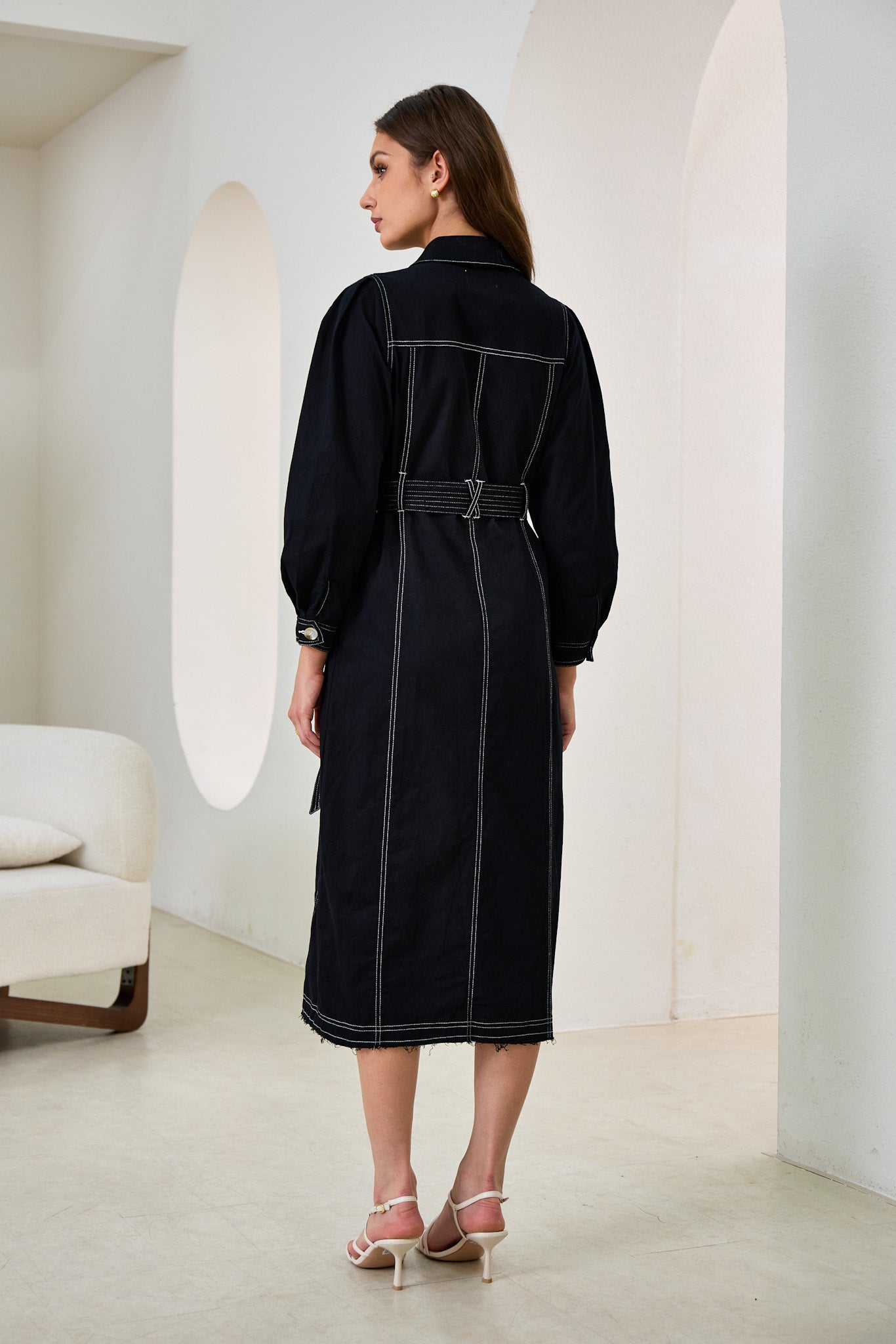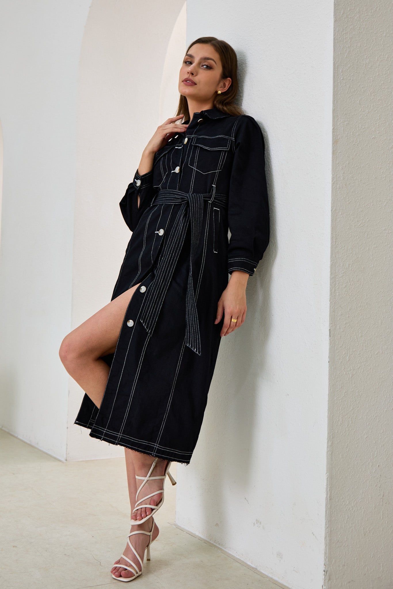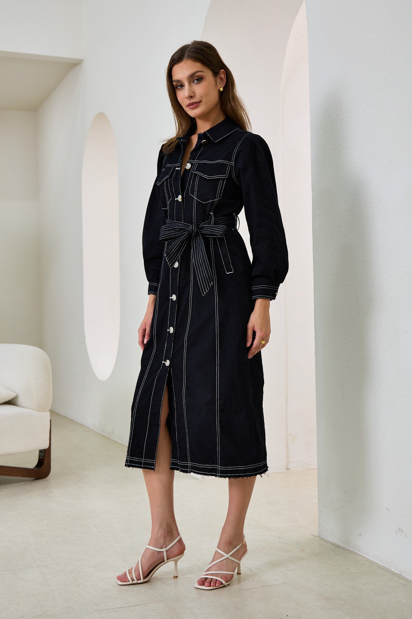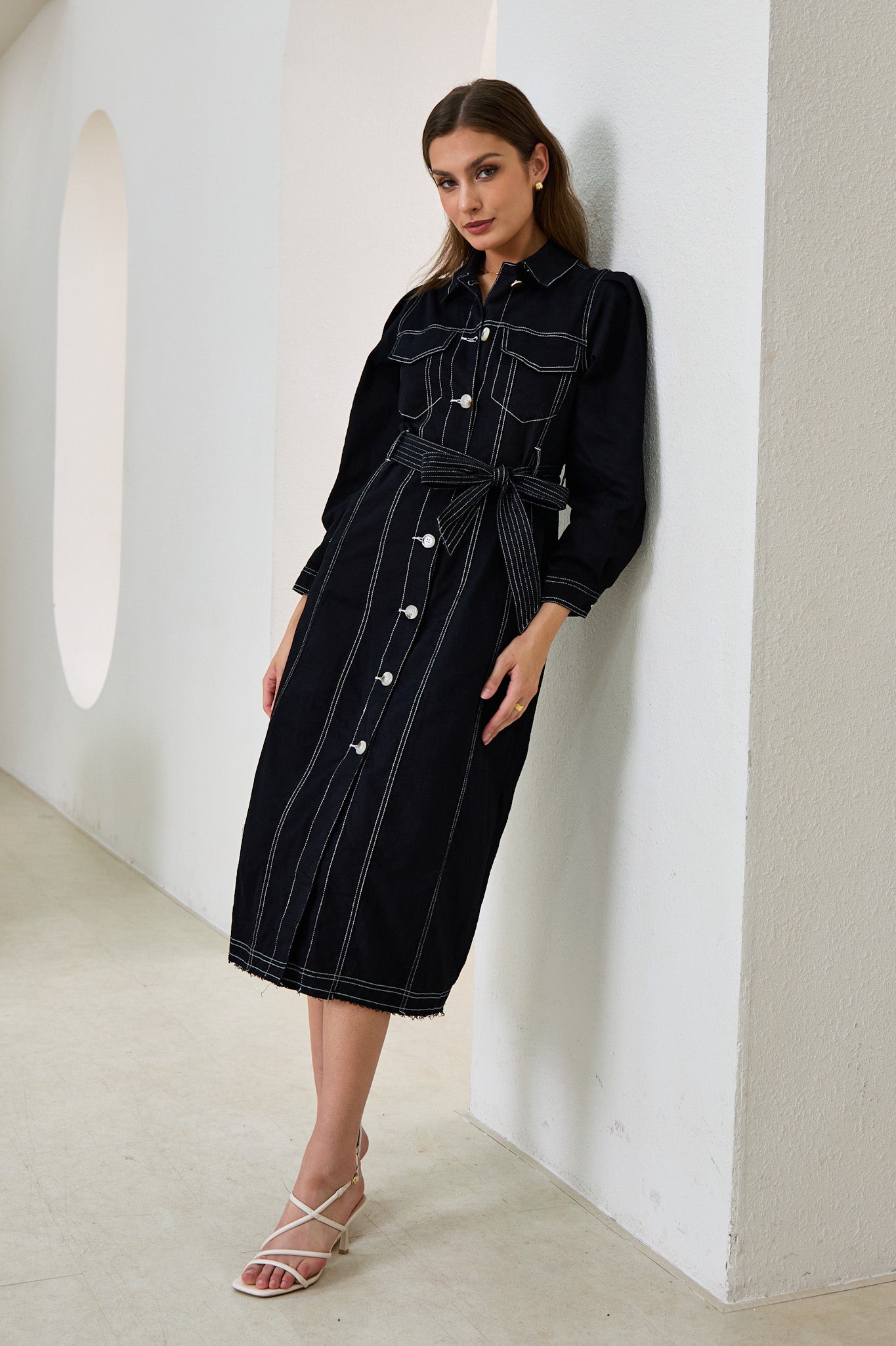 Cleo Black Button Down Belted Midi Dress