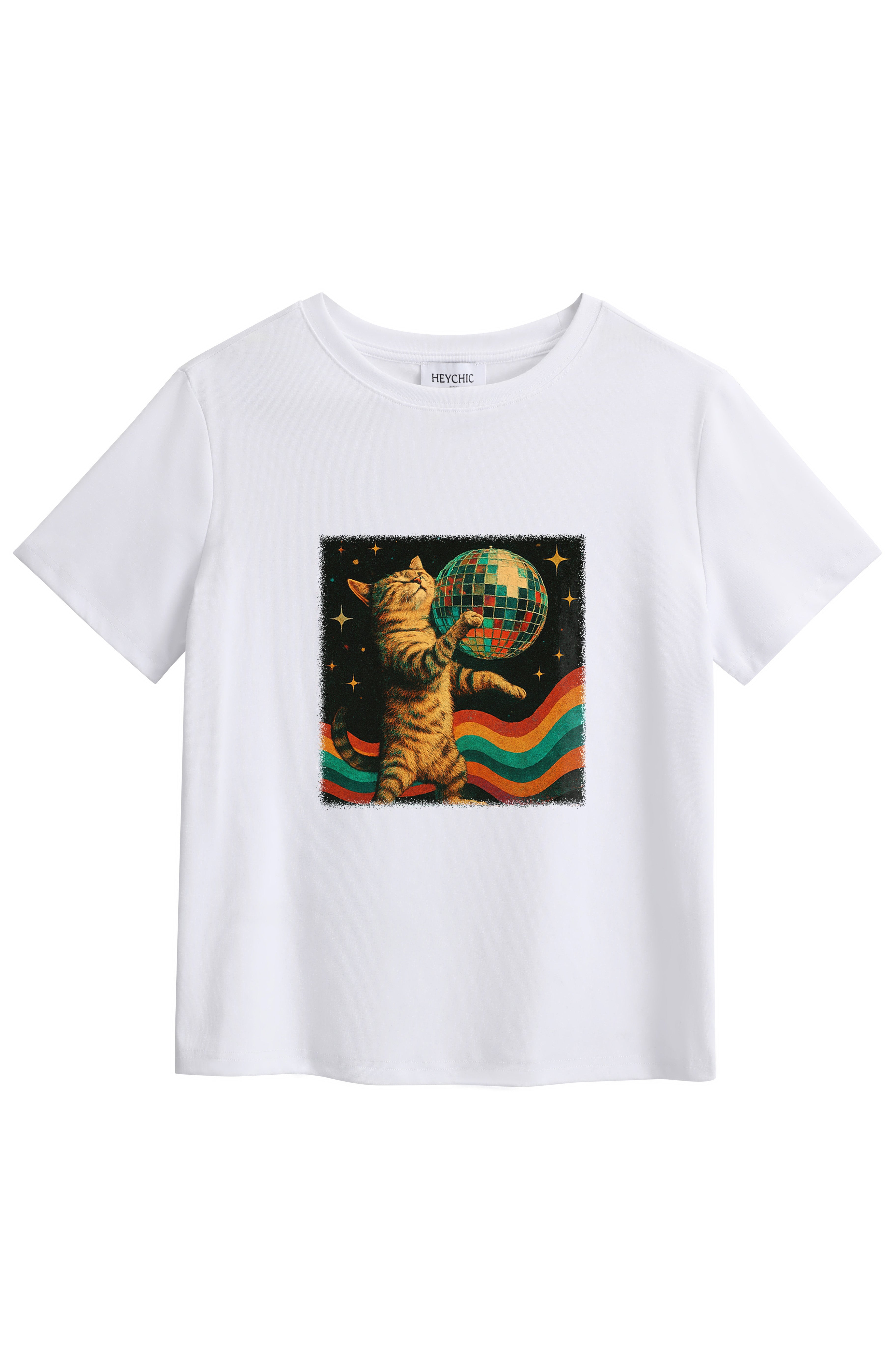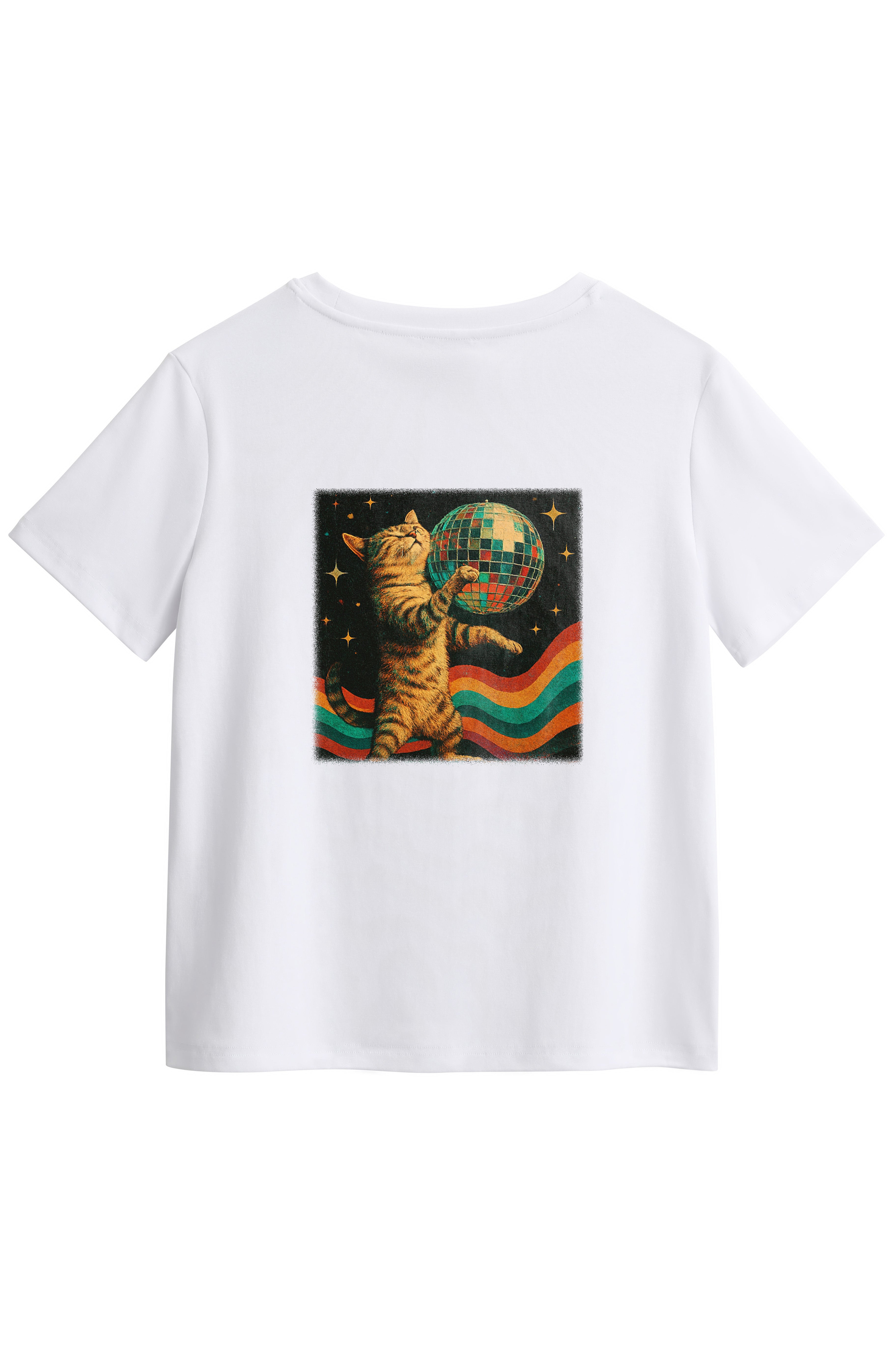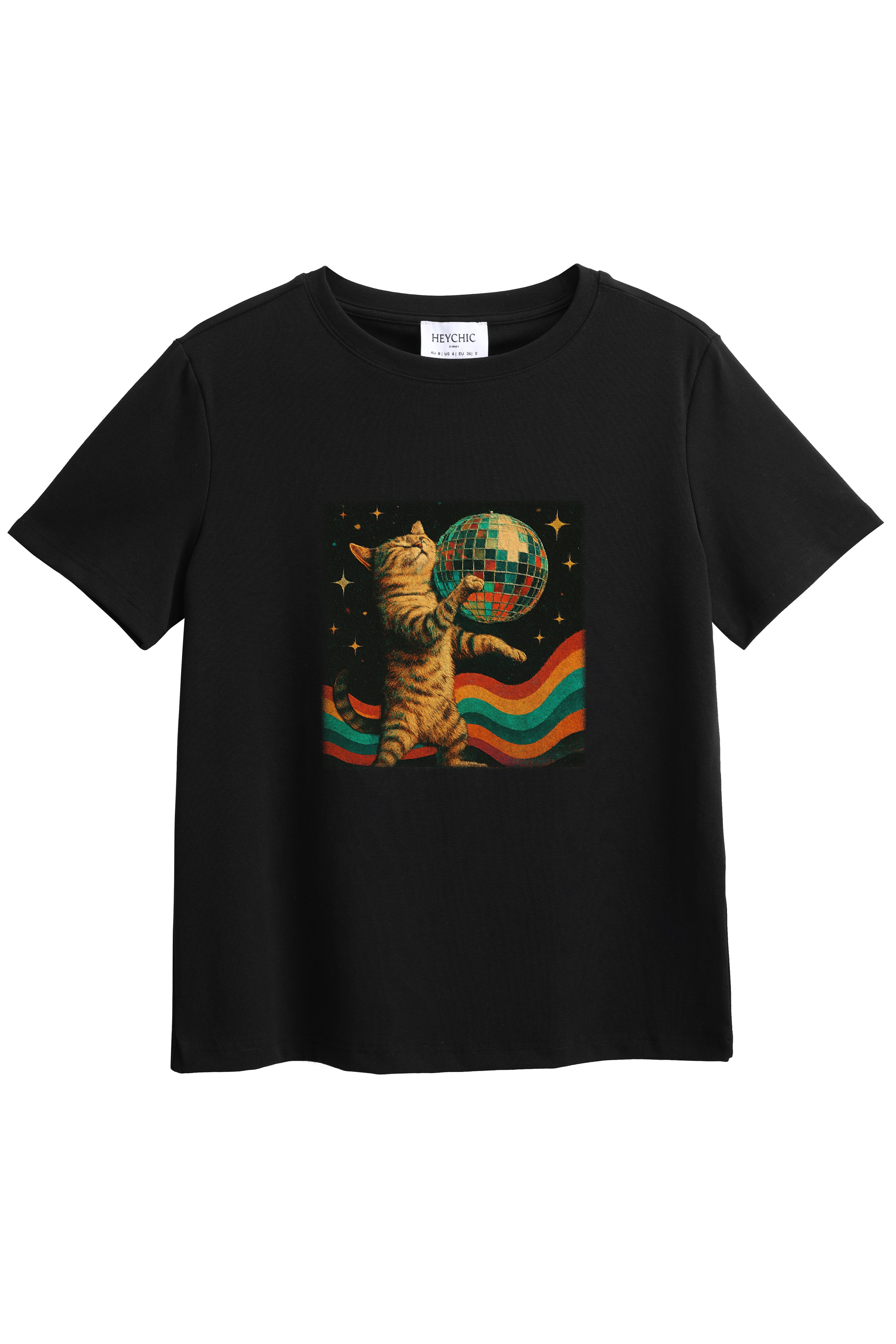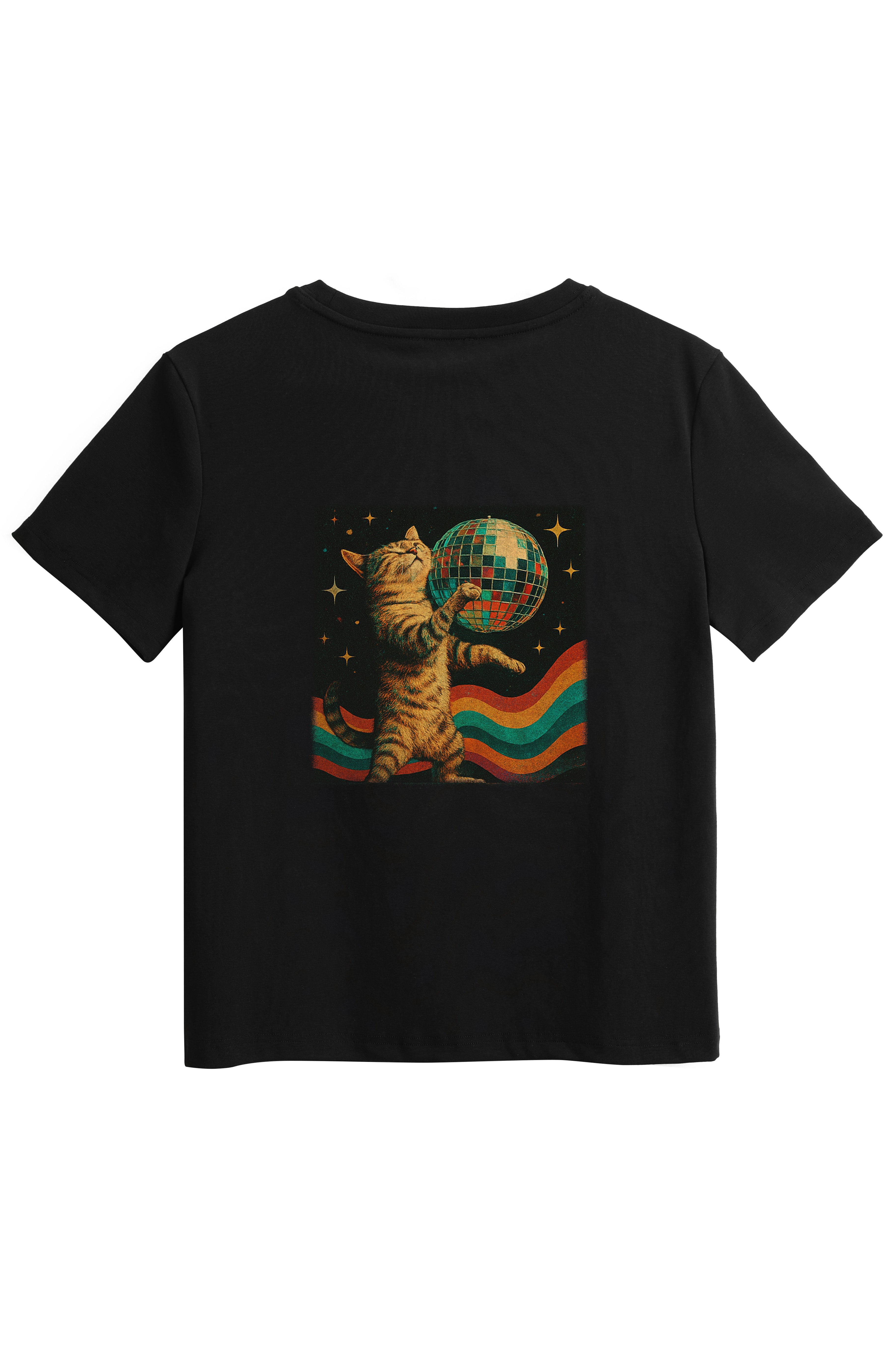 Express your individuality with our made-to-order printed T-shirt featuring the Disco Ball Cat design. Crafted from a soft and stretchy cotton-spandex blend, this tee offers a Classic fit with a round neckline and hip-length hem - perfect for everyday comfort with a splash of fun. Firstly, choose from a white or black base colour, then choose the print position at the front or back. Each shirt is printed on demand, ensuring your chosen design stands out. Pair it with your fav denim jeans, skirts, or shorts for a casual-cool look that's uniquely yours.