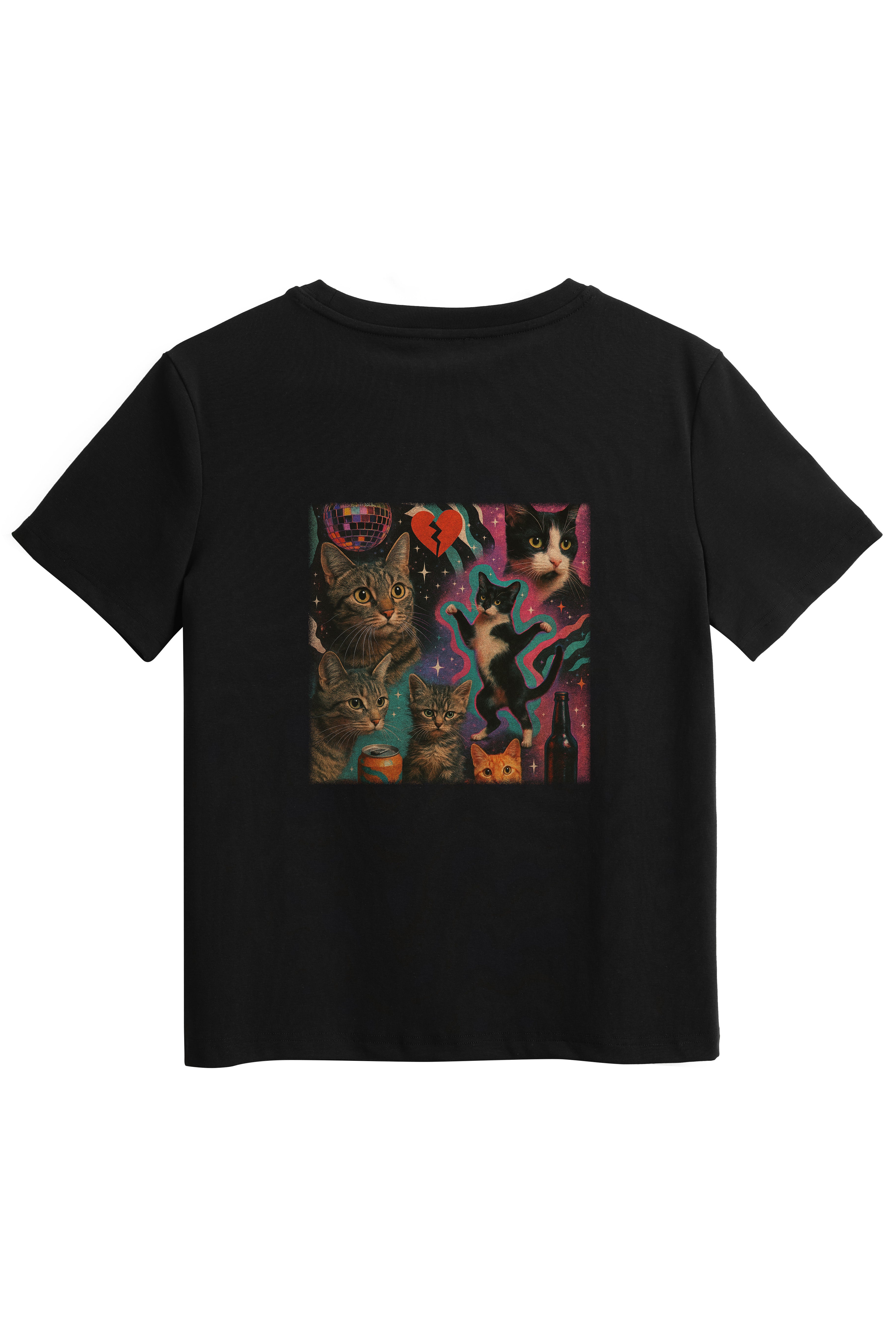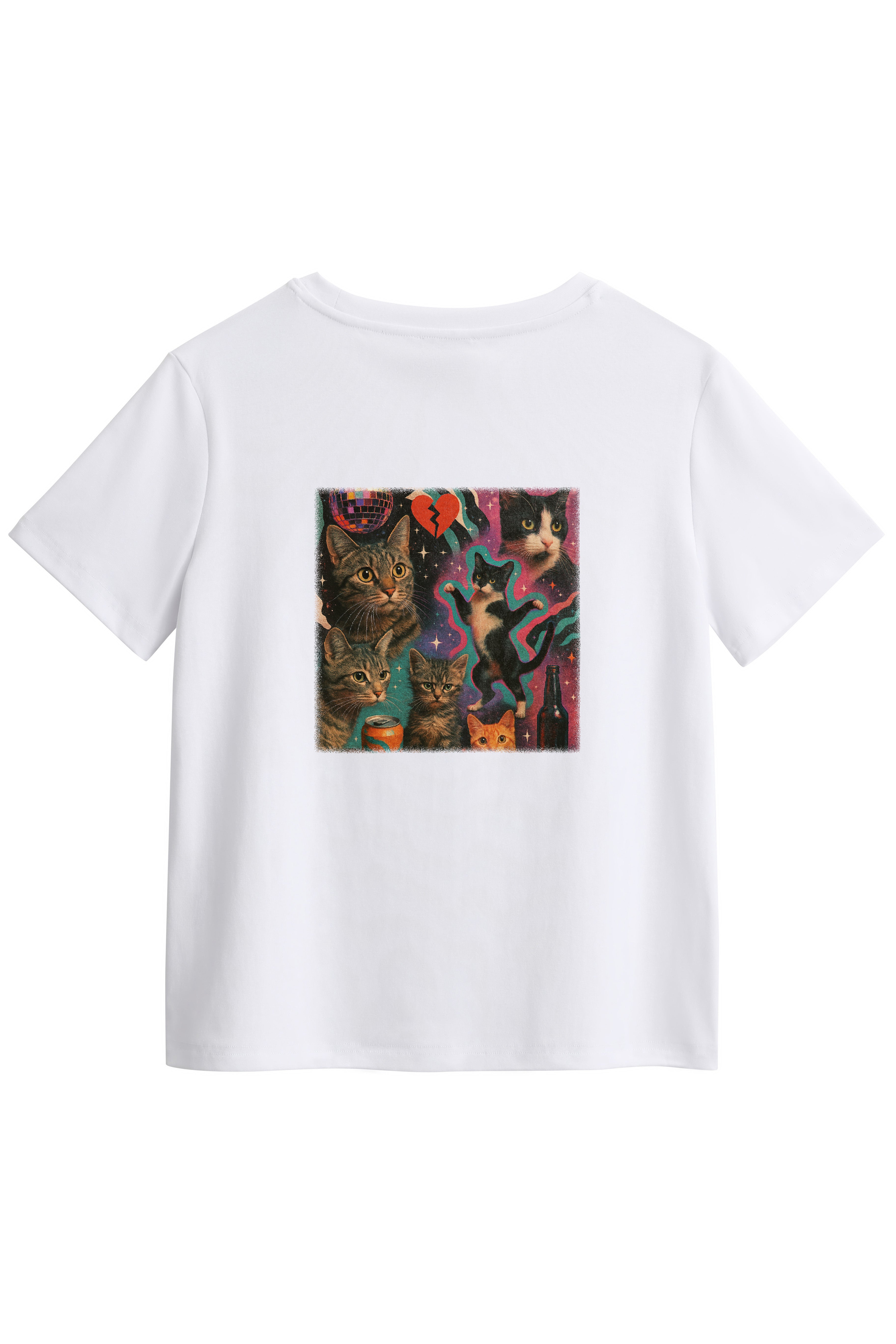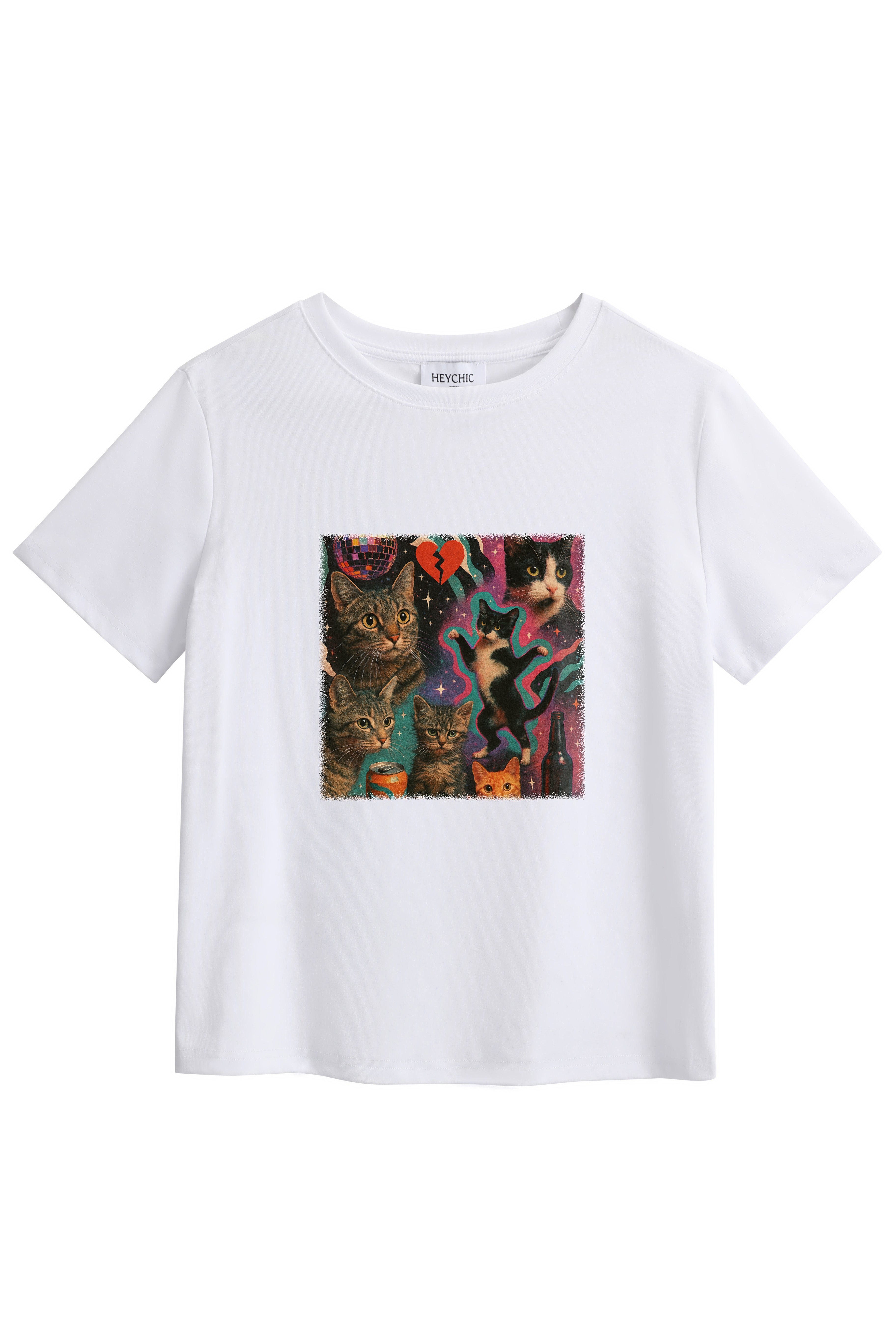 Express your individuality with our made-to-order printed T-shirt featuring the Disco Cats Party design. Crafted from a soft and stretchy cotton-spandex blend, this tee offers a Classic fit with a round neckline and hip-length hem - perfect for everyday comfort with a splash of fun. Firstly, choose from a white or black base colour, then choose the print position at the front or back. Each shirt is printed on demand, ensuring your chosen design stands out. Pair it with your fav denim jeans, skirts, or shorts for a casual-cool look that's uniquely yours.