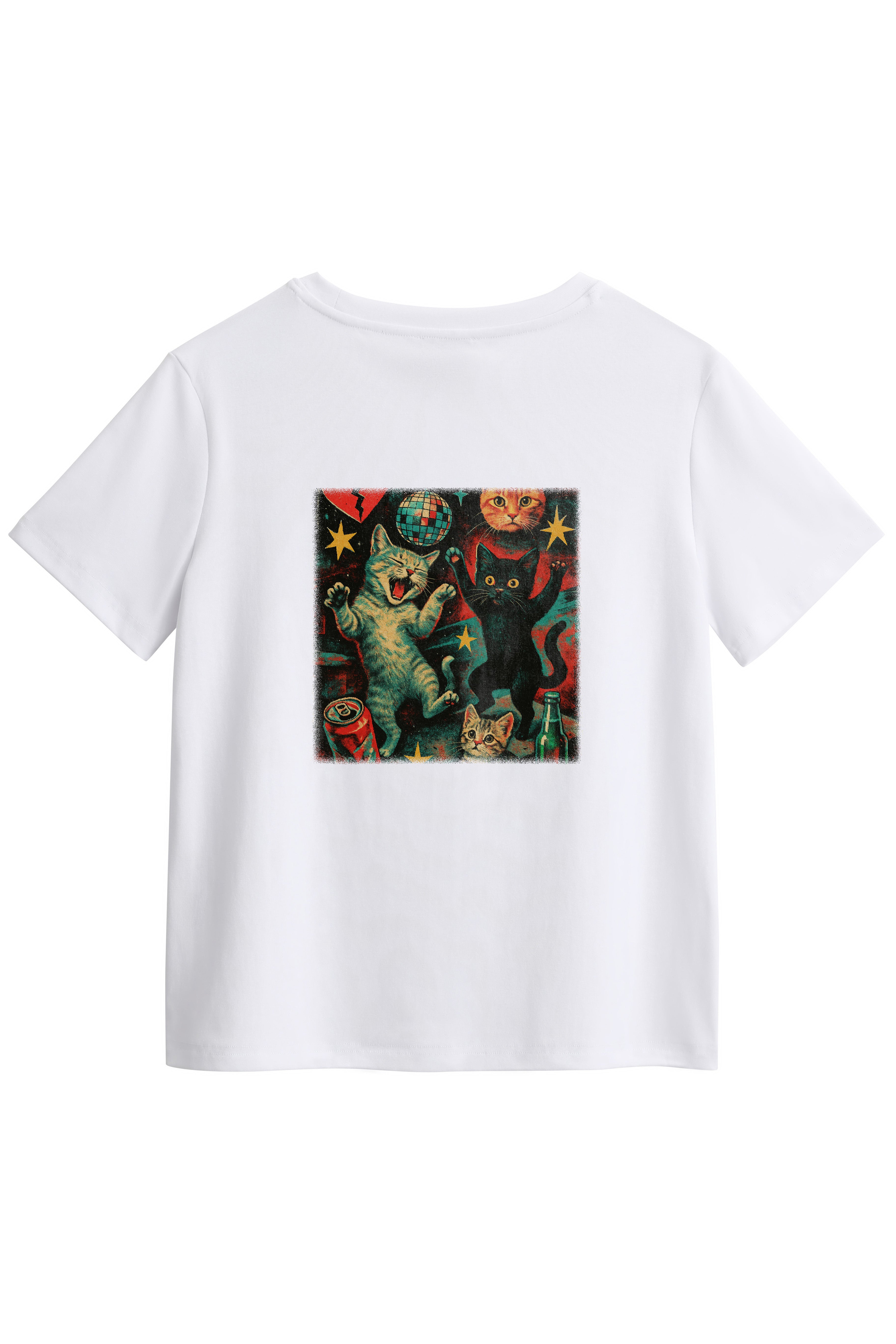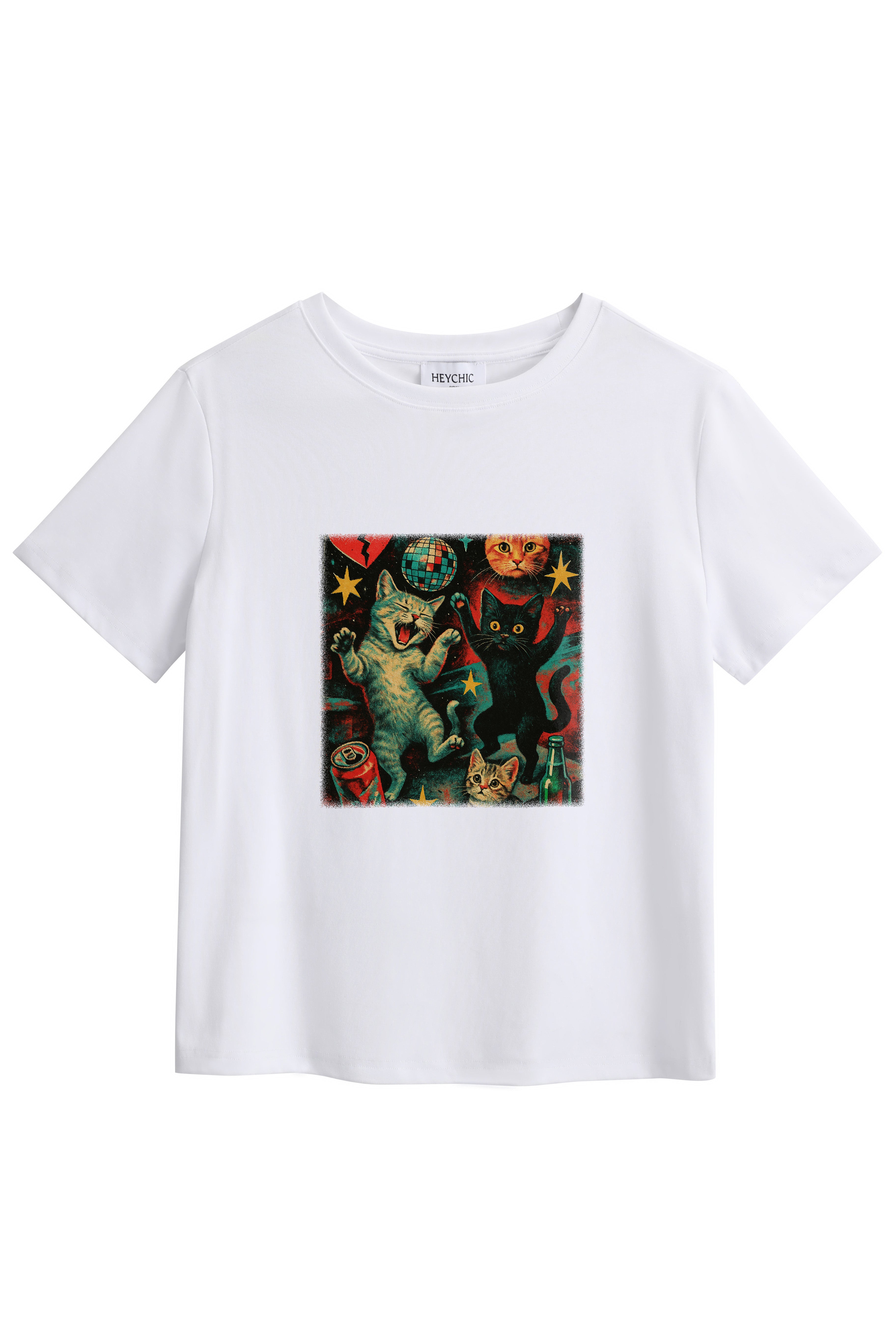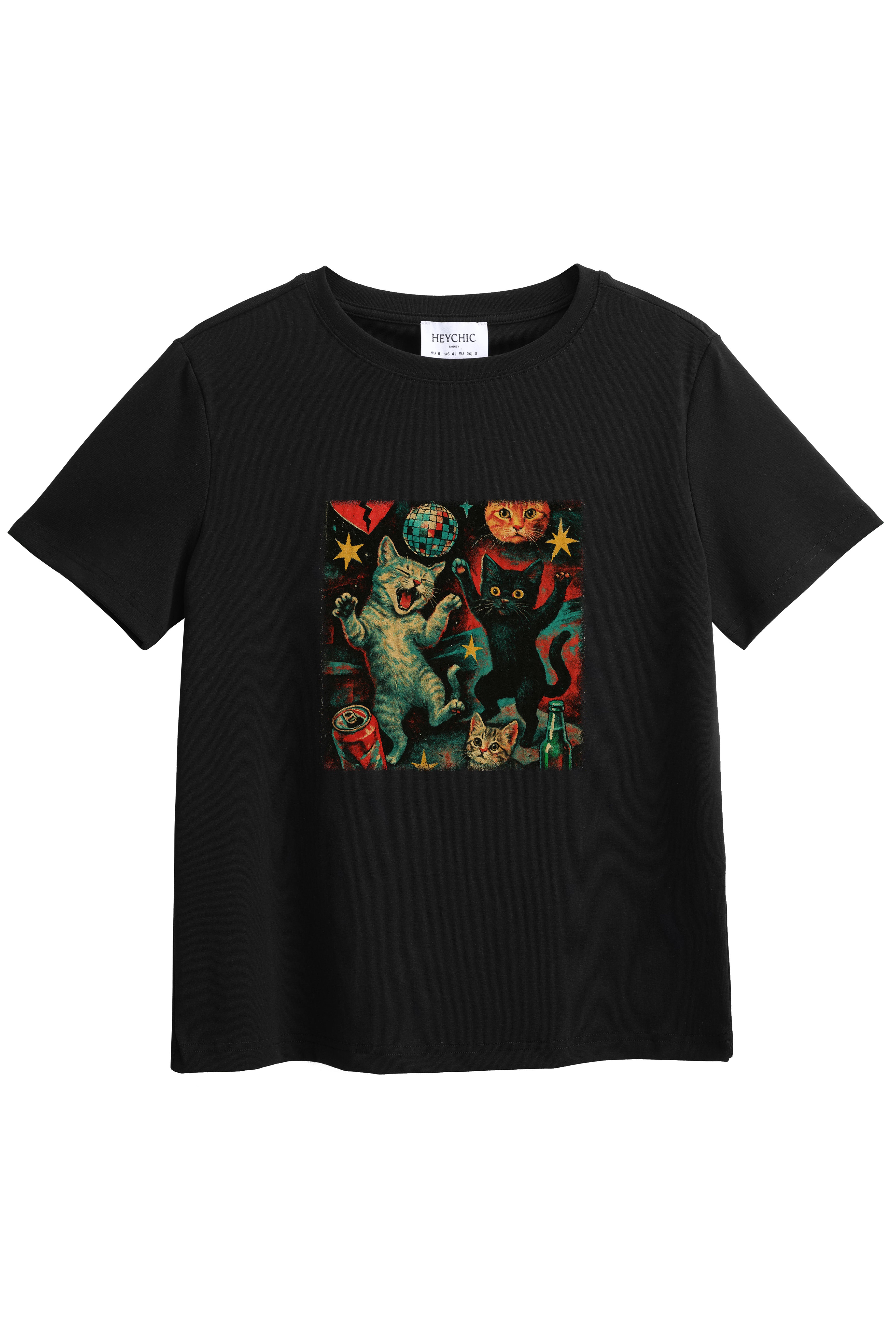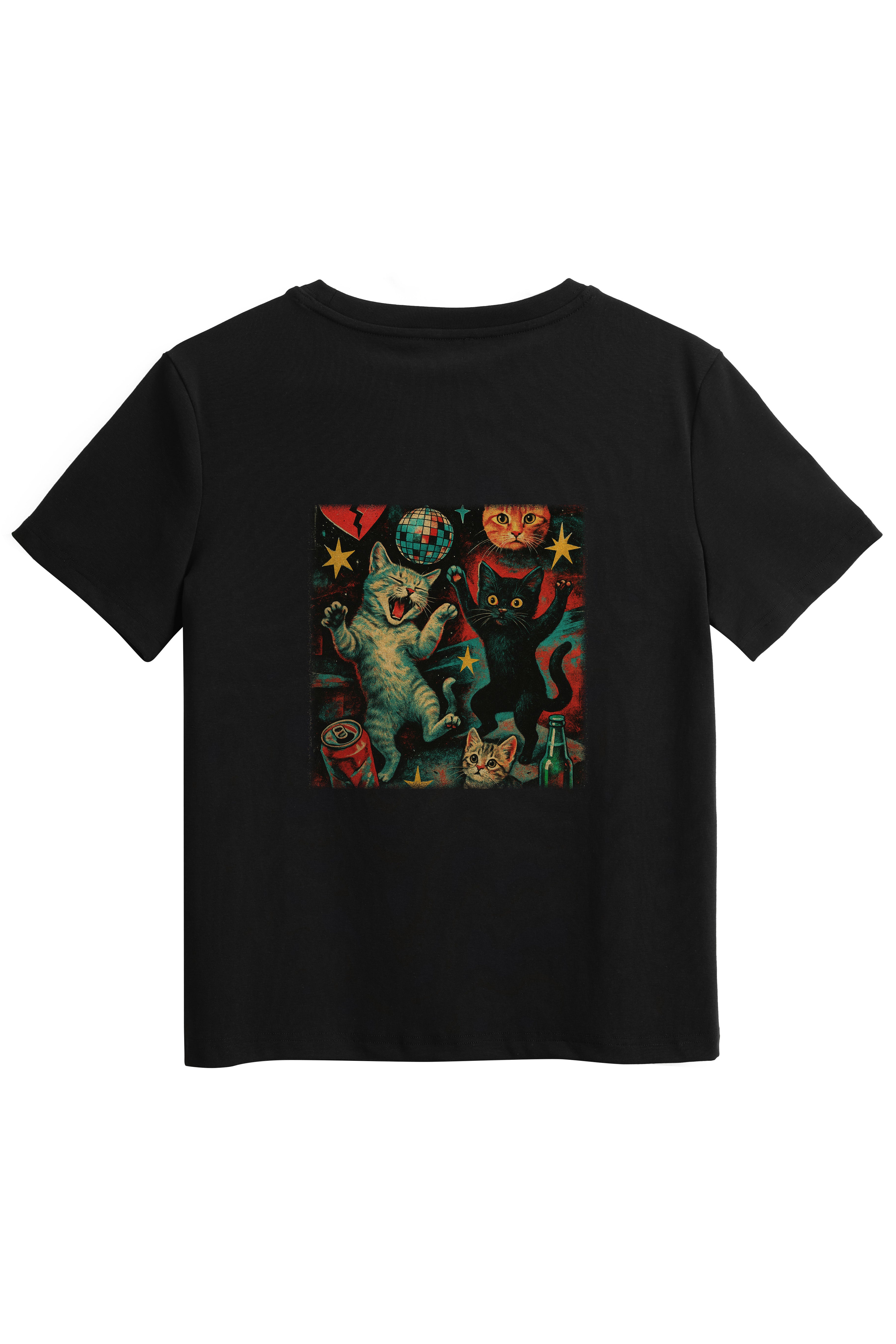 Express your individuality with our made-to-order printed T-shirt featuring the Disco Dancing Cats design. Crafted from a soft and stretchy cotton-spandex blend, this tee offers a Classic fit with a round neckline and hip-length hem - perfect for everyday comfort with a splash of fun. Firstly, choose from a white or black base colour, then choose the print position at the front or back. Each shirt is printed on demand, ensuring your chosen design stands out. Pair it with your fav denim jeans, skirts, or shorts for a casual-cool look that's uniquely yours.