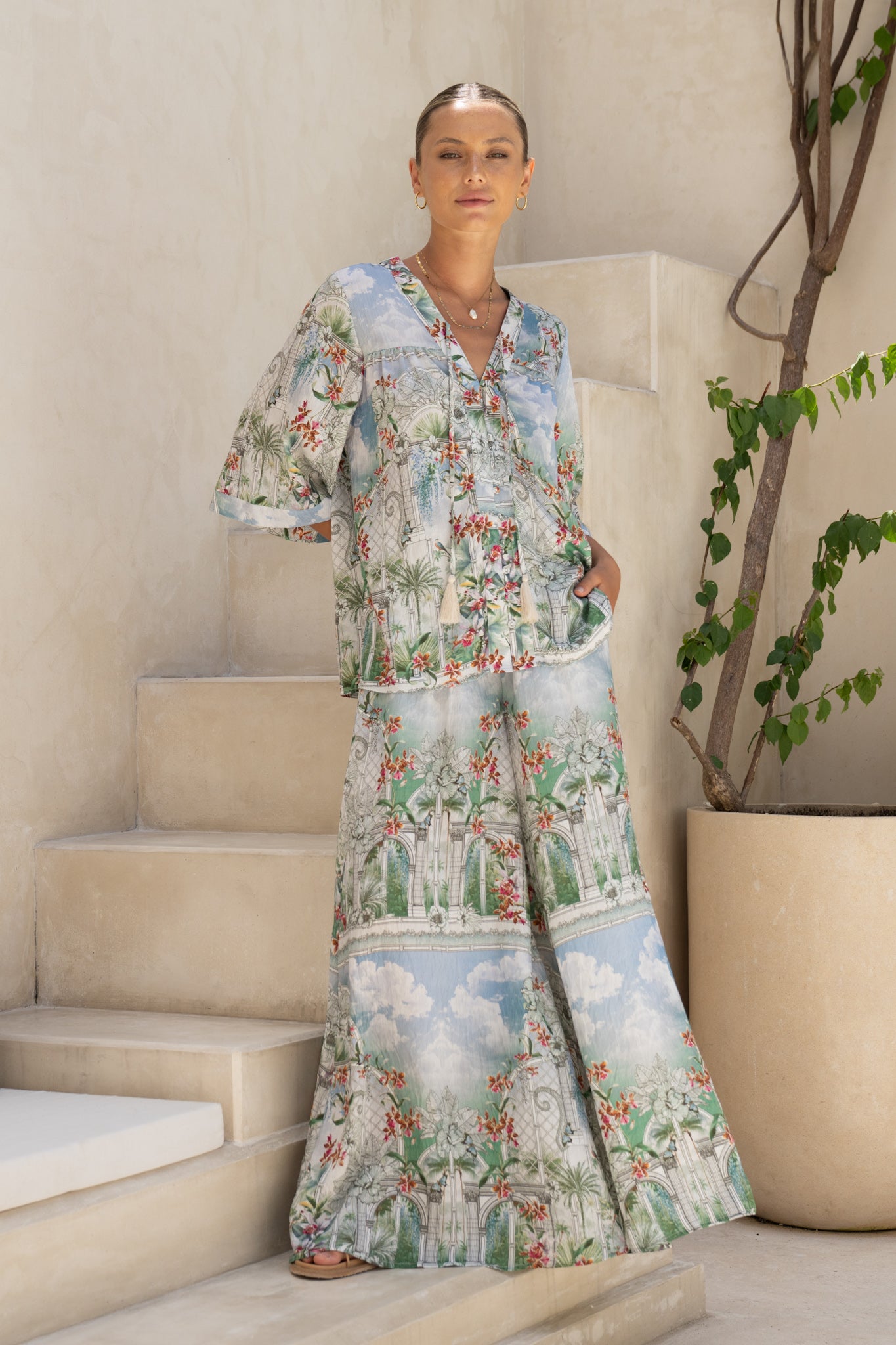 The cut? Relaxed and swishy. Sleeves skim the elbows with a soft kimono swing; the V-neck frames your jewellery stack; the button front (and cheeky tassel ties) let you style it your way. Tied at the waist, thrown open over a cami, or fully buttoned with a half-tuck into linen shorts. To be fair, it converts a plain outfit into “oh-hey-she’s-going-somewhere” in two seconds flat.