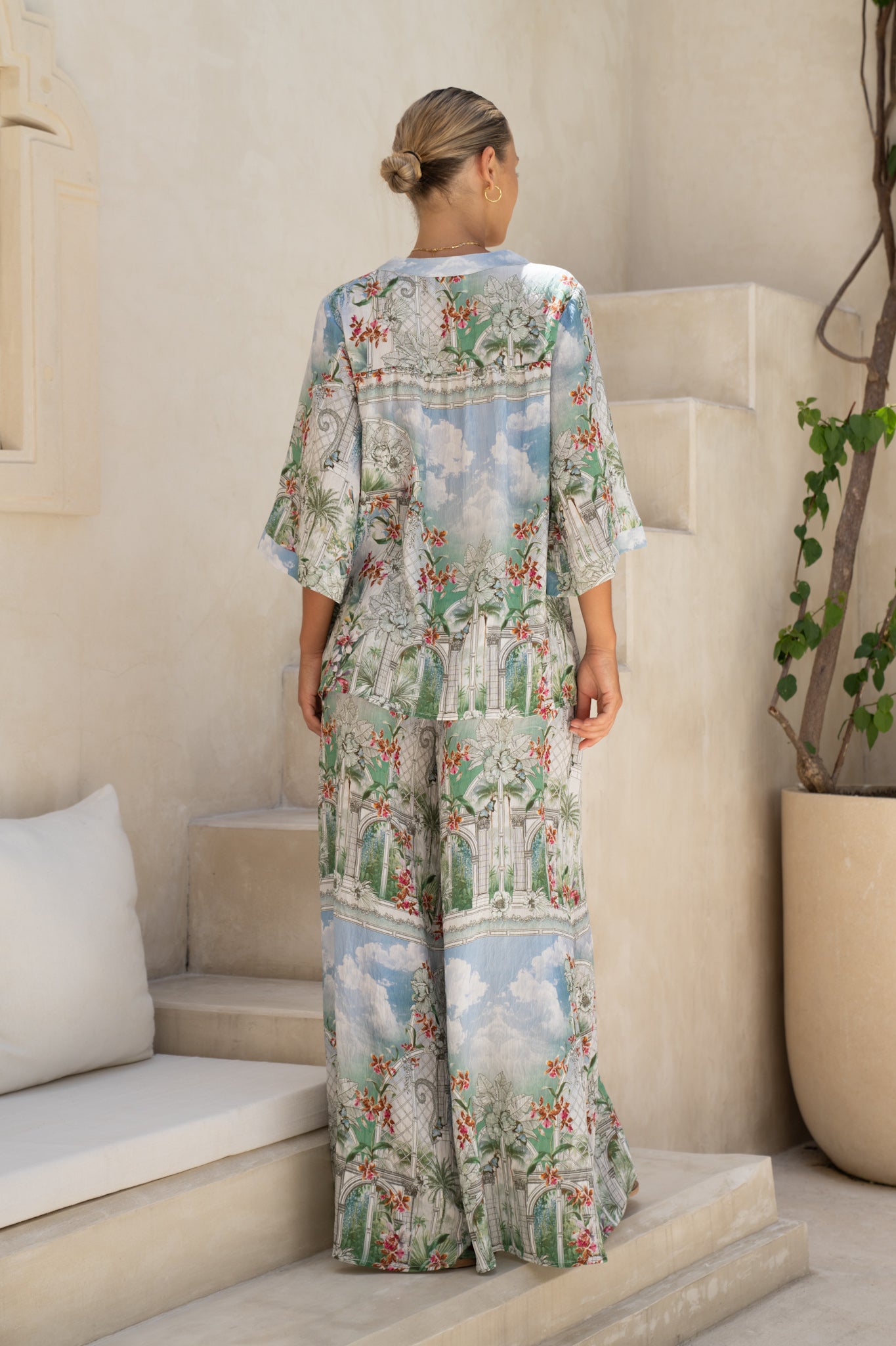 Meet the shirt that whispers “holiday” even when you’re just dashing to brunch. Elysara is light as a sigh, floaty in that effortless, coconut-breeze way, and printed with our exclusive green tropical artwork. Imagine an old-world glasshouse tangled with palms and orchids. It’s romantic without trying too hard. It’s kind of a mood.