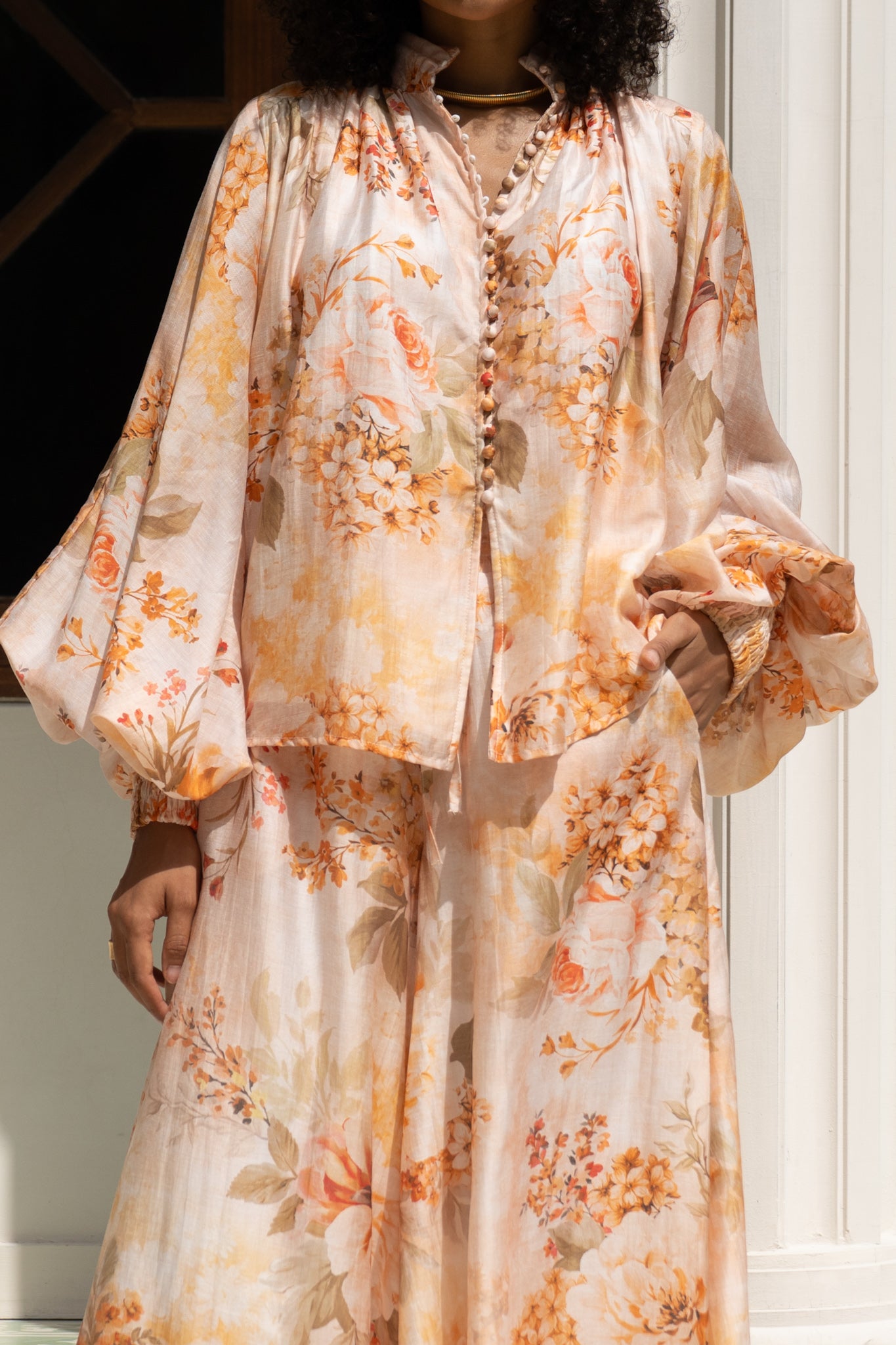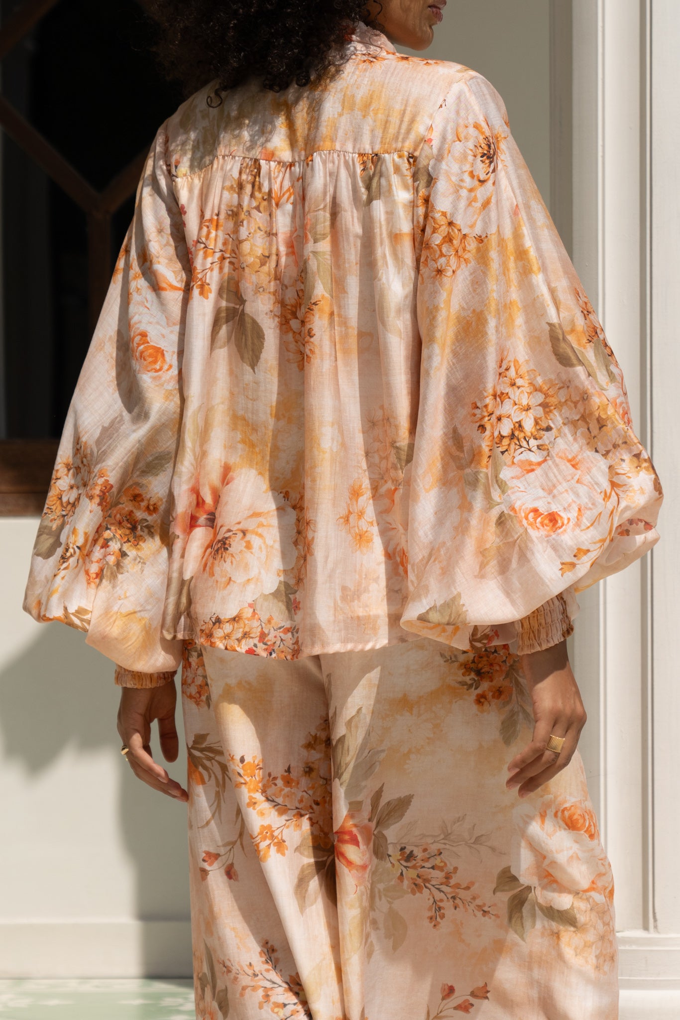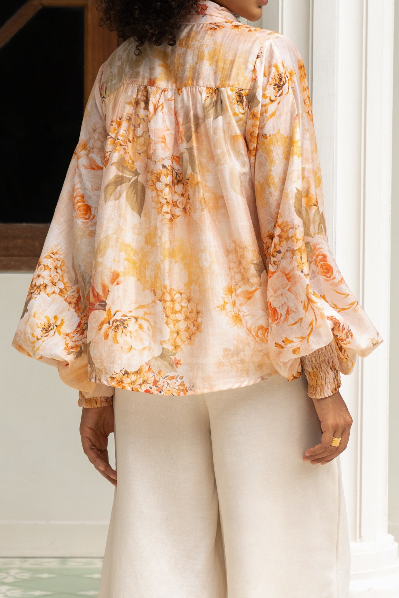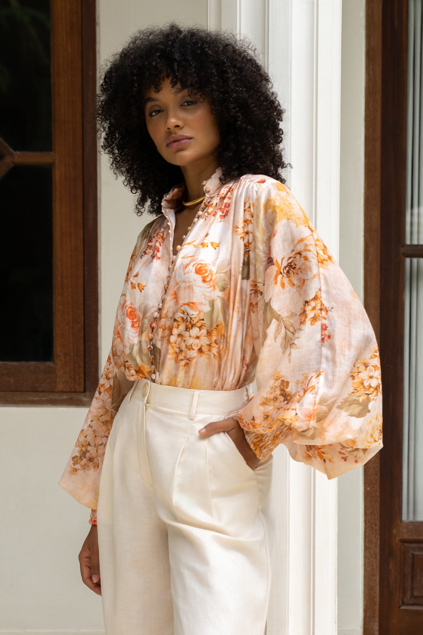 Fiorenza Orange Floral Button Balloon Sleeve Blouse