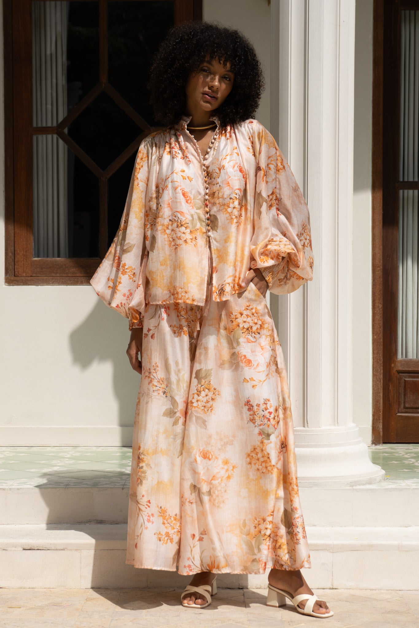 Whisper-light and wildly romantic, this blouse doesn’t just drape, it dances. The pleated mandarin collar adds a hint of vintage hauteur, while those covered buttons? A dream. Not fussy, just thoughtful. Sleeves billow just enough to feel like you’ve wandered out of an old Italian painting, cinched at the wrist with soft shirring that lends a delicate finish. And the fabric? Breezy, feather-soft, and made to move (preferably through a sun-drenched piazza or your local café. We don’t judge). It’s the kind of piece that makes an entrance without ever trying to. Pair it with wide-leg trousers, floaty skirts, or even denim. It’s fluid, it’s feminine, and honestly, a little magic.