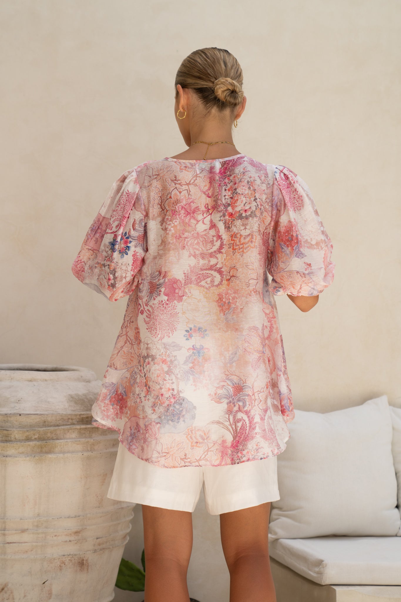 Meet Gezelle - the blouse that floats in, steals the show, and refuses to try too hard about it. She’s got that painterly pink collage of blooms and shells (a little vintage scarf, a little vacation postcard), puffed sleeves that billow just so, and a line of dainty buttons that say “I’m polished,” even when you’re pairing her with cut-offs and sandals.