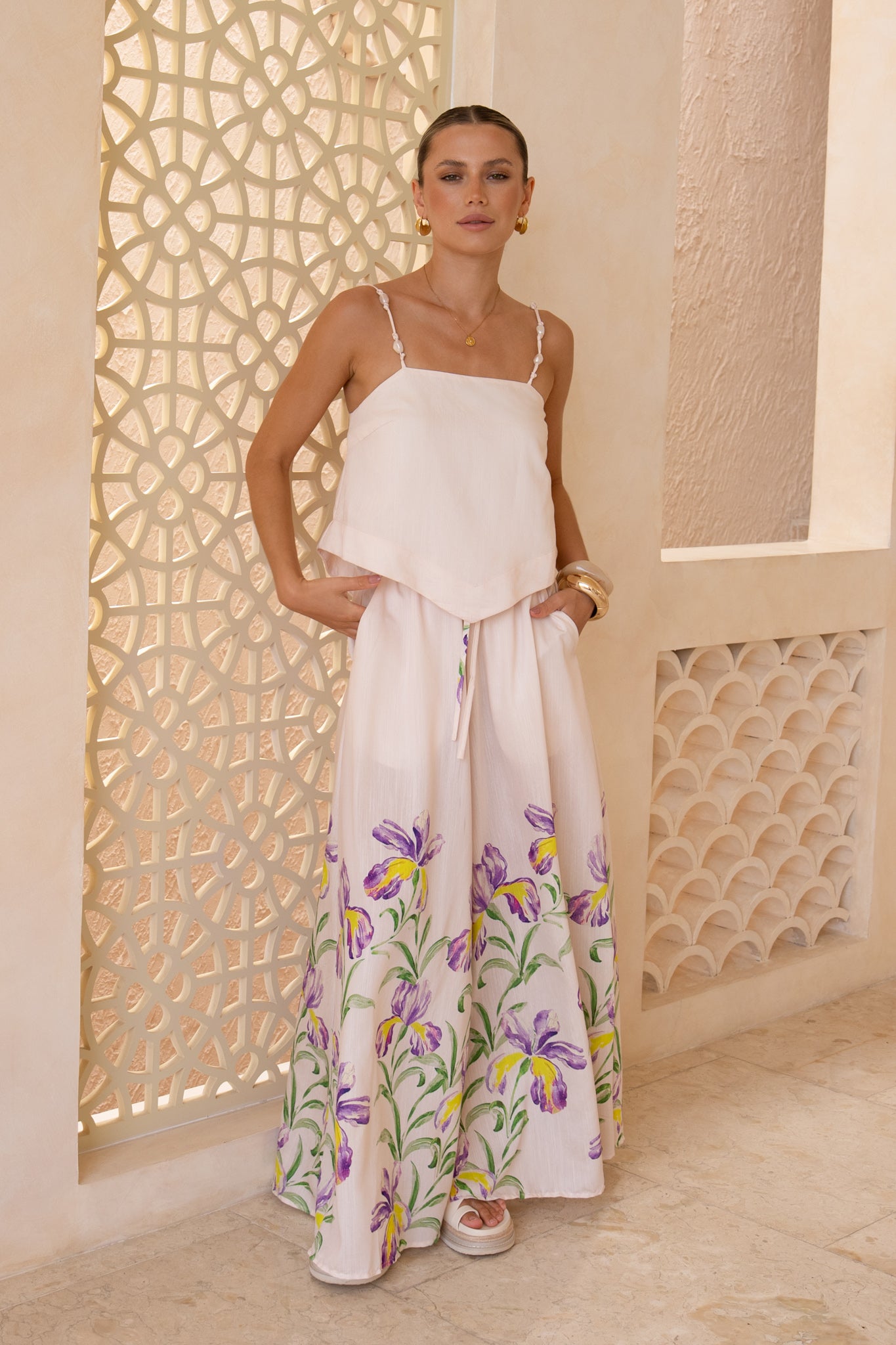 The Hannelle Beige Cami Top is deliberately clean and pared-back, which means it plays the perfect supporting role when you style it with the matching Hannelle purple floral pants. The result? A very chic optical trick where the print feels like it’s floating at the hem of your outfit, like a little secret you didn’t need to explain.