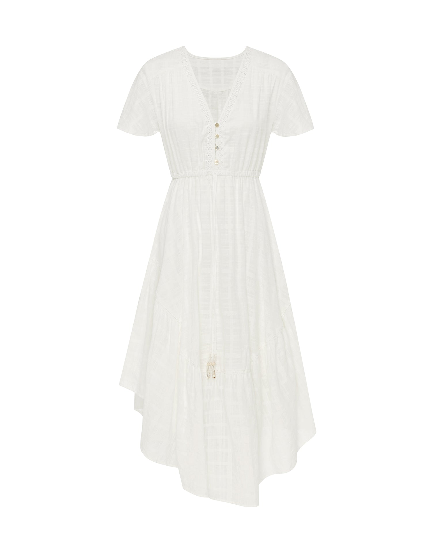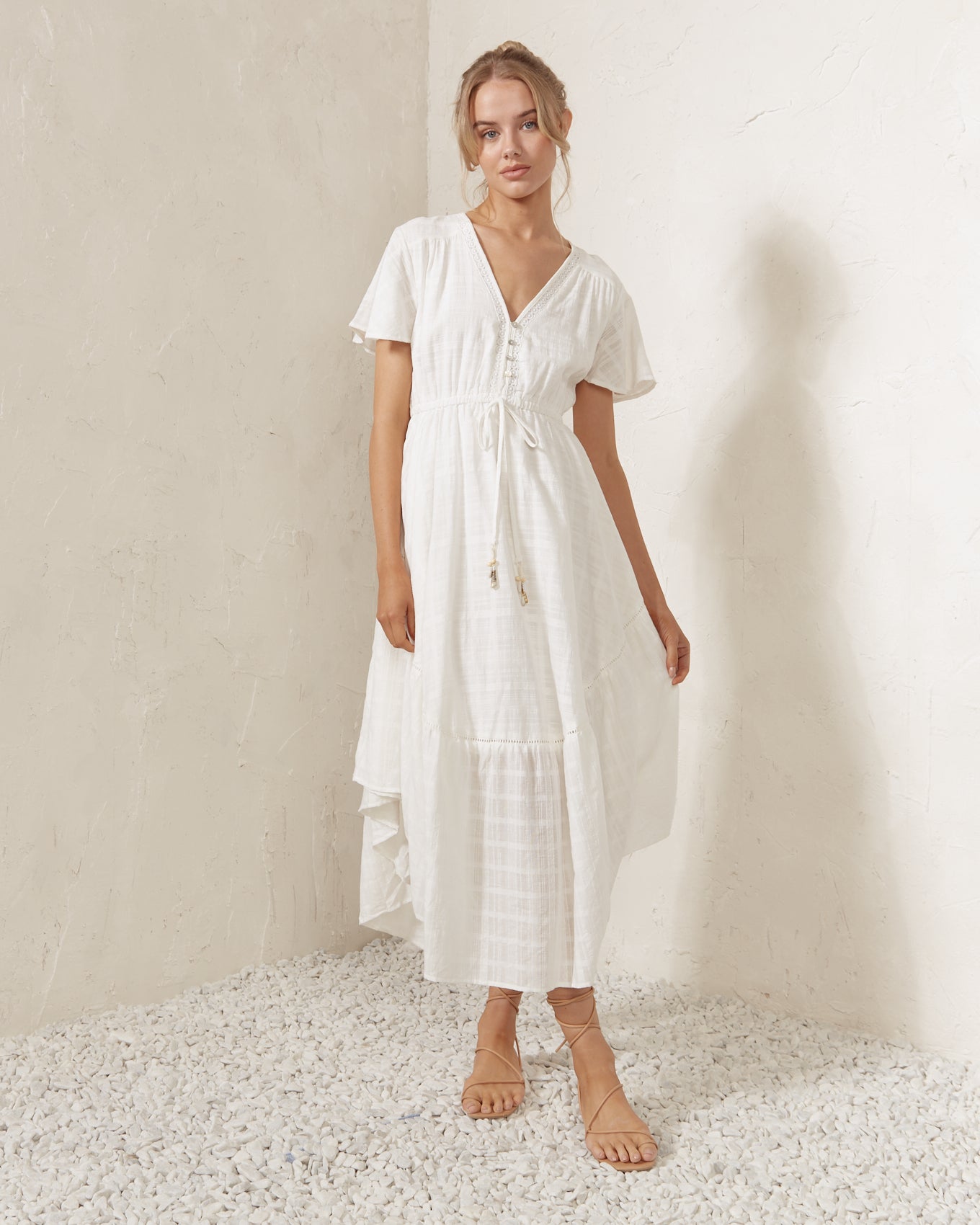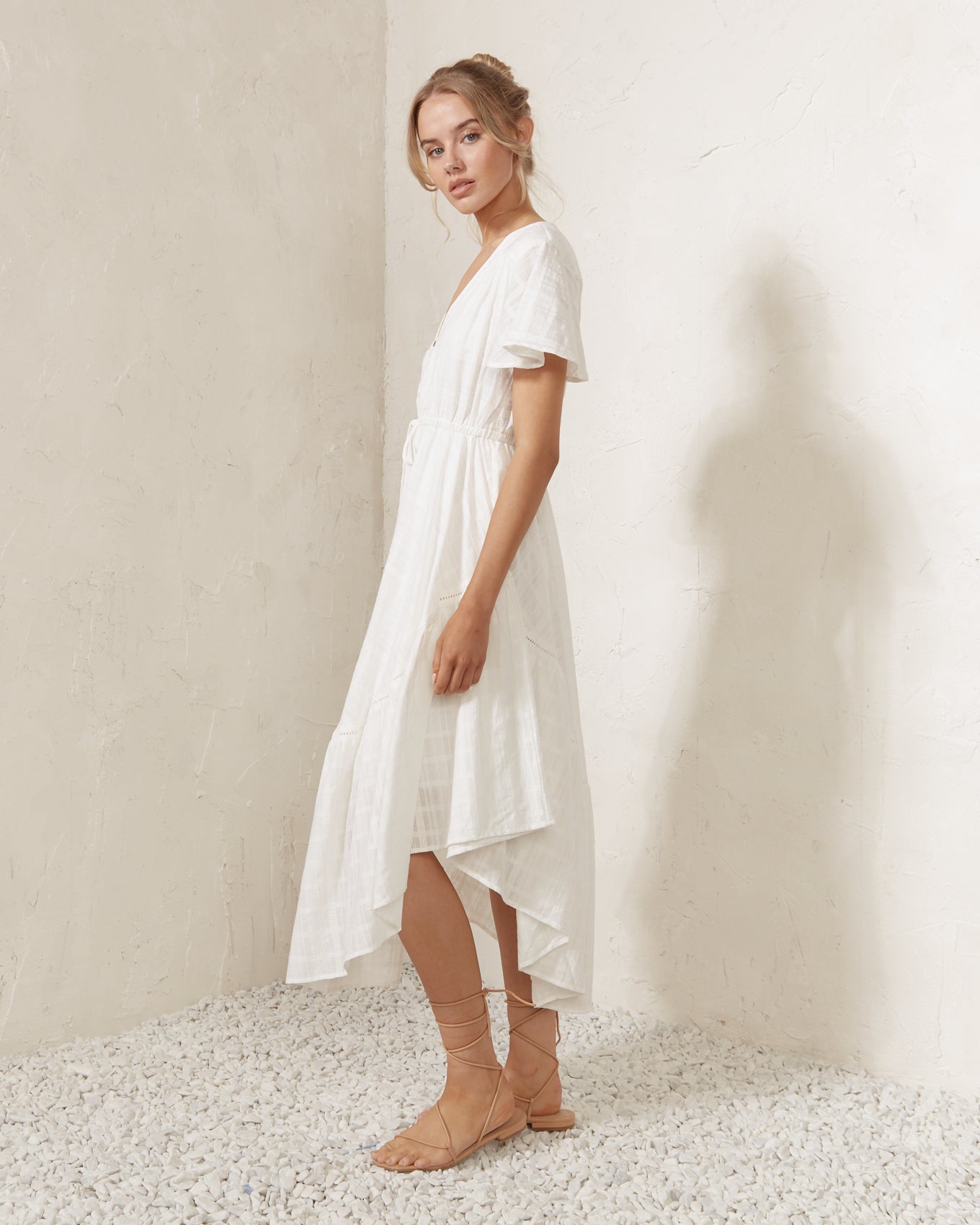 Dress to impress in our Ina dress! With a v-neckline, button down front and tie front, this dress is sure to turn heads. Short sleeves and an elasticated waistband make it comfortable and flattering, while the U shaped hem provides a touch of drama. Midi length makes it perfect for any occasion.