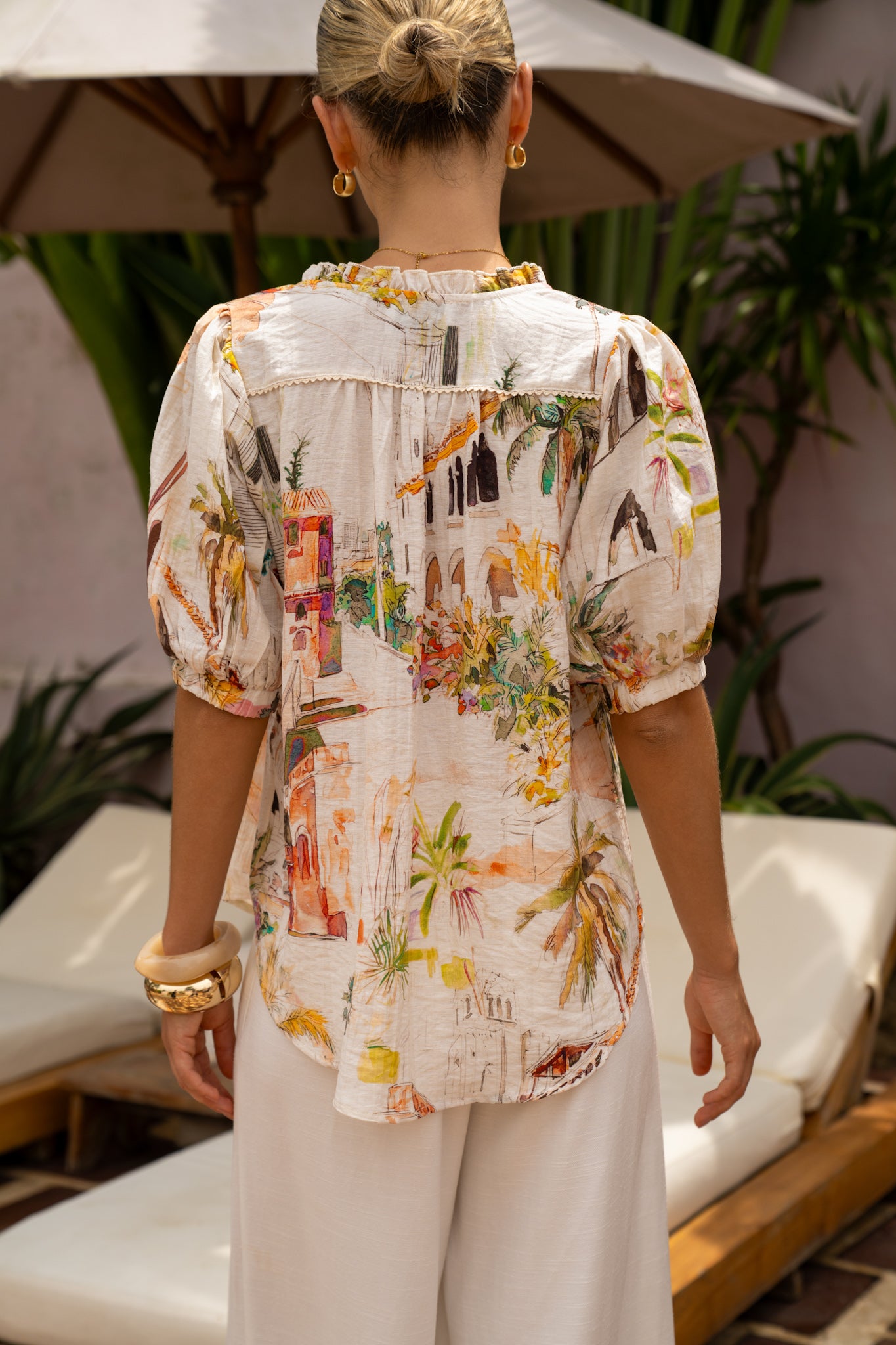 This blouse feels like a postcard you accidentally turned into an outfit.