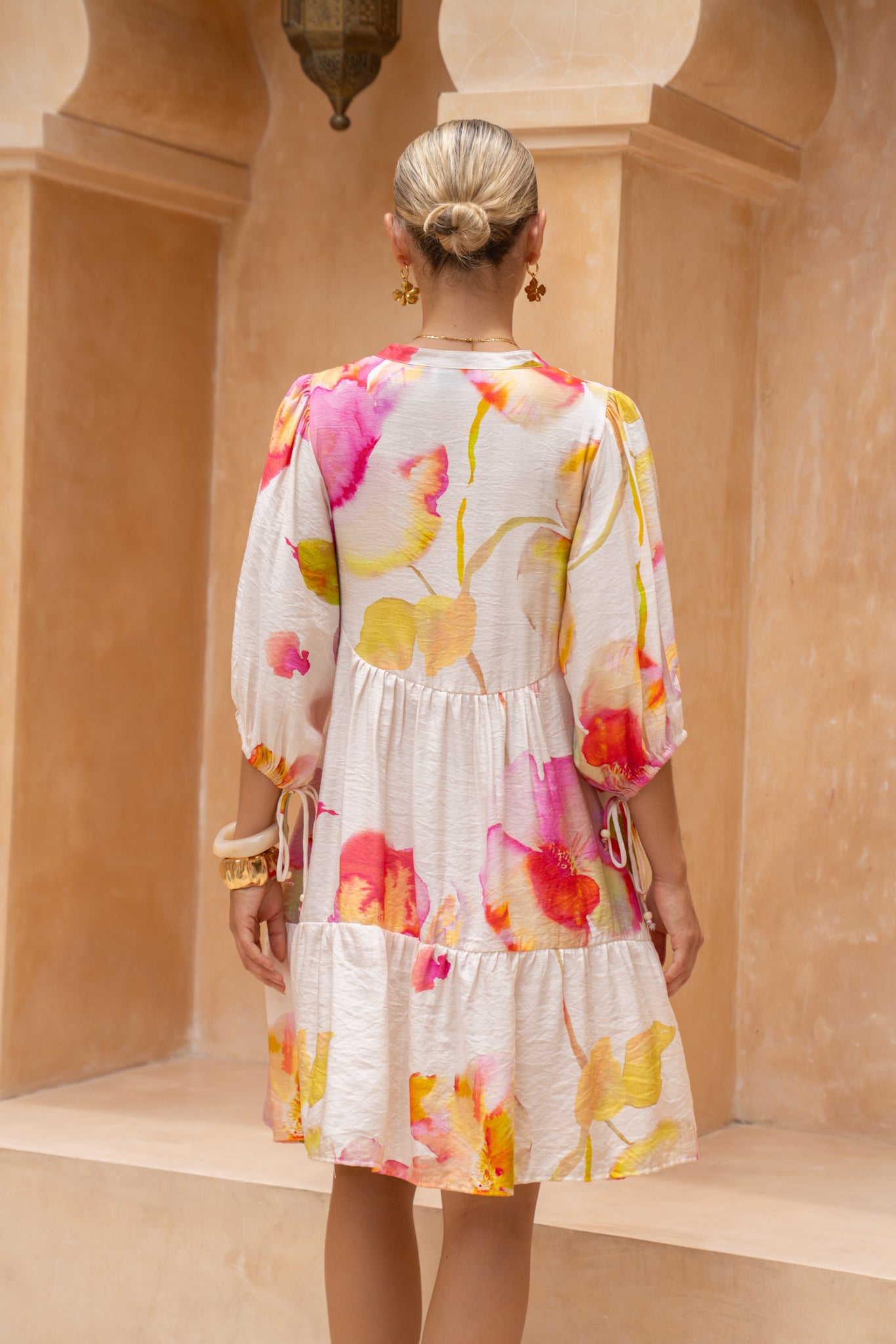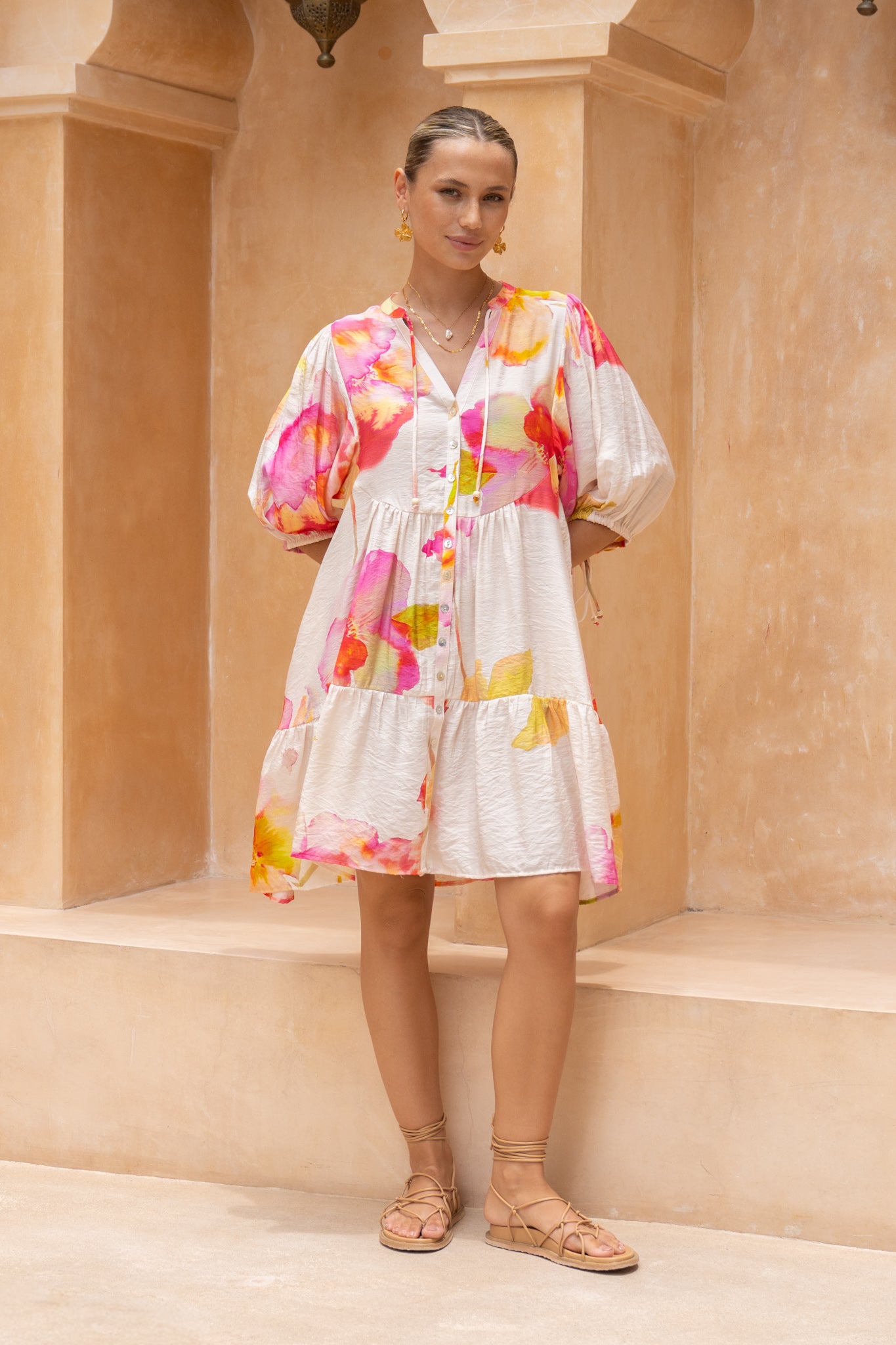 Light, floaty and made for sun-soaked days, this button-down mini brings that effortless “just threw this on” energy we all love. The soft pink watercolour florals feel dreamy and romantic, while the relaxed tiered skirt adds the perfect swish with every step.