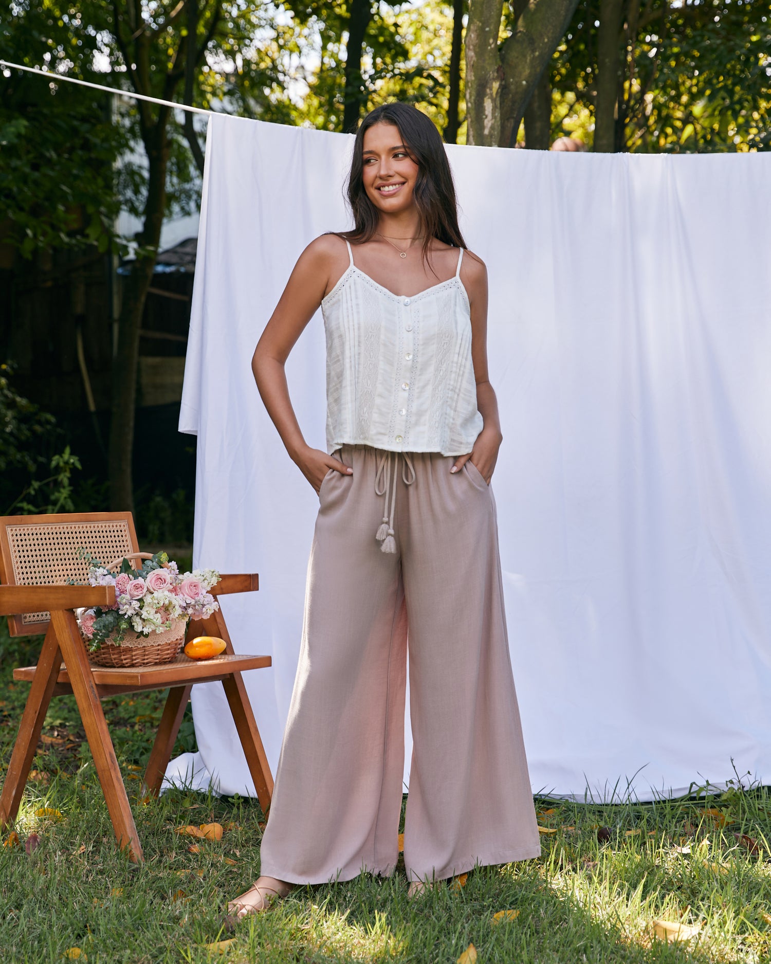 Crafted with comfortable cotton, the Jasmine top features a button down front, adjustable spaghetti straps and stunning lace detail throughout.