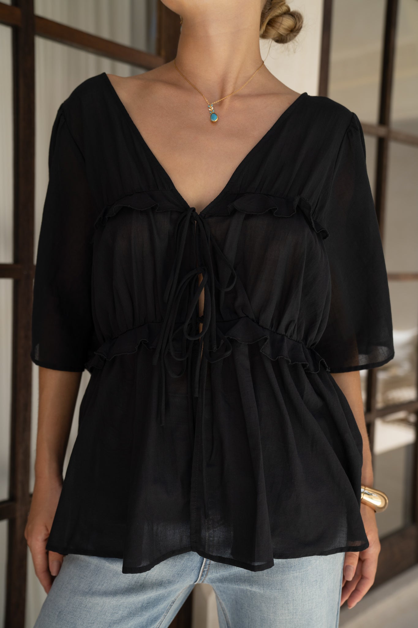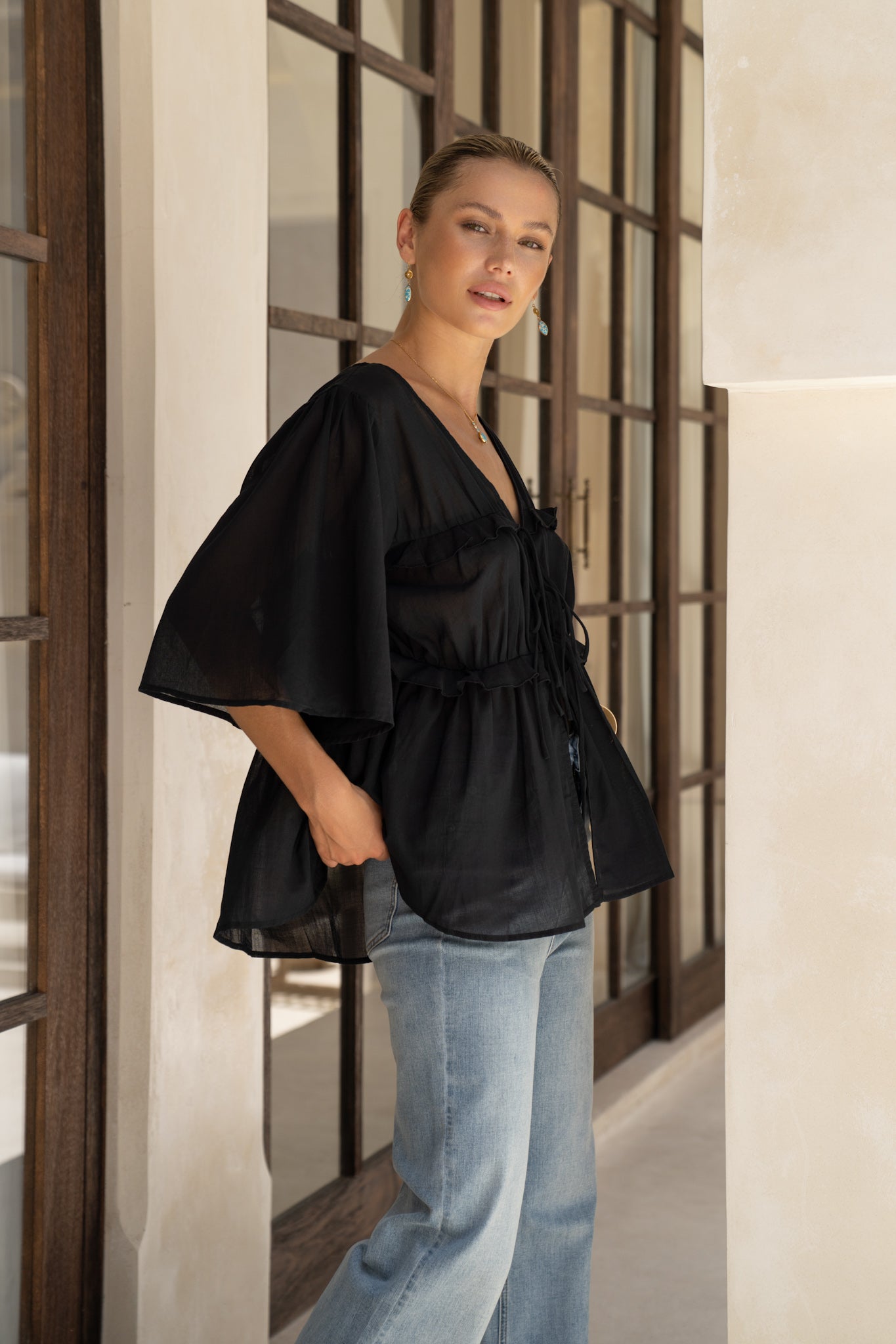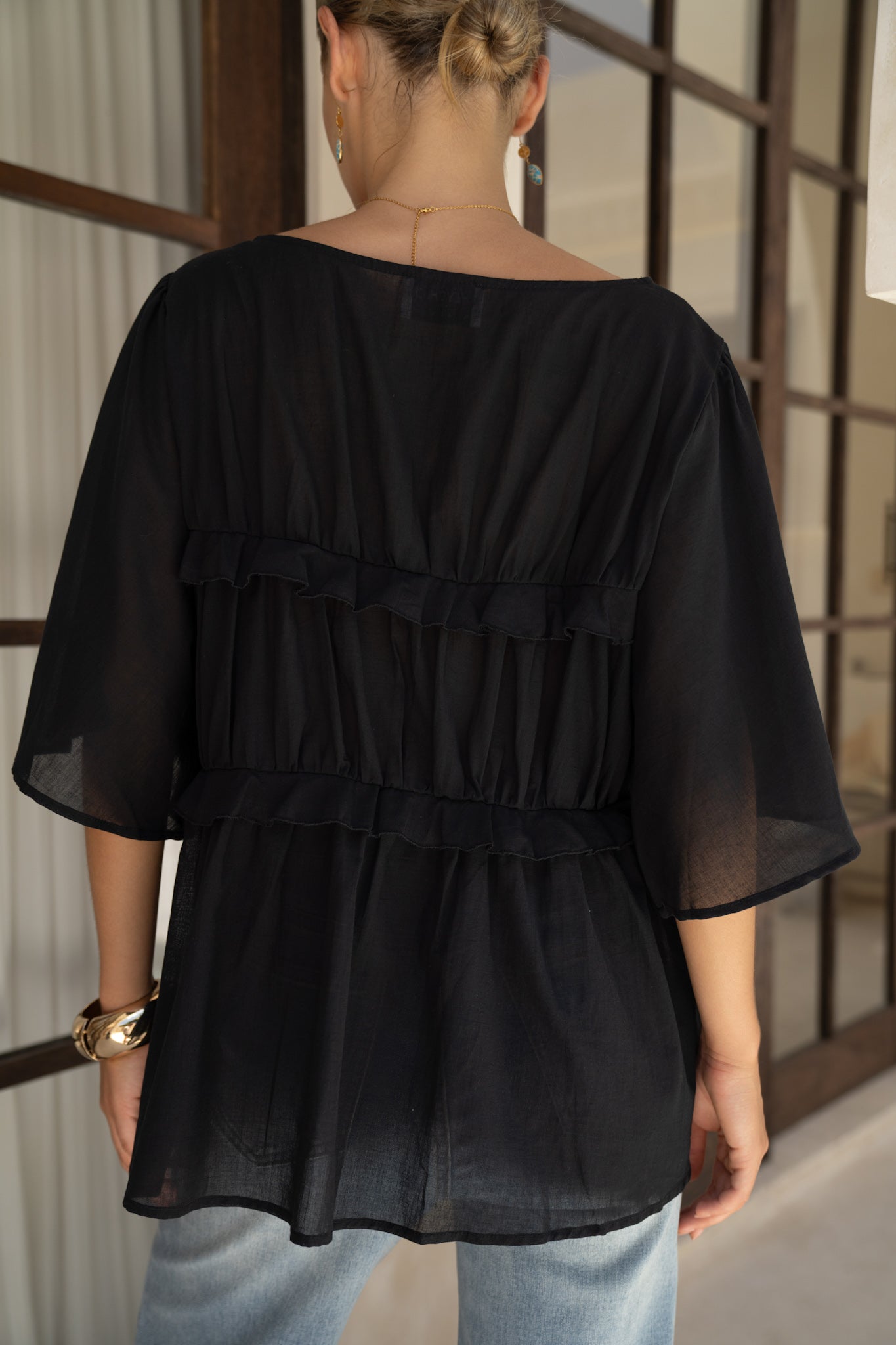 This isn’t your average black blouse. Oh, no. It’s a study in contrasts. Part sun-drenched bohemian, part city-slick minimalist. Crafted from the kind of light-as-air cotton that just gets what a warm day needs, it moves with a quiet confidence. Those flared sleeves? They're pure romance, catching the breeze and adding a soft drama that feels effortless.