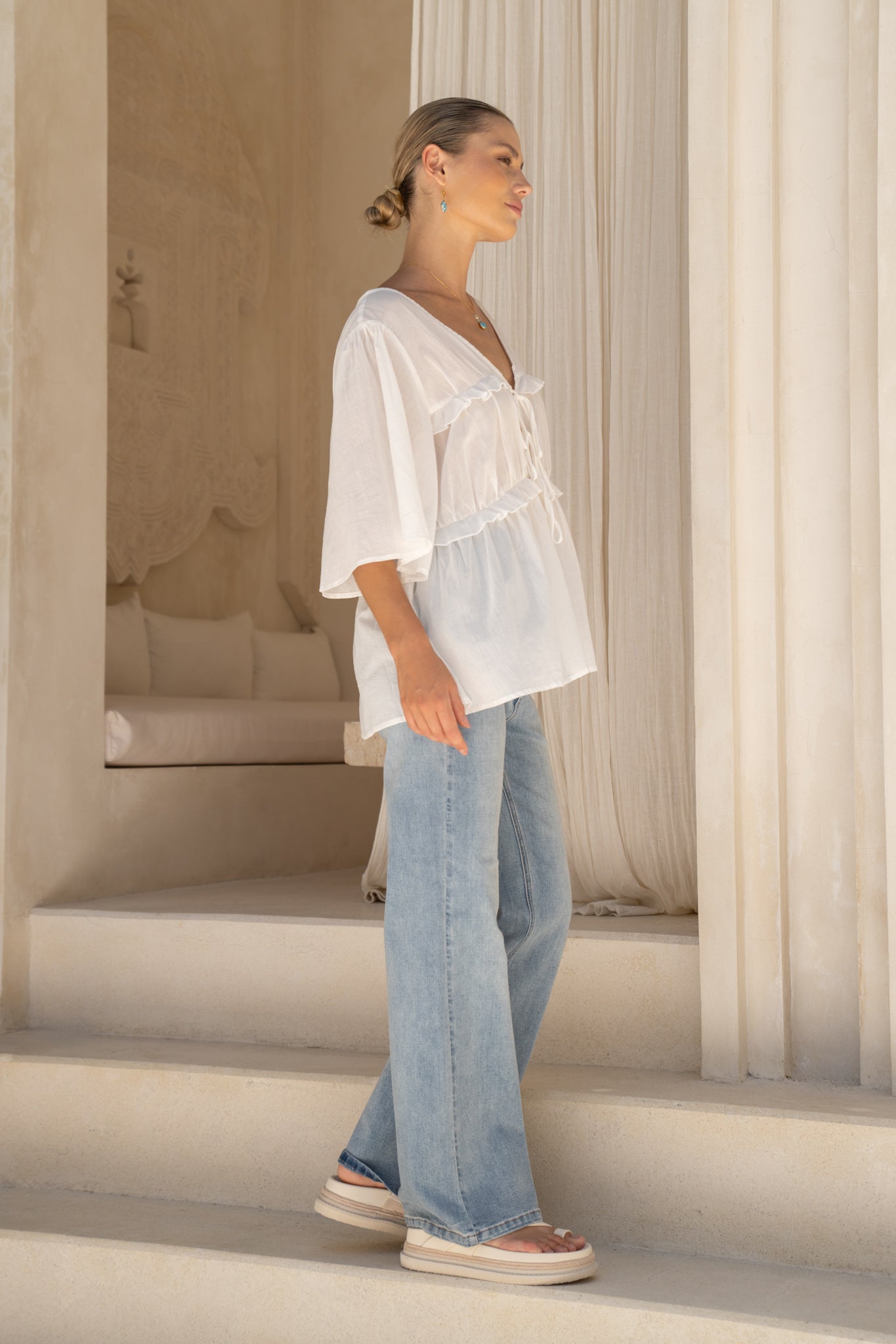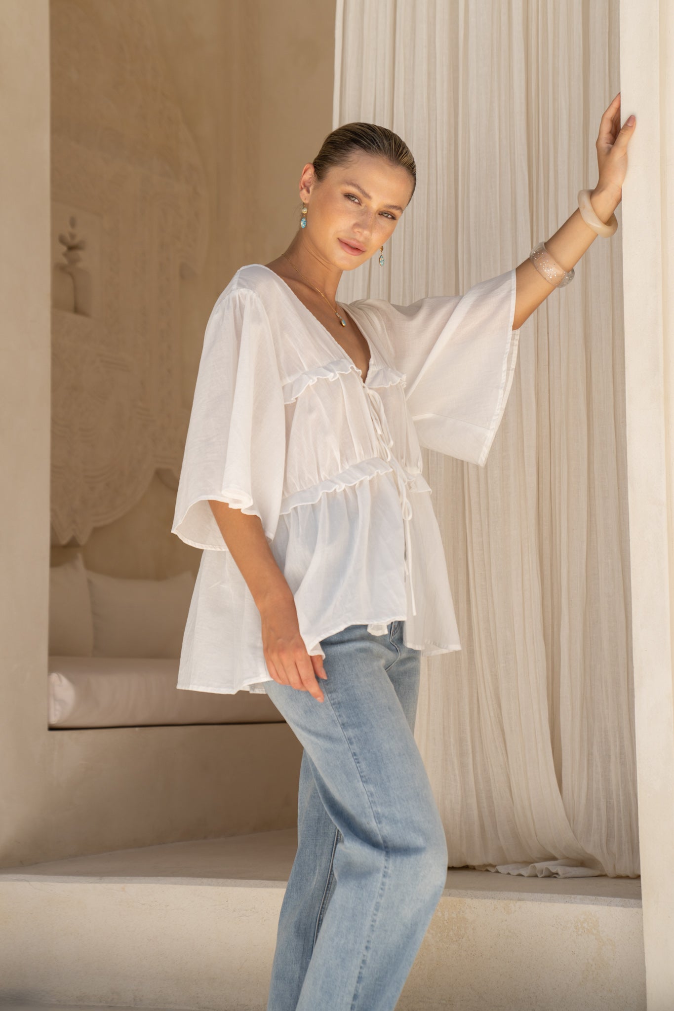 The flared sleeves have this certain angelic quality, adding a soft, floaty movement with every gesture. Then there's that sun-seeking V-neck, framed with the most delicate frill and finished with a playful tie-front detail. Wear it loose and undone for a relaxed vibe, or tie it up for a touch more definition. It’s your story to tell.