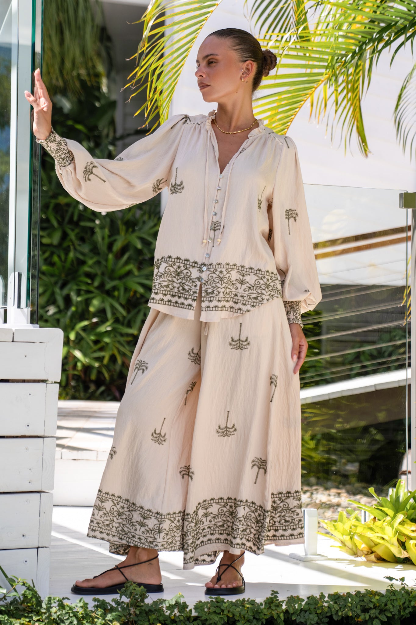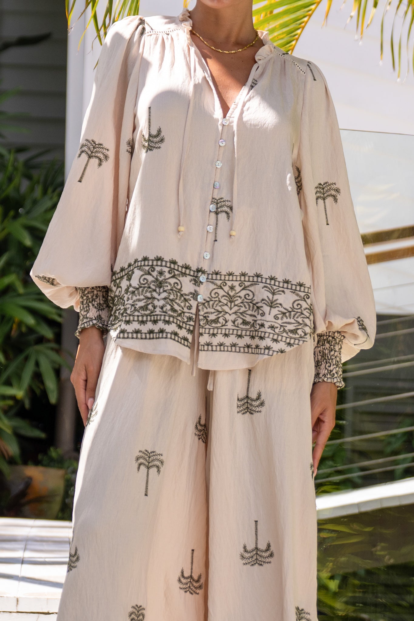 Kaena Beige Green Tropical Embroidered Balloon Sleeve Blouse