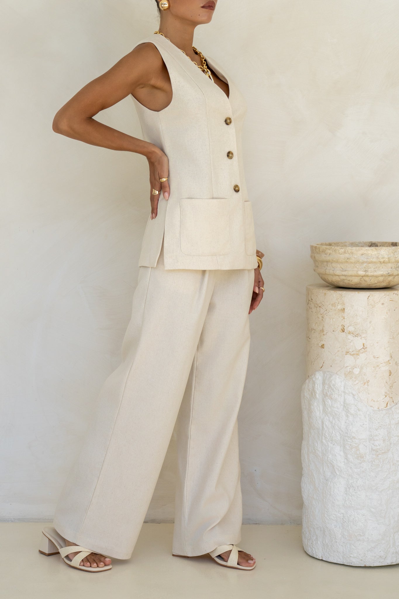 There's something effortlessly cool about the Keke Vest. Maybe it's the soft beige tone that goes with just about anything, or the way the linen-blend fabric drapes just right. It’s sleeveless, with a sharp V-neck and a row of buttons down the front—simple details that make all the difference. Two front pockets give it a laid-back feel, while the slight flare at the hem adds a hint of shape. Whether you're throwing it over jeans or pairing it with tailored pants, this vest just works. Not too dressy, not too casual—just right.