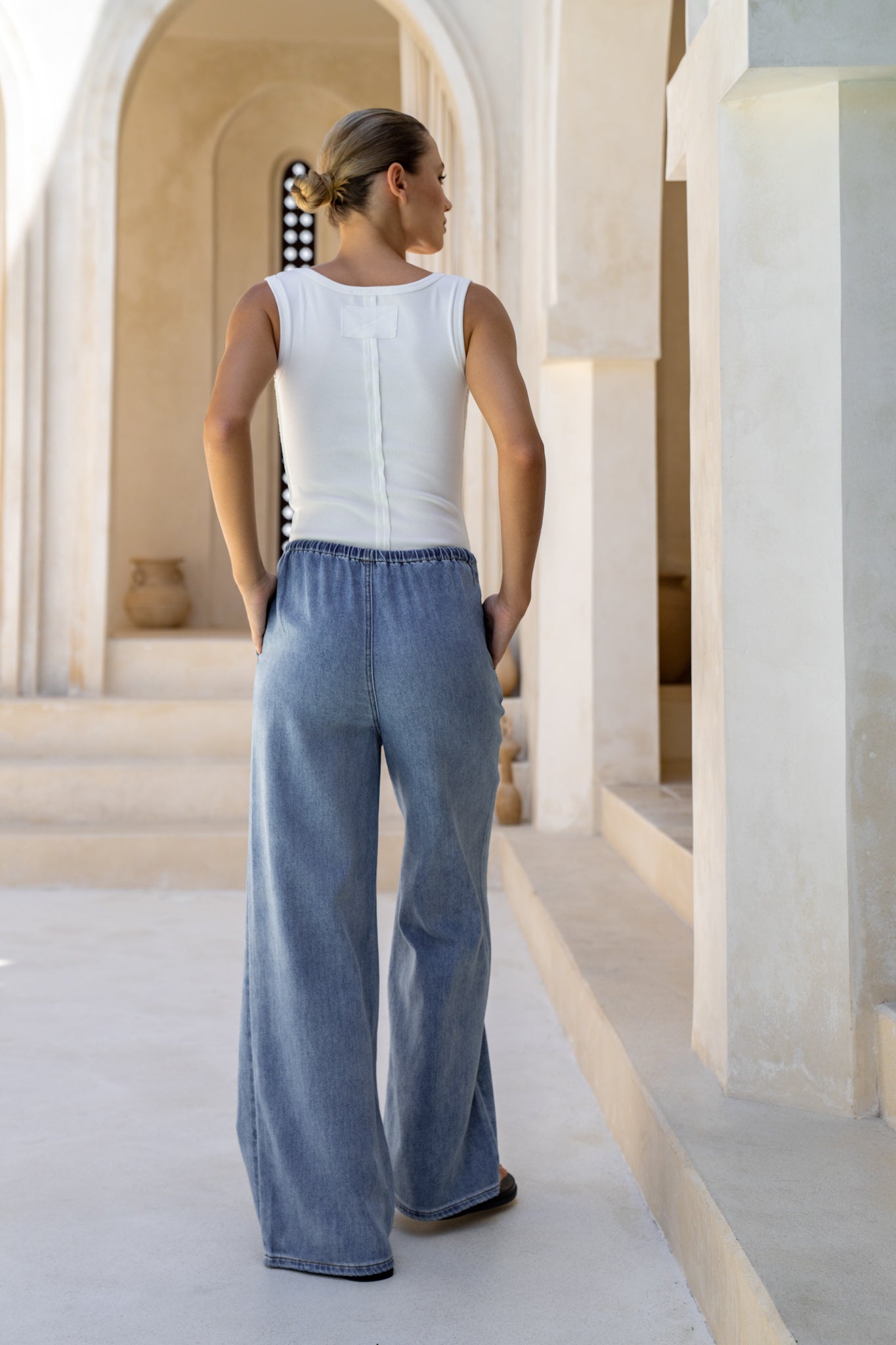 The waistband? A soft elastic rise with drawstring, cinch when you want, loosen after tacos. The silhouette drops into a fluid, floor-skimming leg that swishes when you walk and somehow makes flip-flops look editorial. Honest moment: once you try pull-on denim that actually looks tailored, going back to stiff waistbands feels… medieval.
