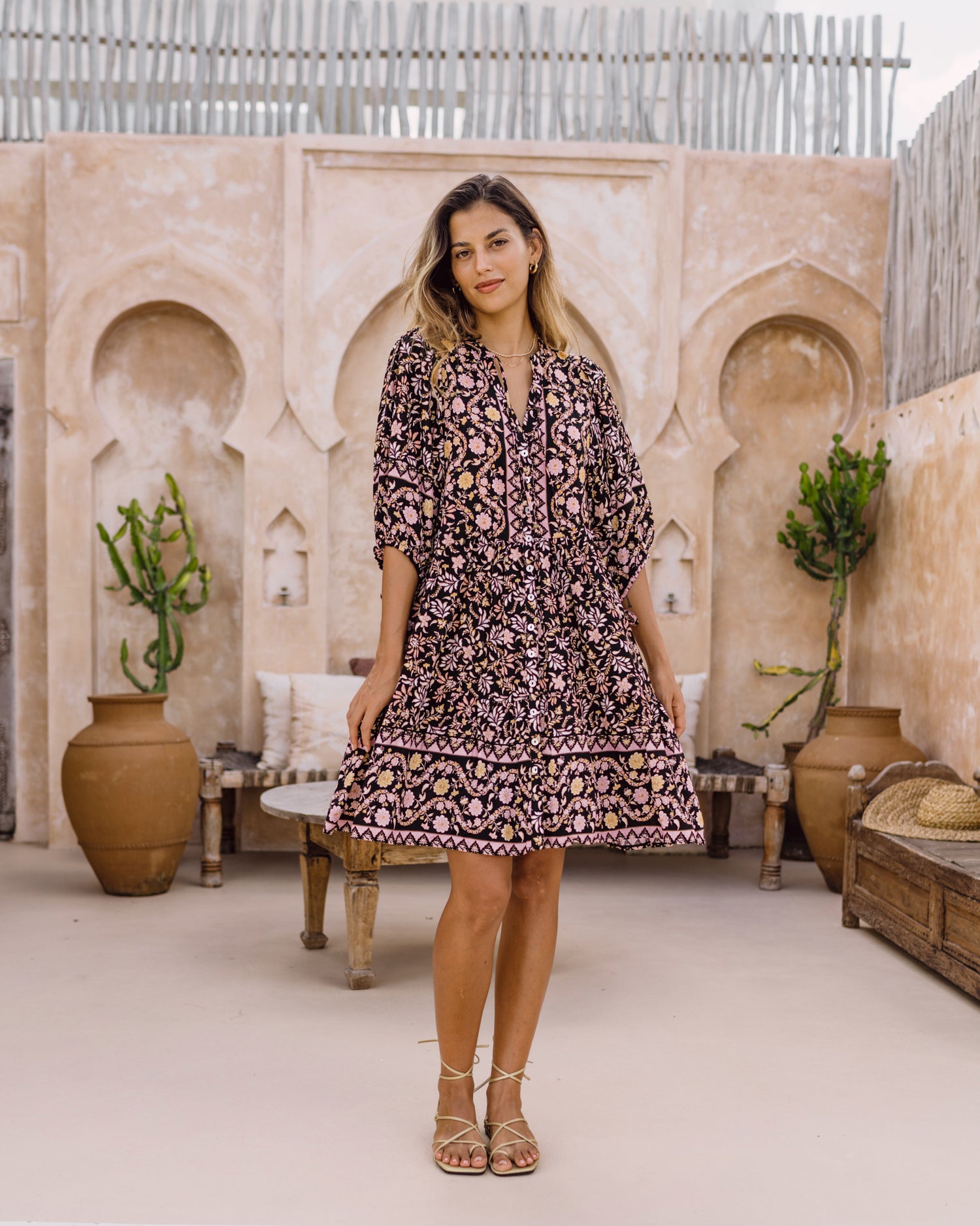 Our Laila dress is super breezy and comfortable, definitely the perfect dress for you! The lightweight fabric is perfect for hot summer days, and the trendy black floral boho print will have you looking stylish for any event. The V-neckline and button-down front add a touch of elegance, while the balloon sleeves and mini length keep it casual and fun. There are 2 hidden side pockets so you can keep your items close without compromising style. Don't miss out on this must-have dress perfect for summer to transeasonal dressing!