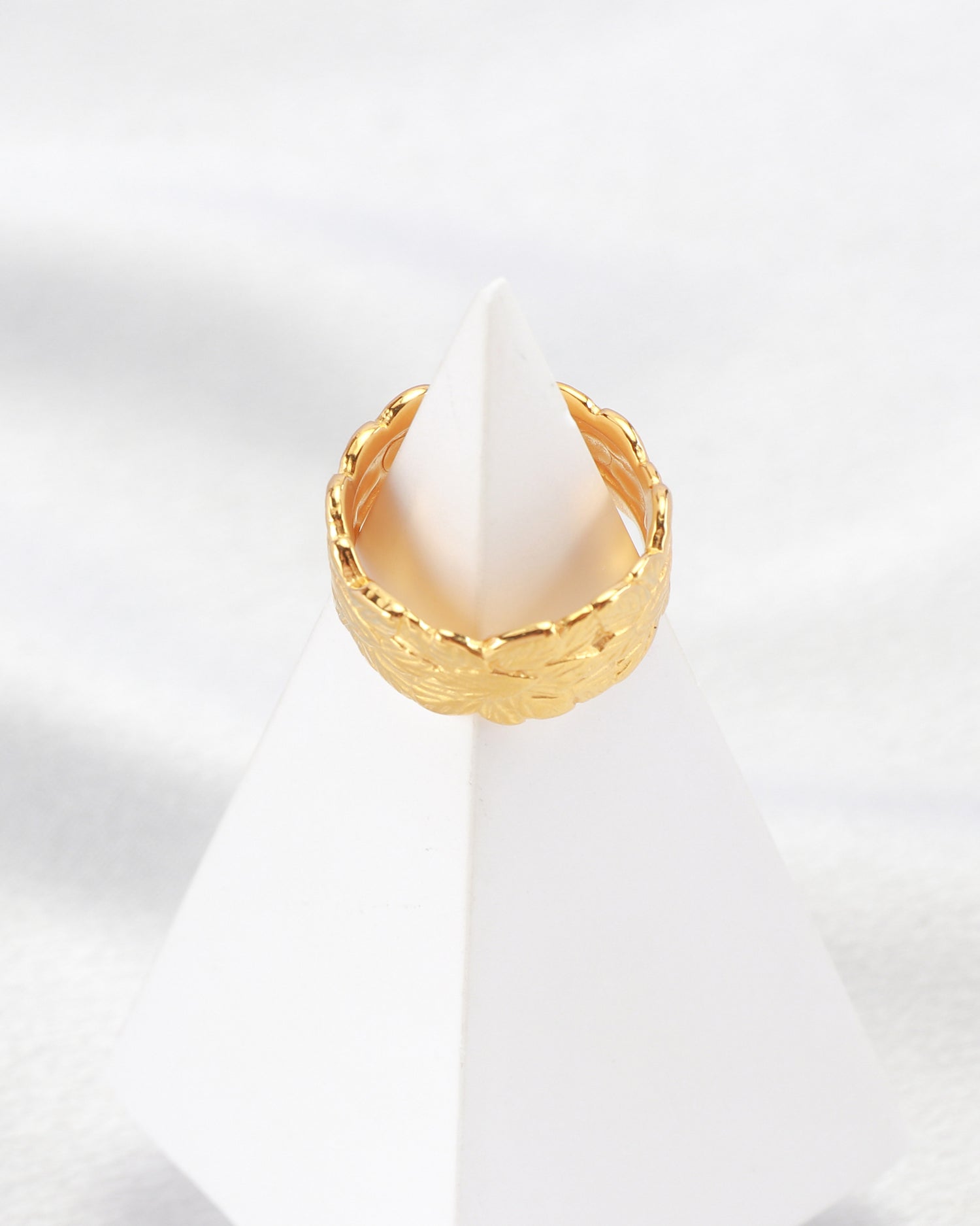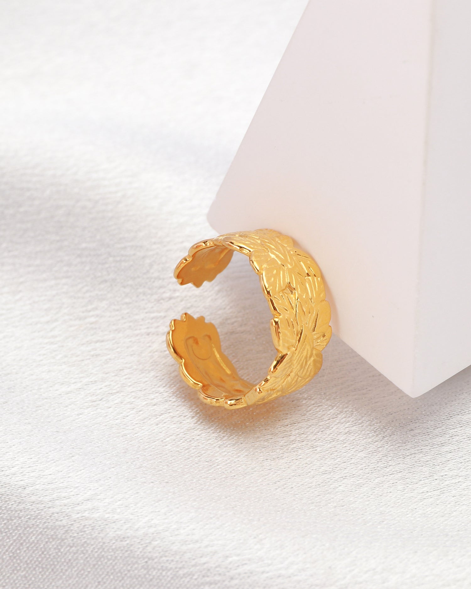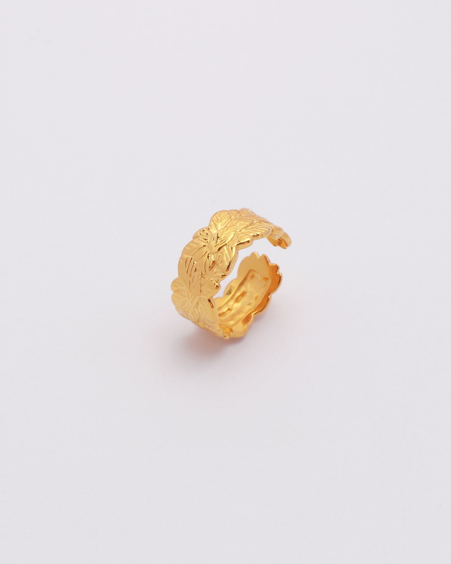 The Laurel Gold Ring is a symbol of timeless elegance with a touch of nature-inspired grace. Crafted from premium 18k gold-plated stainless steel, this ring features a laurel-textured shape, adding a unique and organic dimension to your ensemble. The fingerprint-resistant finish ensures a consistently polished look, allowing you to effortlessly maintain the ring's radiant allure. Elevate your style with the Laurel Gold Ring — a versatile accessory, an ideal choice for those seeking a sophisticated yet understated piece to complement any occasion.