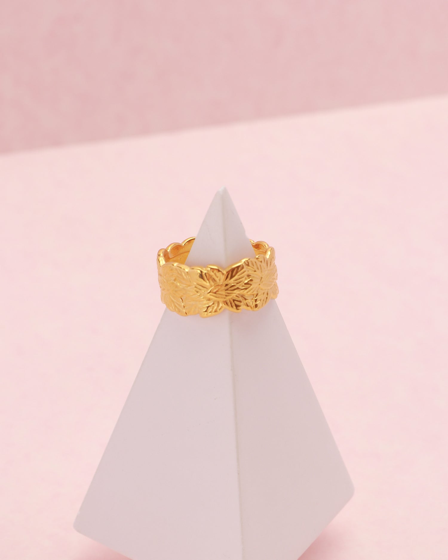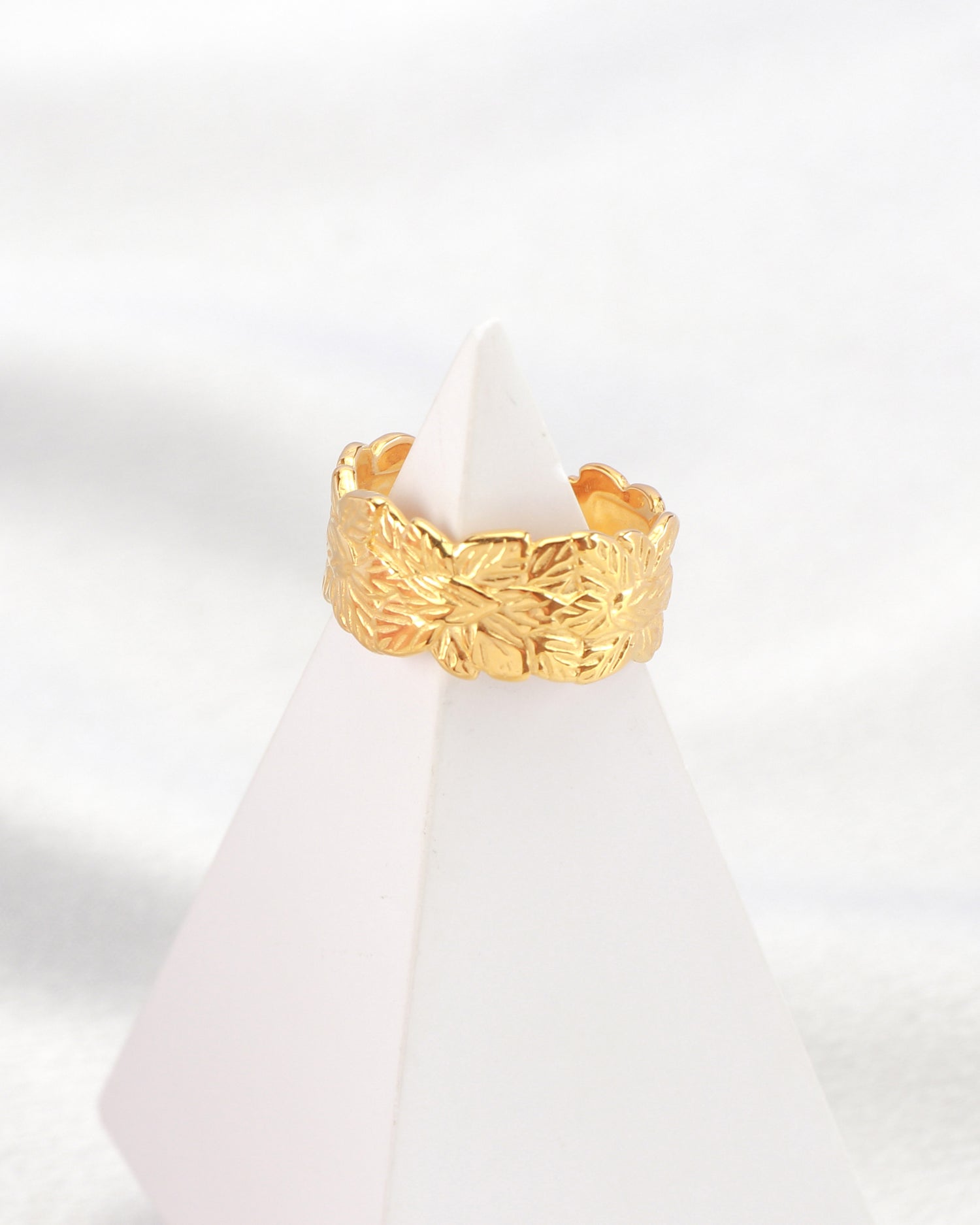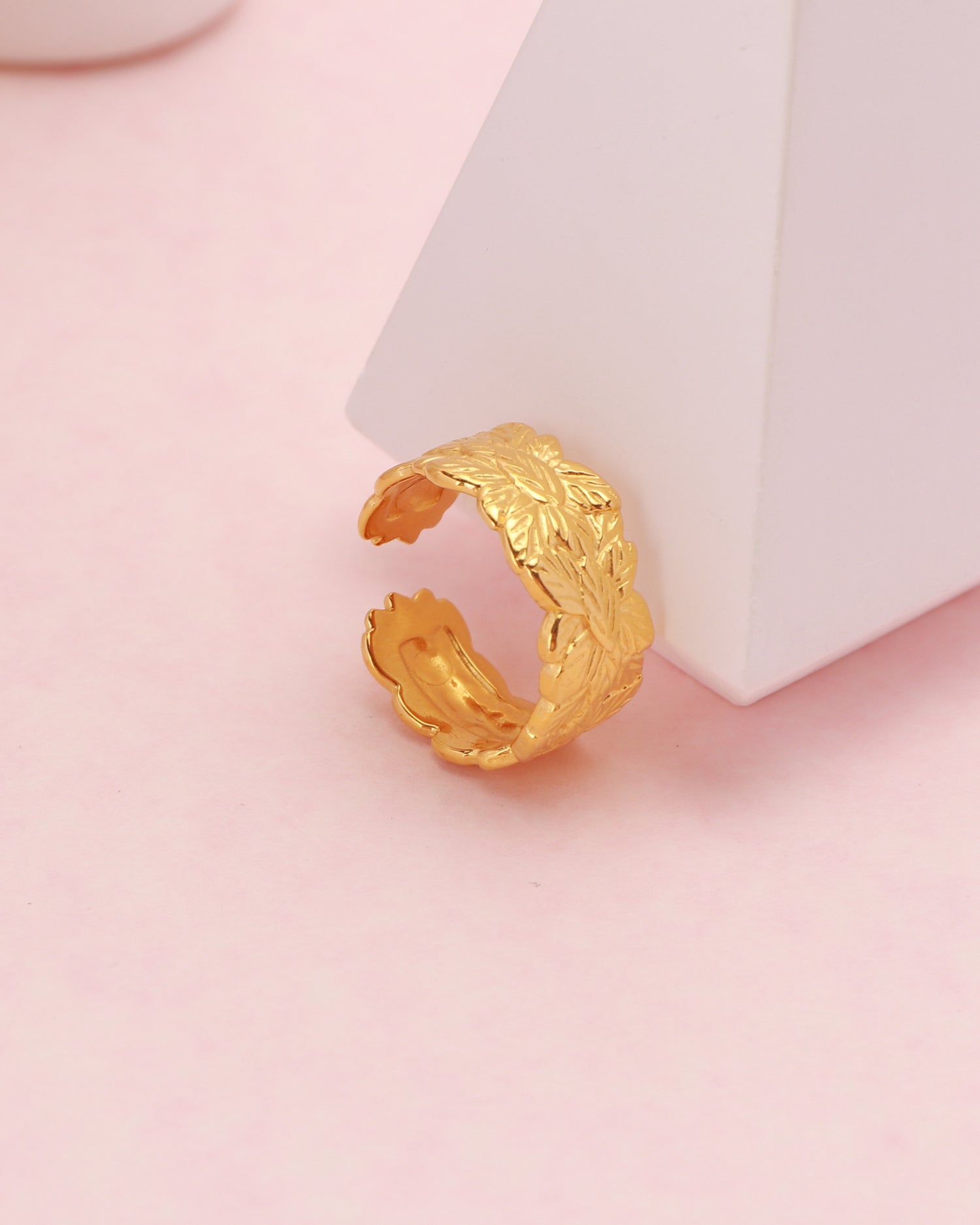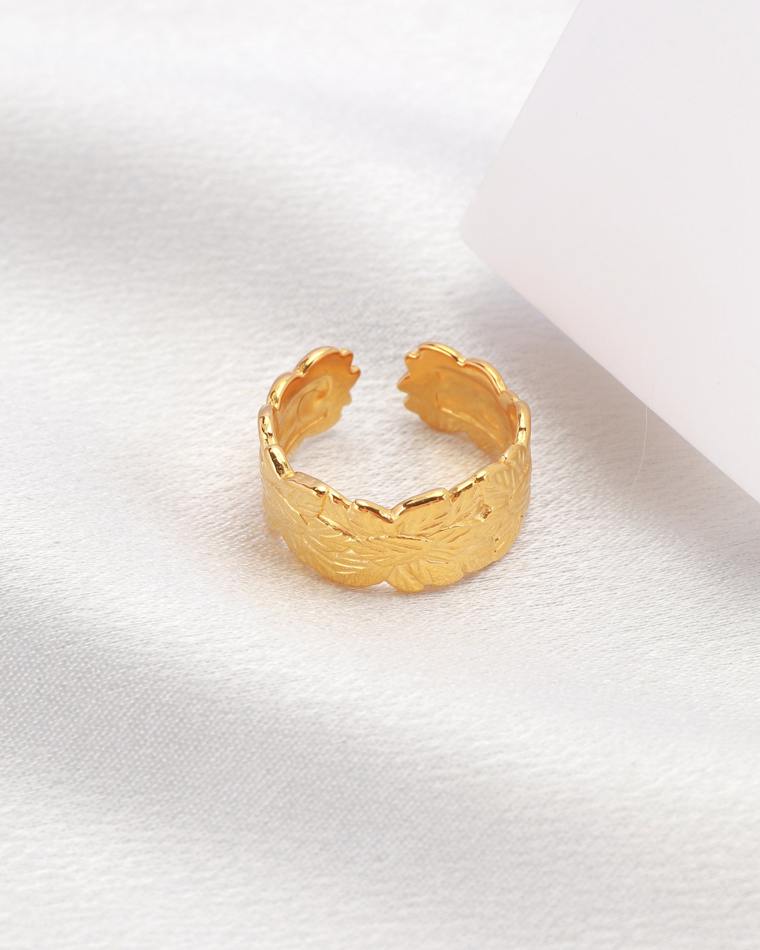 The Laurel Gold Ring is a symbol of timeless elegance with a touch of nature-inspired grace. Crafted from premium 18k gold-plated stainless steel, this ring features a laurel-textured shape, adding a unique and organic dimension to your ensemble. The fingerprint-resistant finish ensures a consistently polished look, allowing you to effortlessly maintain the ring's radiant allure. Elevate your style with the Laurel Gold Ring — a versatile accessory, an ideal choice for those seeking a sophisticated yet understated piece to complement any occasion.