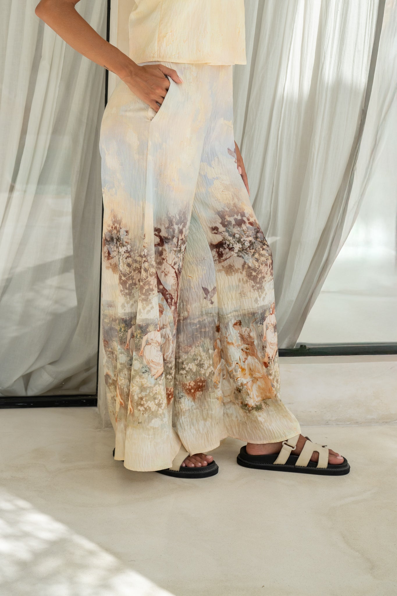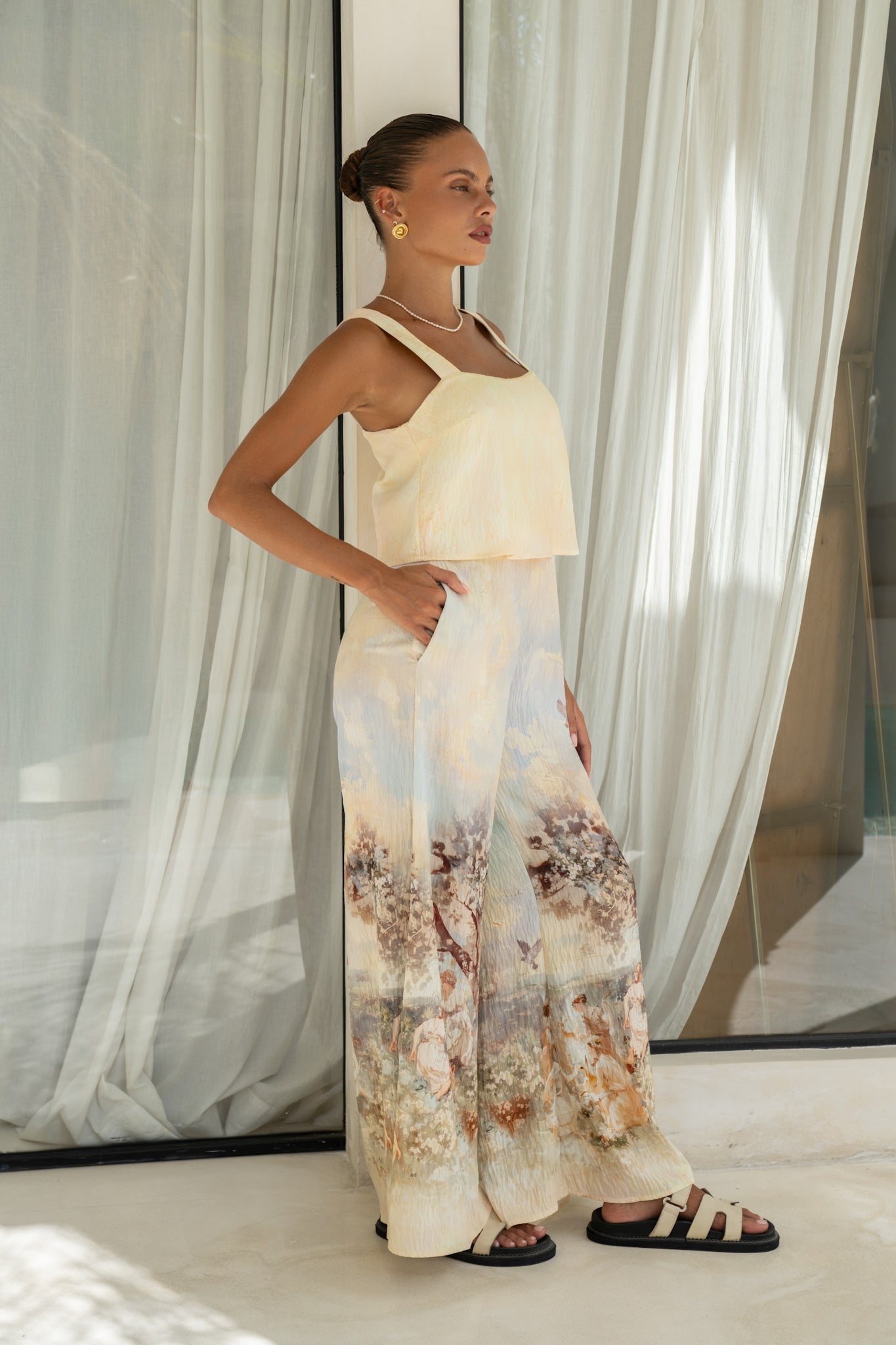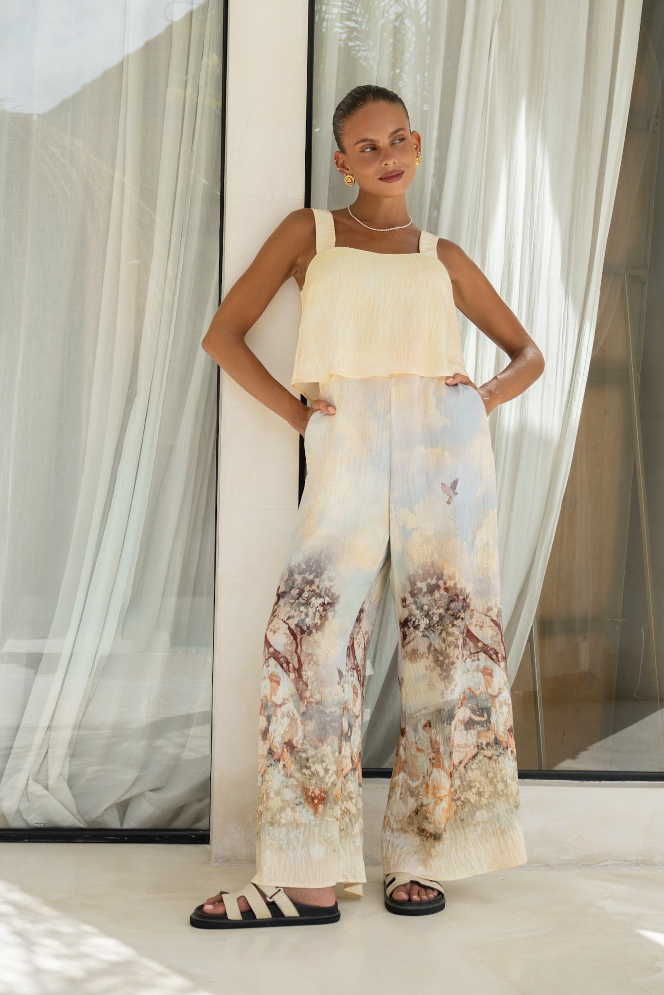 Indulge in the laid-back elegance of our Lavinia Yellow Blue Abstract Jumpsuit – a must-have addition to your summer wardrobe. With a square neckline, thick shoulder straps, and a flowy front panel, it effortlessly combines comfort and style. The hidden zipper at the back and stretchy shirred waist panel ensure a flattering fit. Enjoy the maxi length and wide leg in yellow and blue European painting inspired print. Elevate your summer wardrobe with this laid-back yet elegant jumpsuit, perfect for any occasion.