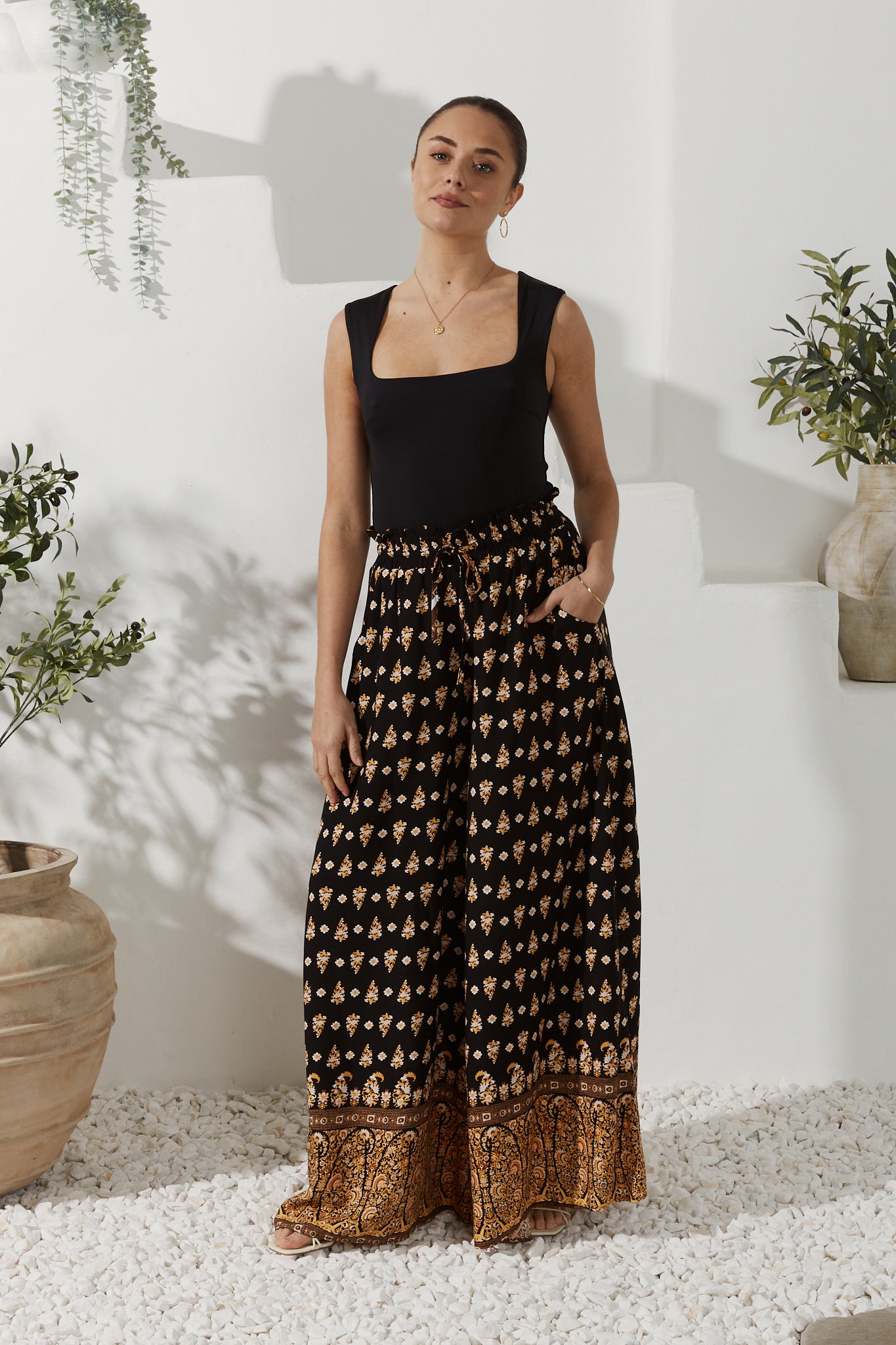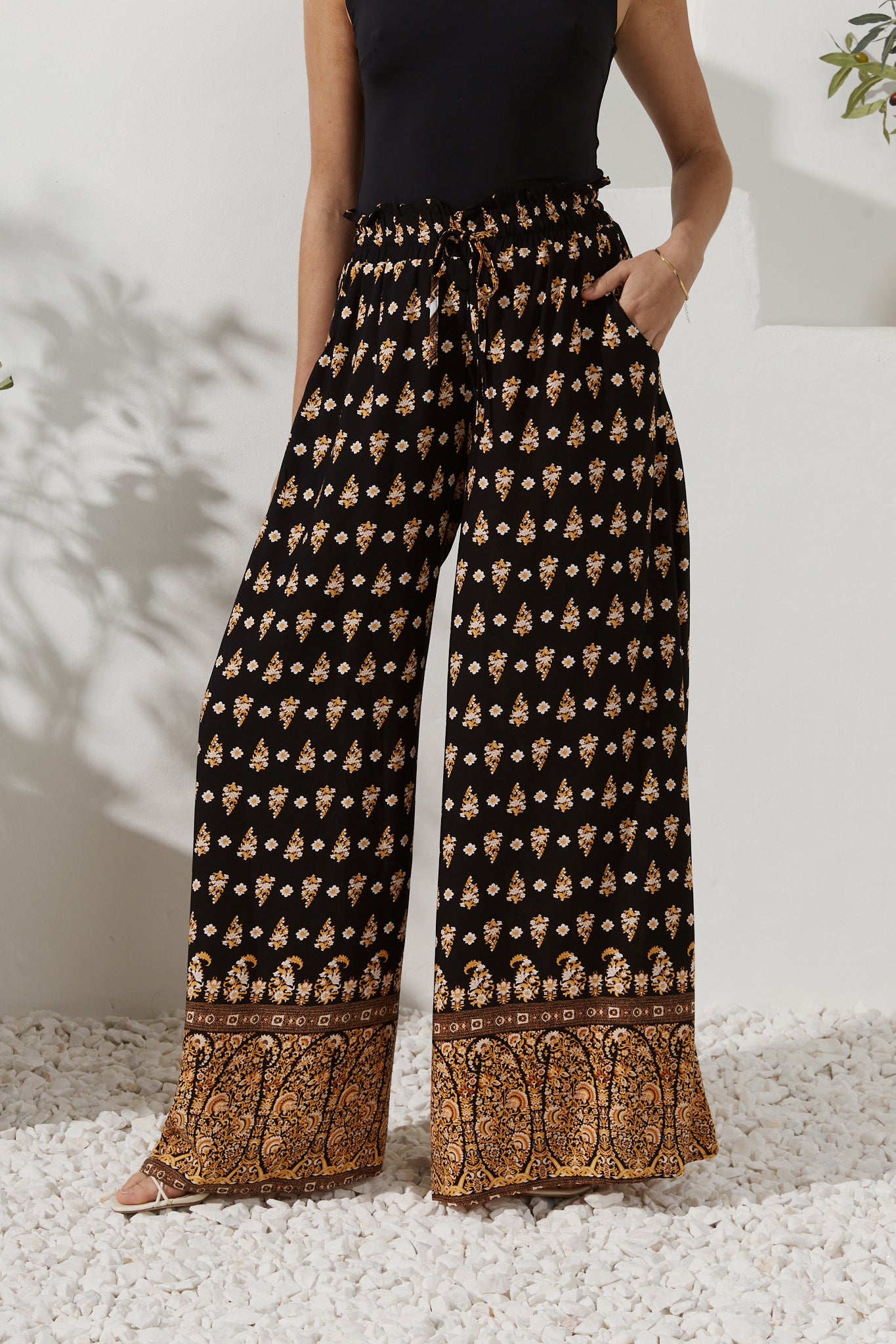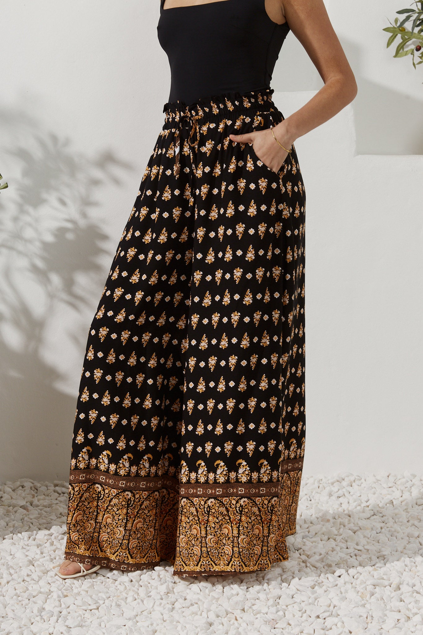 Elevate your wardrobe with the Leila Black Boho Wide Leg Pants. These gorgeous pants feature a bold and beautiful print in an elegant wide-leg fit. With the elastic self-tie waist, you can customise the fit to your body shape for the ultimate comfort and confidence. These beautiful pants also have side pockets, so you can keep your essentials close without compromising style. Constructed in breathable fabric, these pants ensure you stay cool throughout summer days or nights. Whether you're going for a relaxed weekend look or something more casual-chic, these nature-inspired pants are perfect for any occasion!