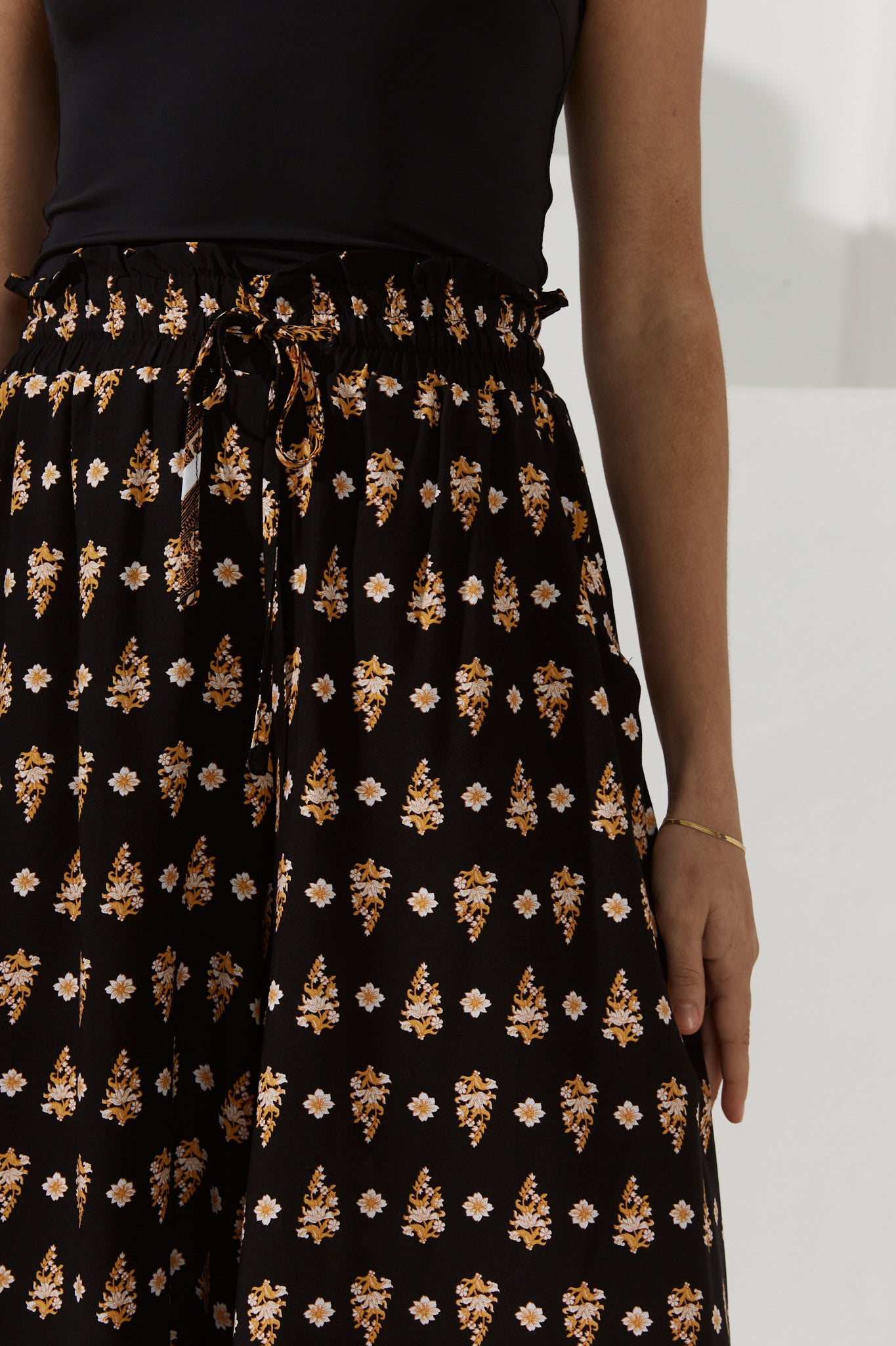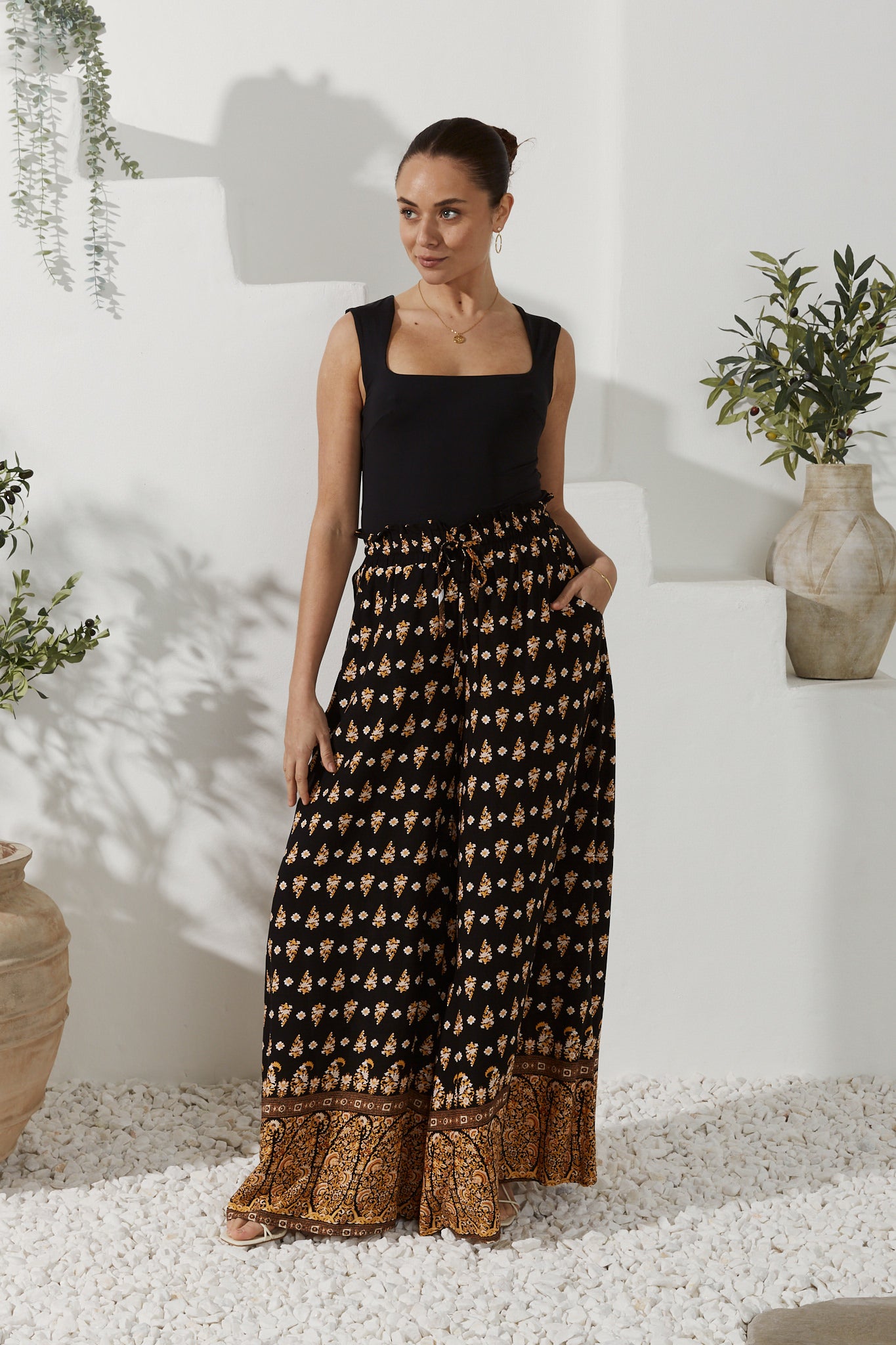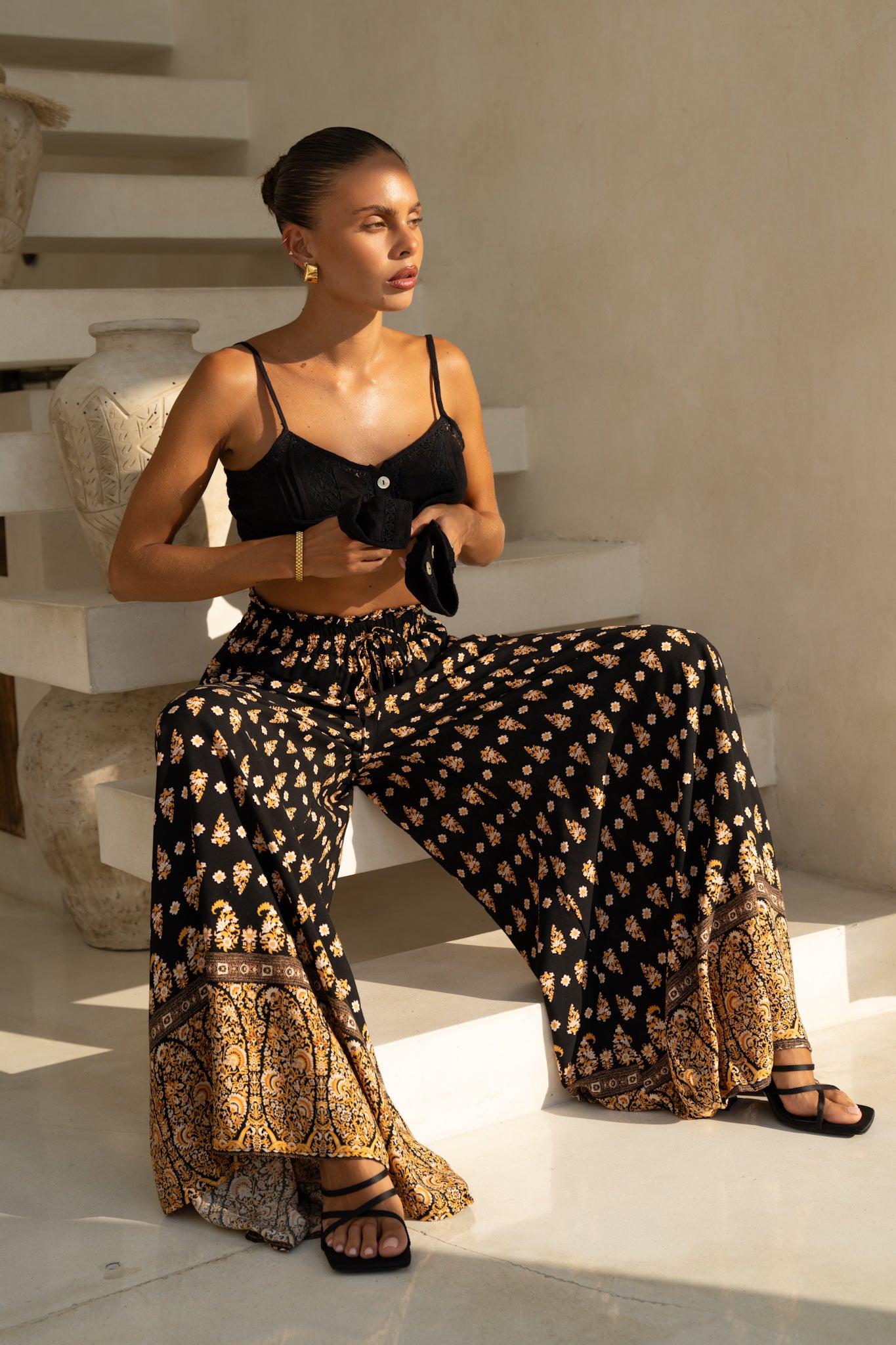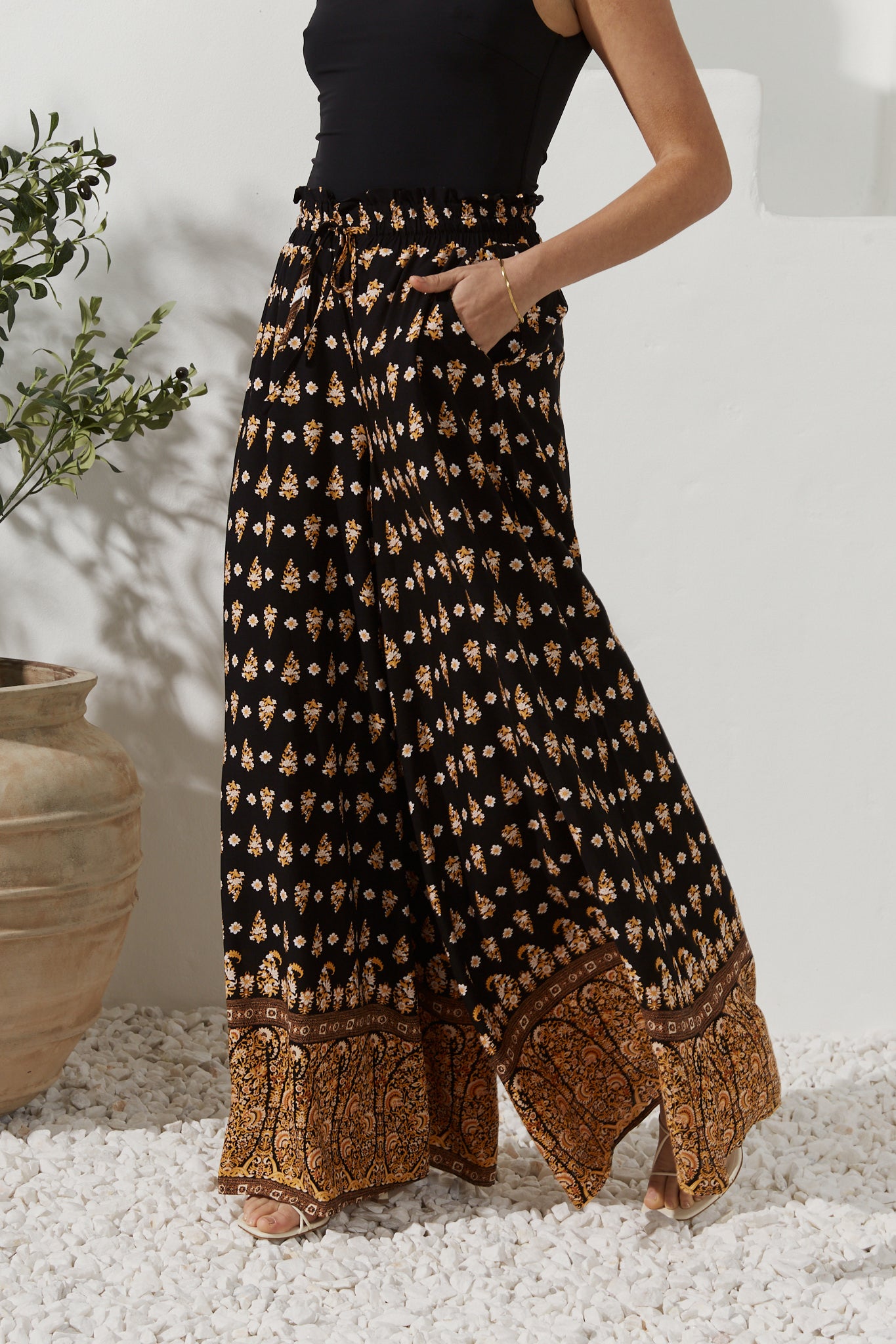 Elevate your wardrobe with the Leila Black Boho Wide Leg Pants. These gorgeous pants feature a bold and beautiful print in an elegant wide-leg fit. With the elastic self-tie waist, you can customise the fit to your body shape for the ultimate comfort and confidence. These beautiful pants also have side pockets, so you can keep your essentials close without compromising style. Constructed in breathable fabric, these pants ensure you stay cool throughout summer days or nights. Whether you're going for a relaxed weekend look or something more casual-chic, these nature-inspired pants are perfect for any occasion!