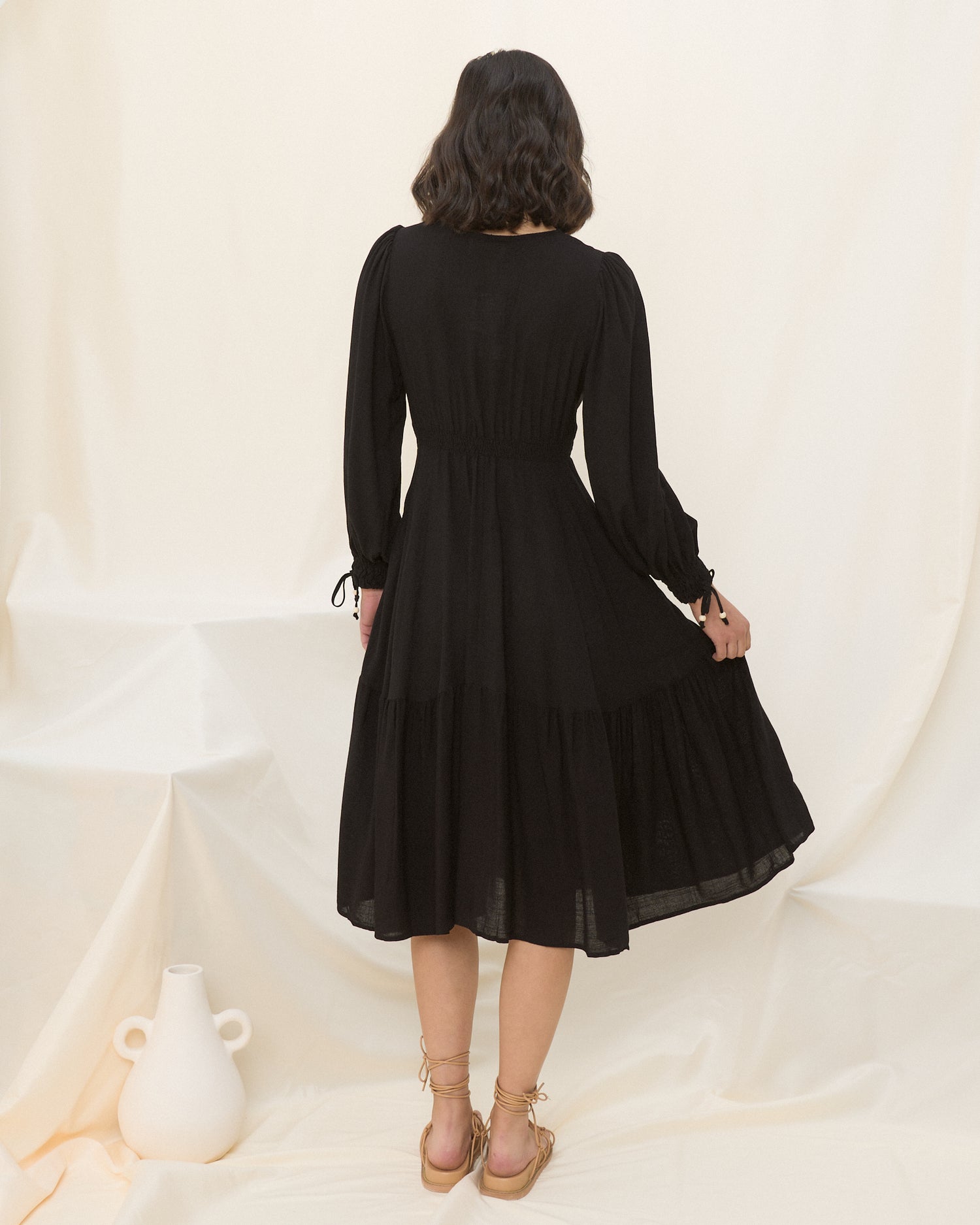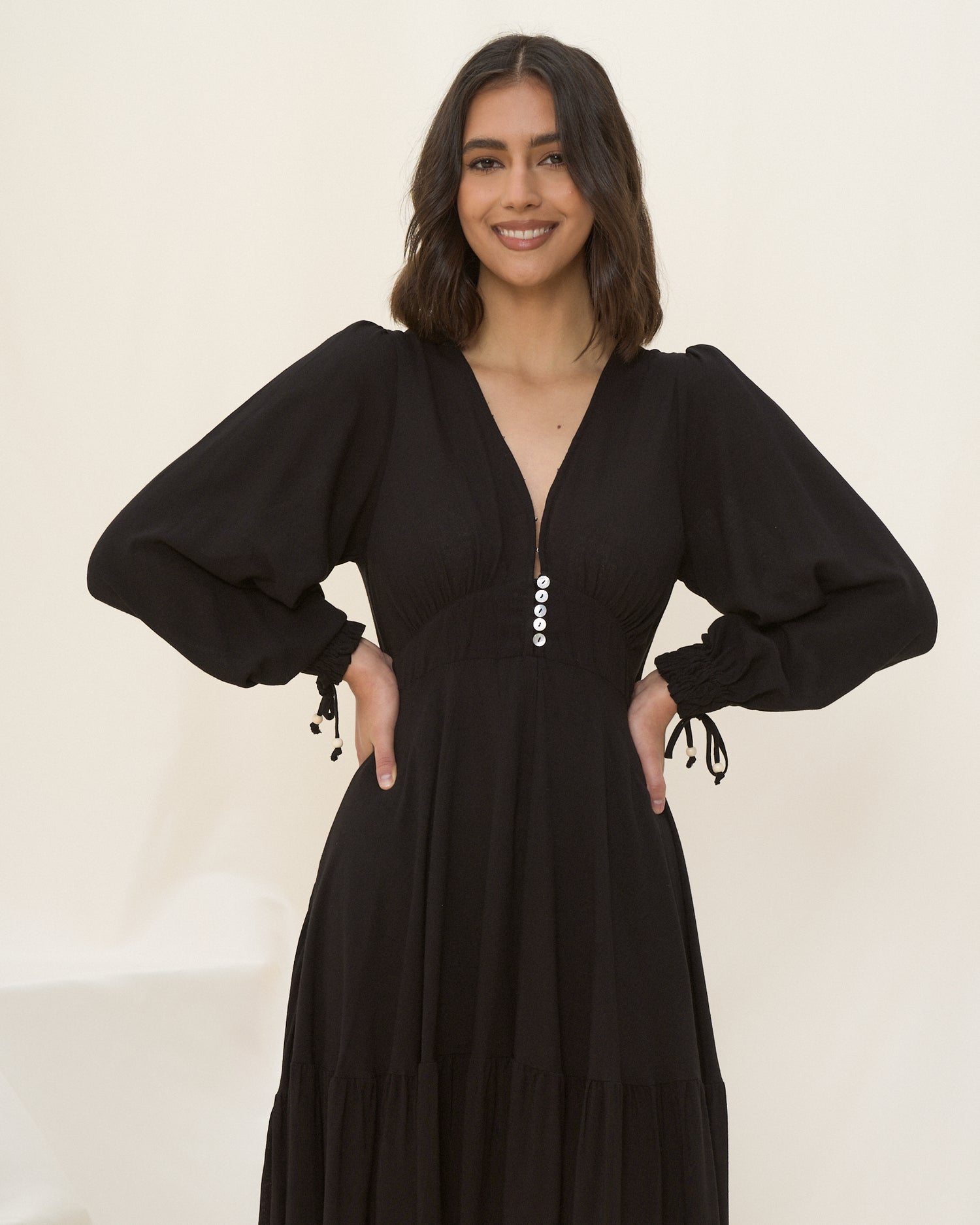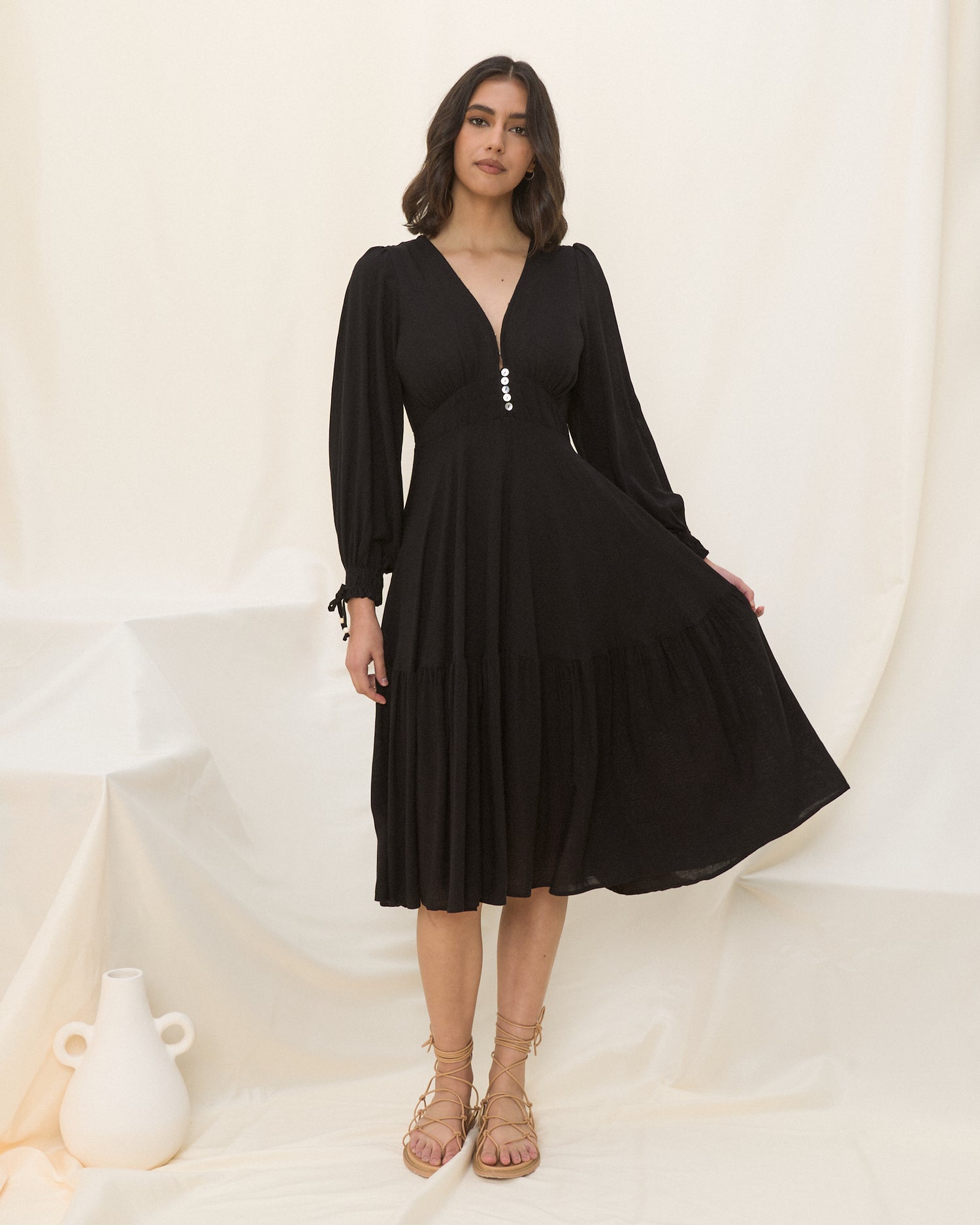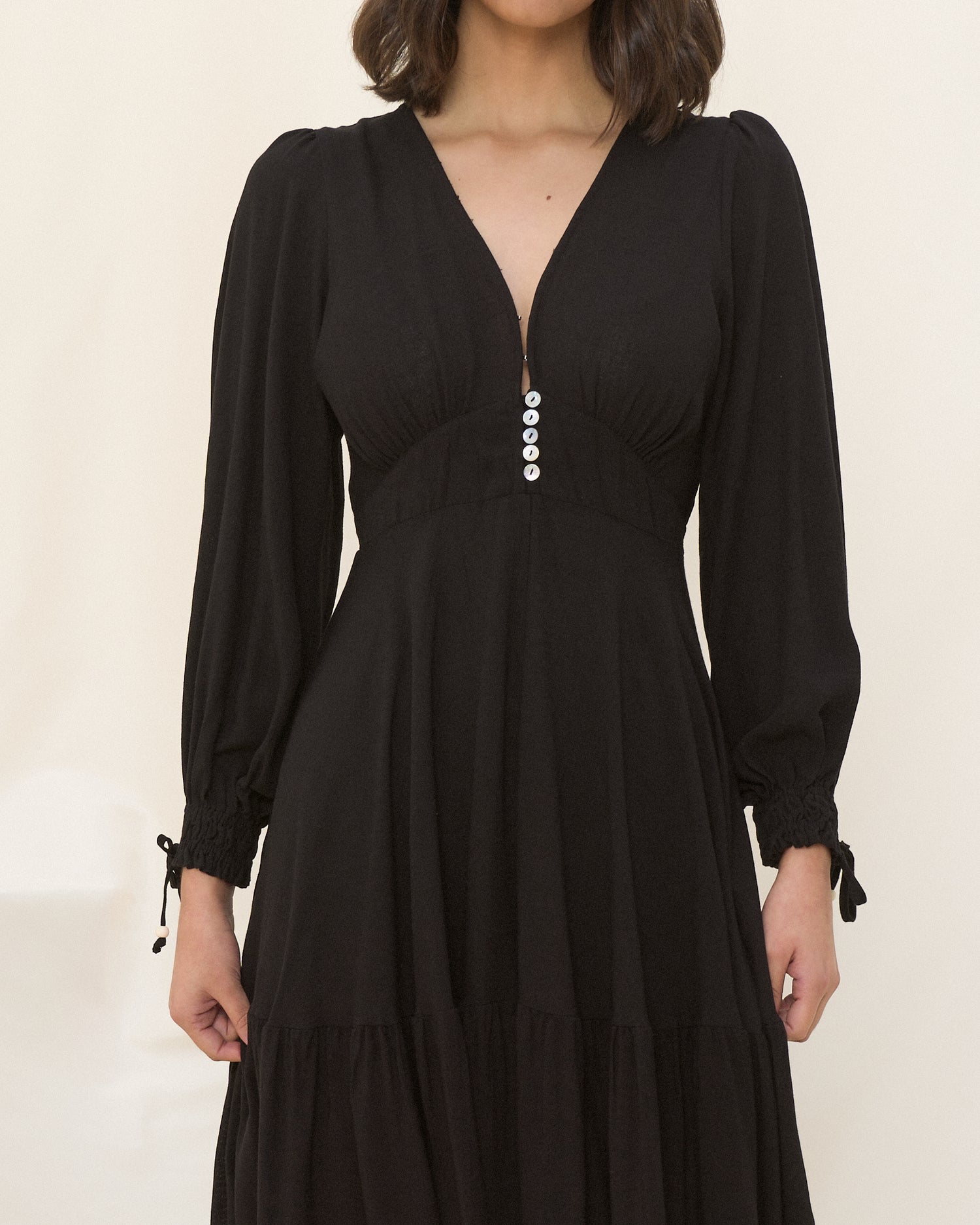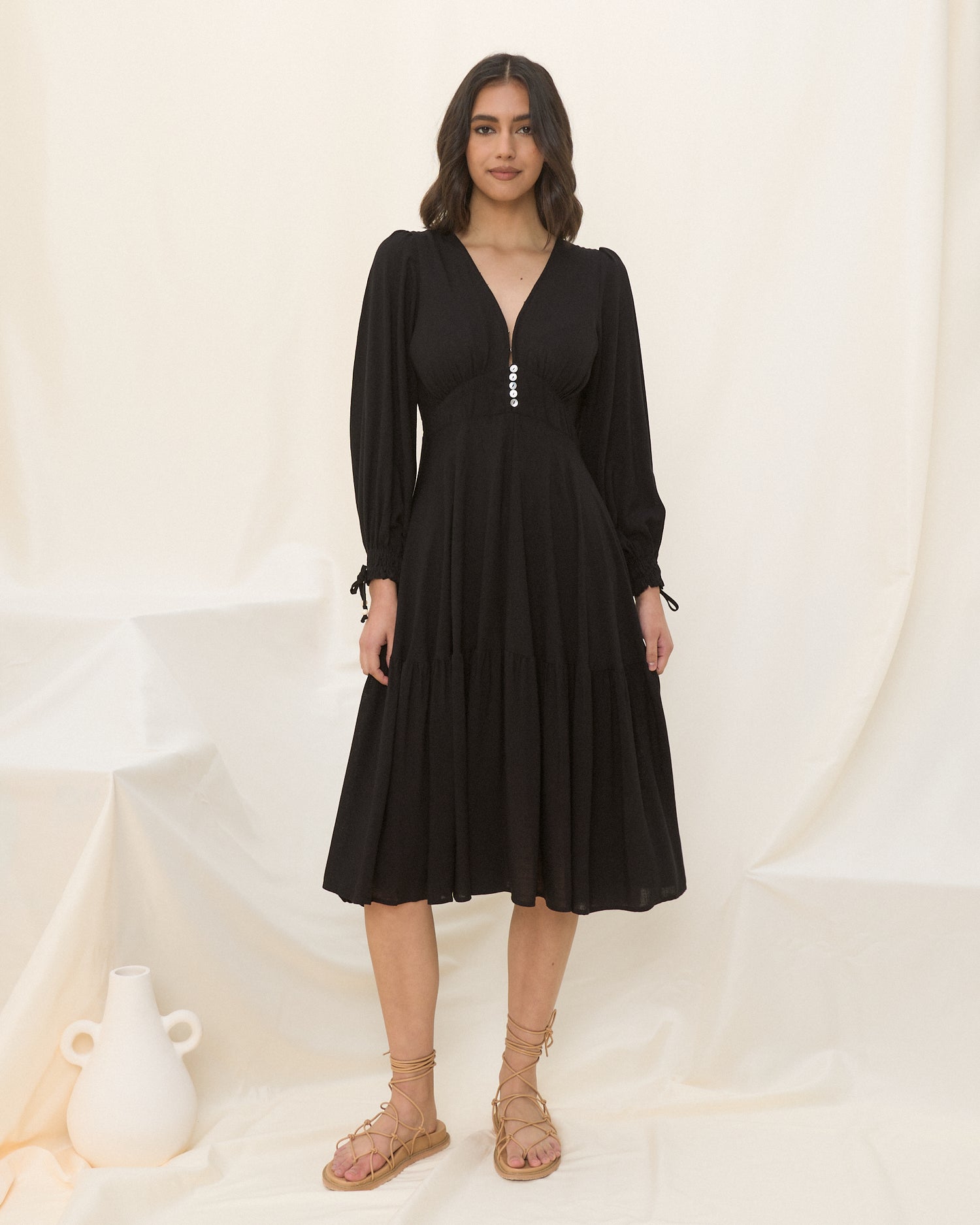 Looking for a timeless black dress? The Lenora dress is the perfect elegant staple black midi dress, featuring a V-neckline with button-down front waist, tiered skirt and long sleeves with pretty shirred cuff detail. Pair this must-have dress with flats or boots for the season!