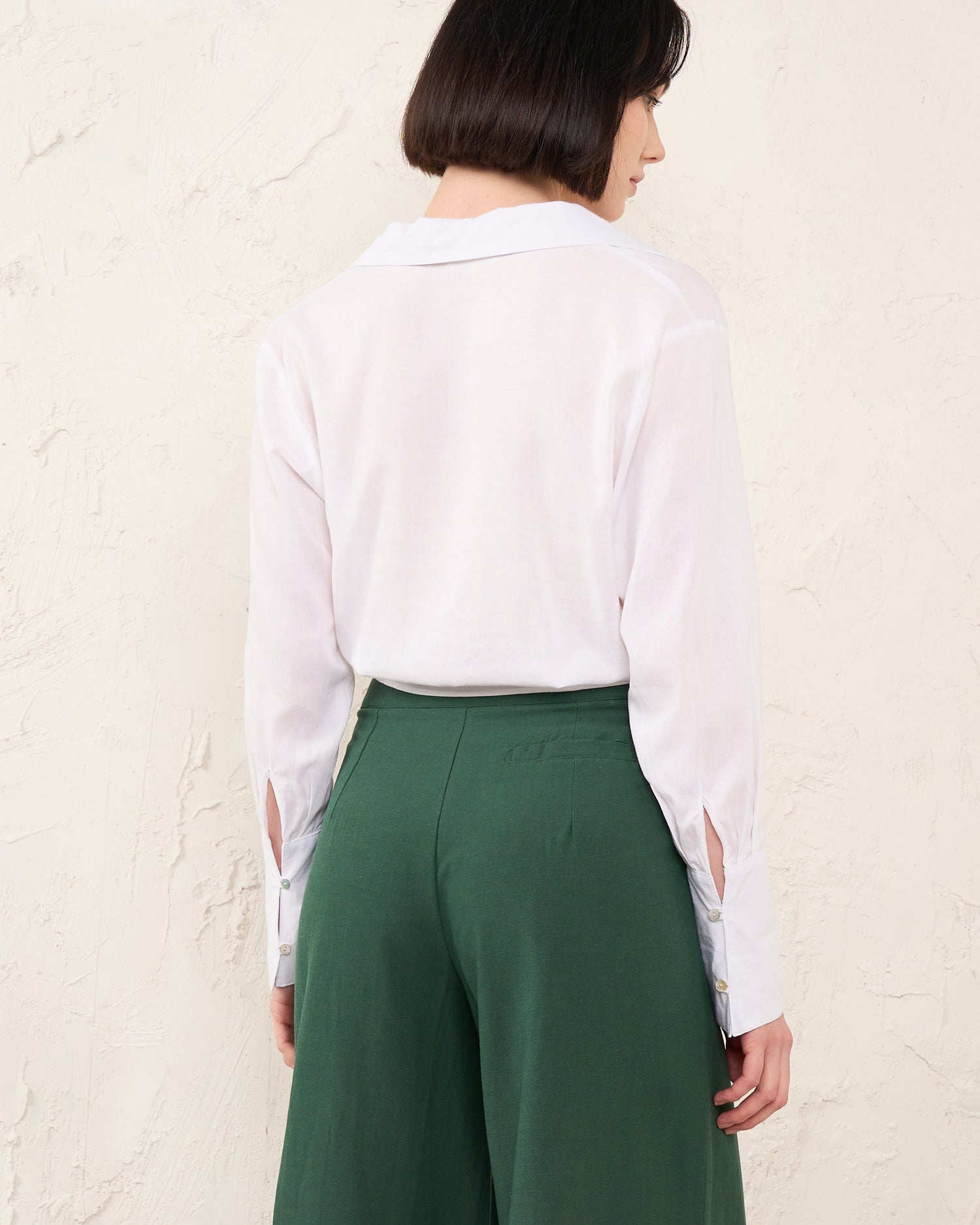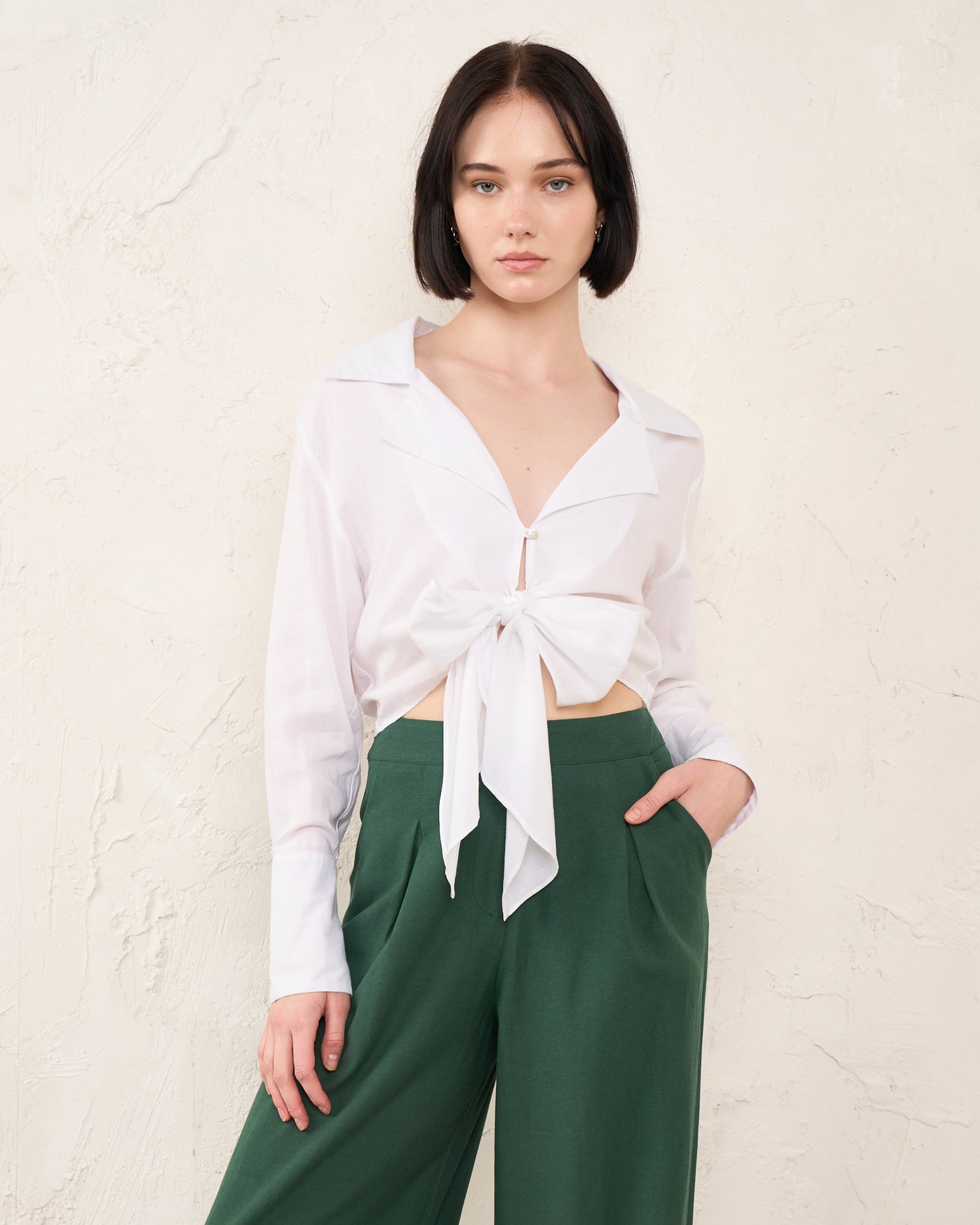 Are you looking for a top that is both sophisticated and sassy? Then look no further than the Liana White Collared Blouse. This stunning piece features a V-neckline, flat collar, long sleeves, button and tie fastening at the front, and drop shoulder. The clean white colour makes it perfect for any occasion, whether you're dressing up for work or going out for drinks with friends.