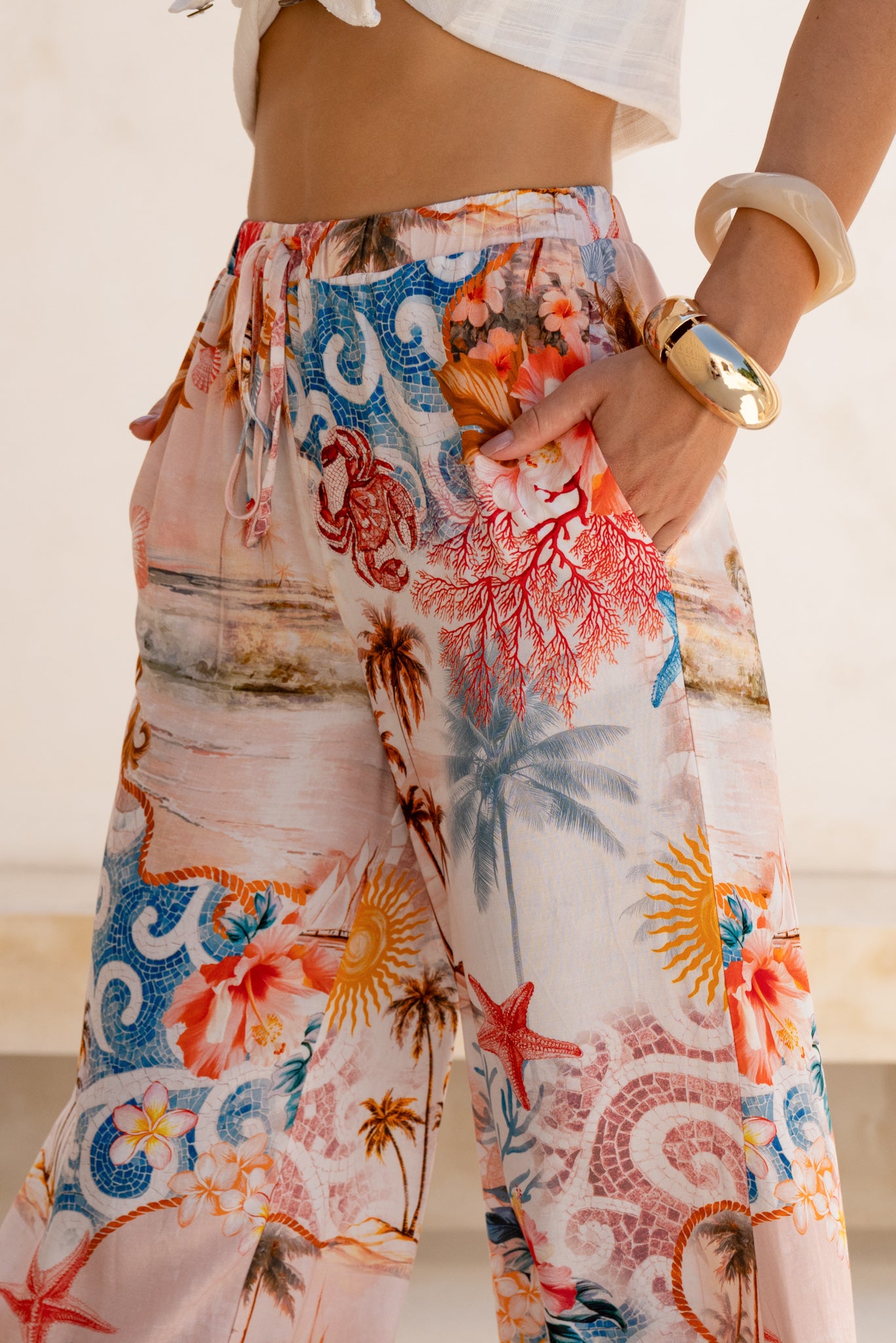 Say hello to Lumeia: palazzo pants that feel like a postcard from a sun-drenched island. Think blush skies, coral reefs, seashell scrolls, palms that sway, a tiny sailboat breezing through. It’s a full vacation narrative wrapped around your legs. Honestly, you’ll hear steel drums the second you slip them on. (Same. Not sorry.)