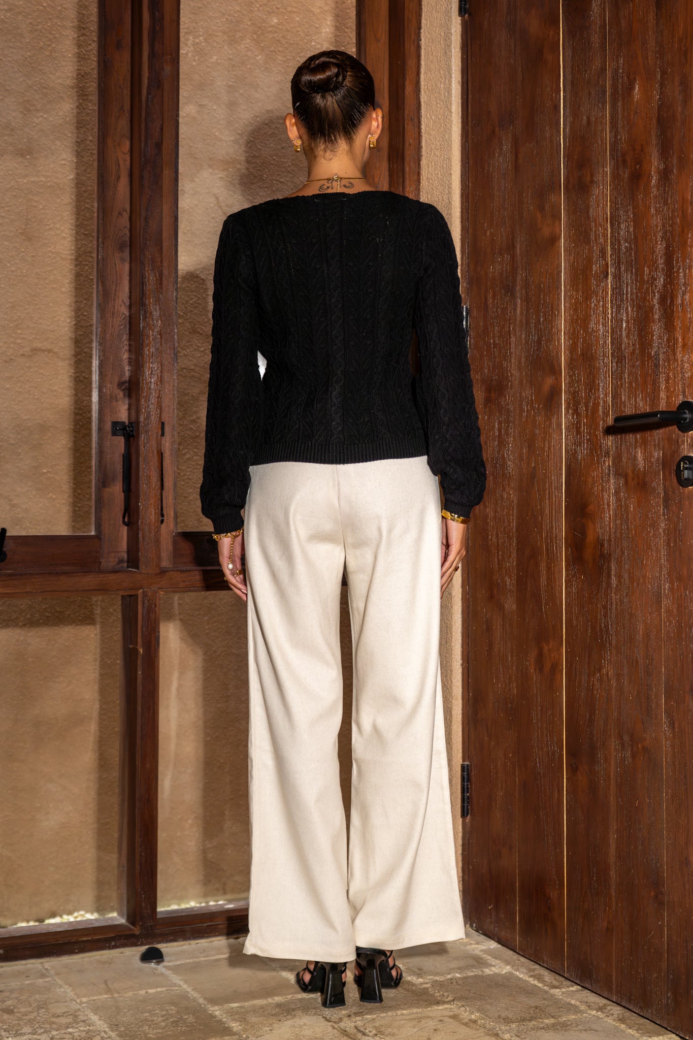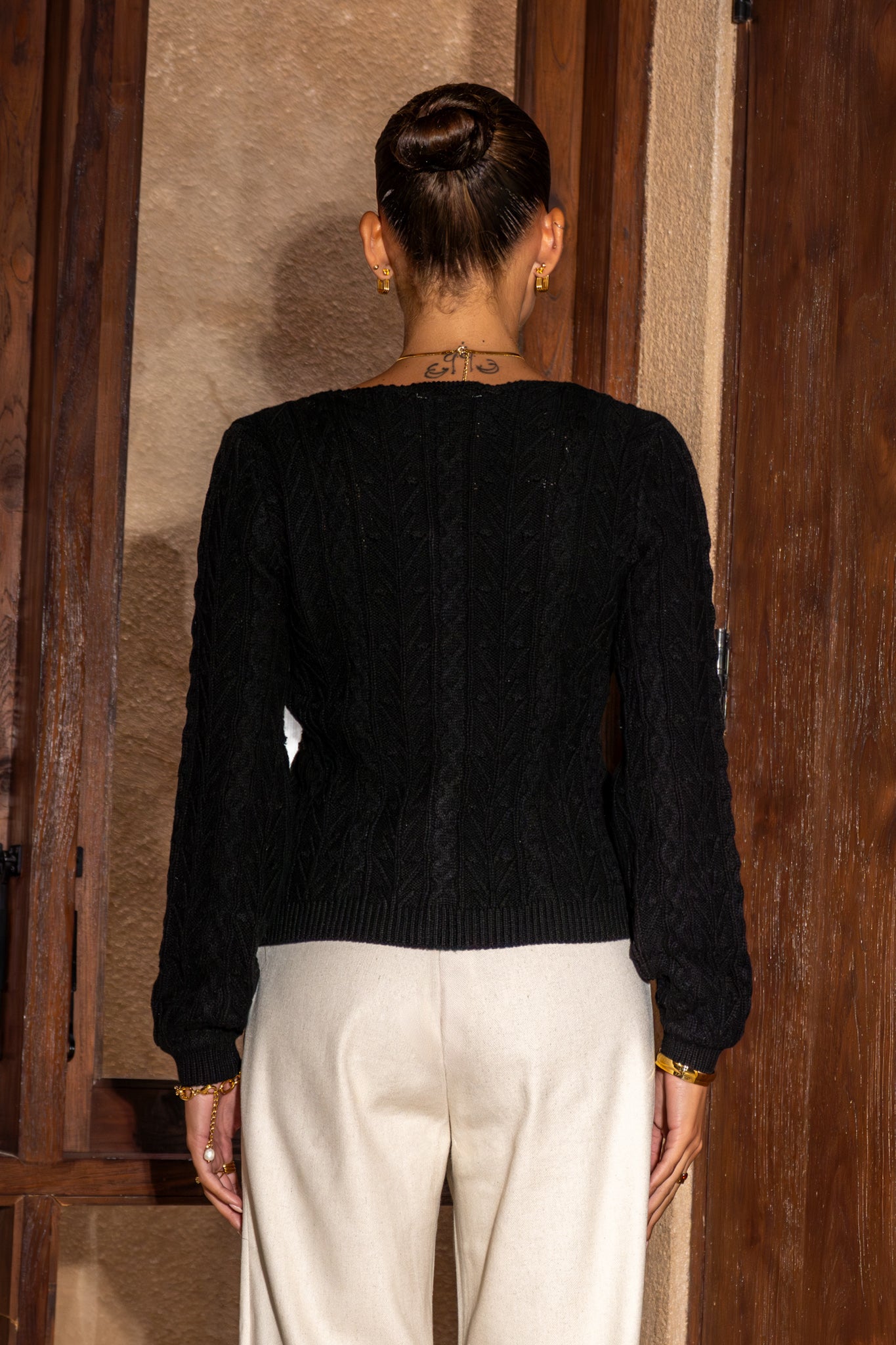 The Lyric Cardigan is that rare kind of knit. Timeless at heart, but with a softness that feels entirely your own. Spun in a black cable knit that’s equal parts cozy and elegant, it wraps you up without ever weighing you down. The V neckline flatters without fuss, while the ribbed cuffs and hem bring just enough structure to keep things neat. Worn open over a dress or buttoned into high-waisted denim, Lyric always fits the moment — easy, familiar, and a little bit romantic. The kind of piece you forget how much you love... until you wear it again.