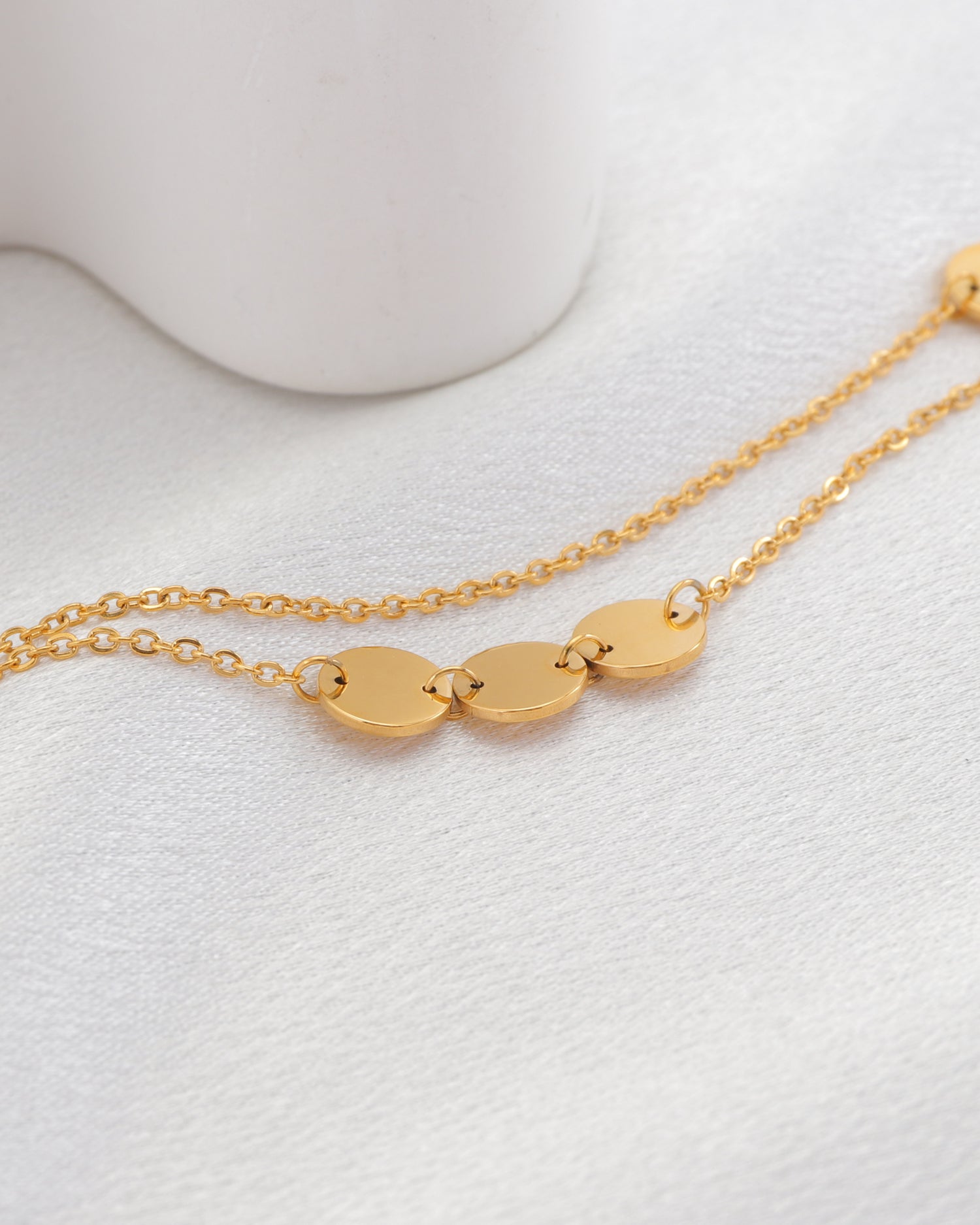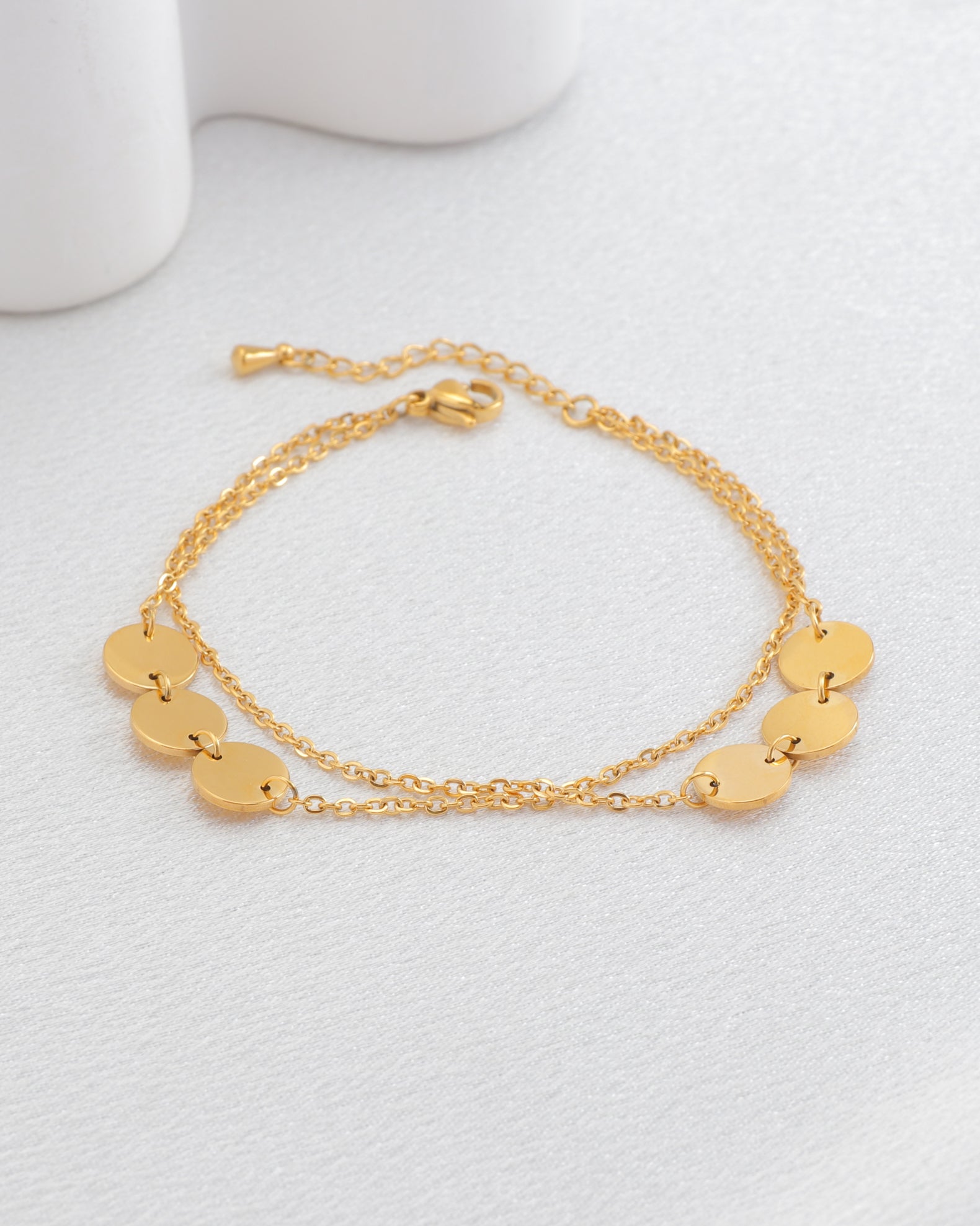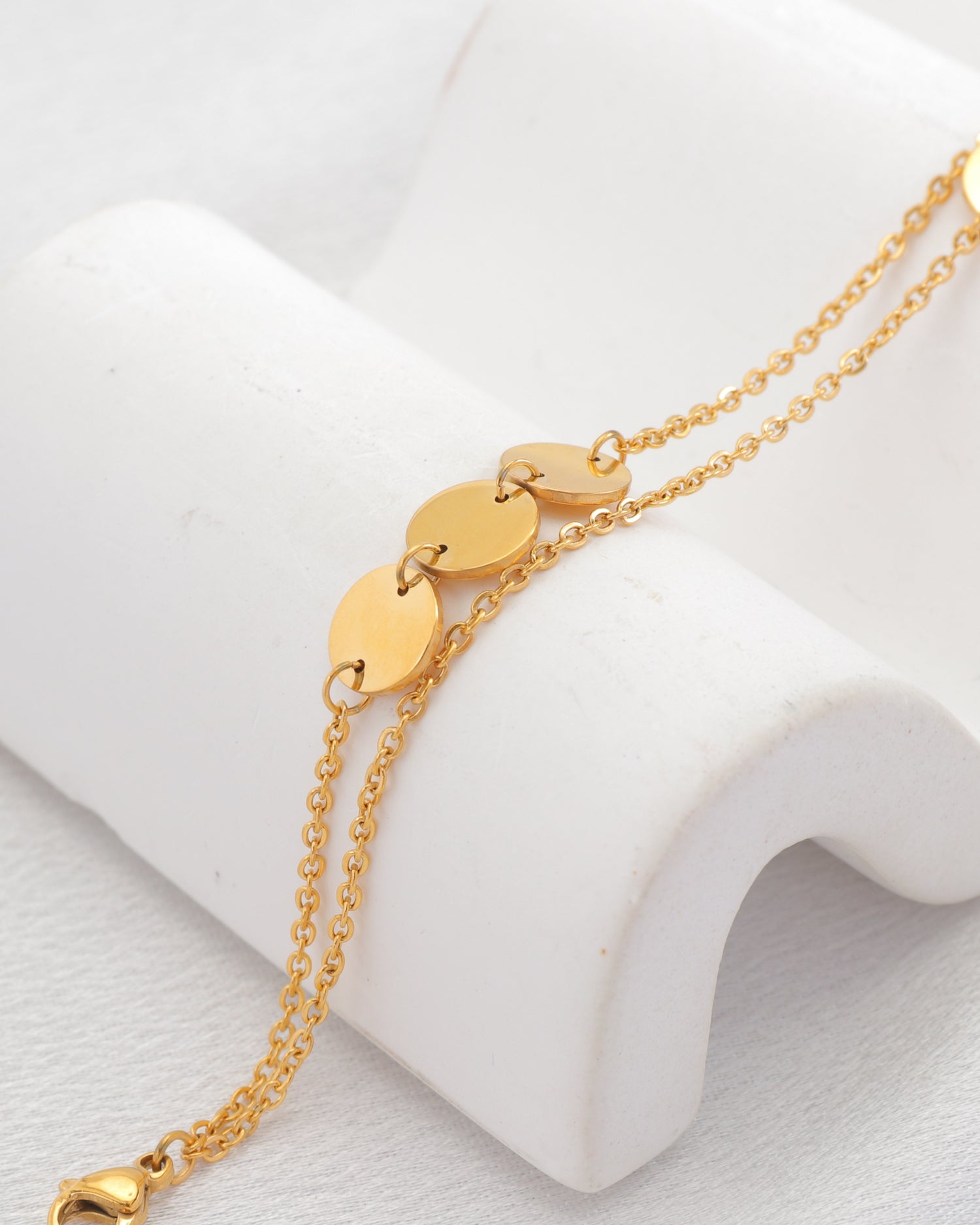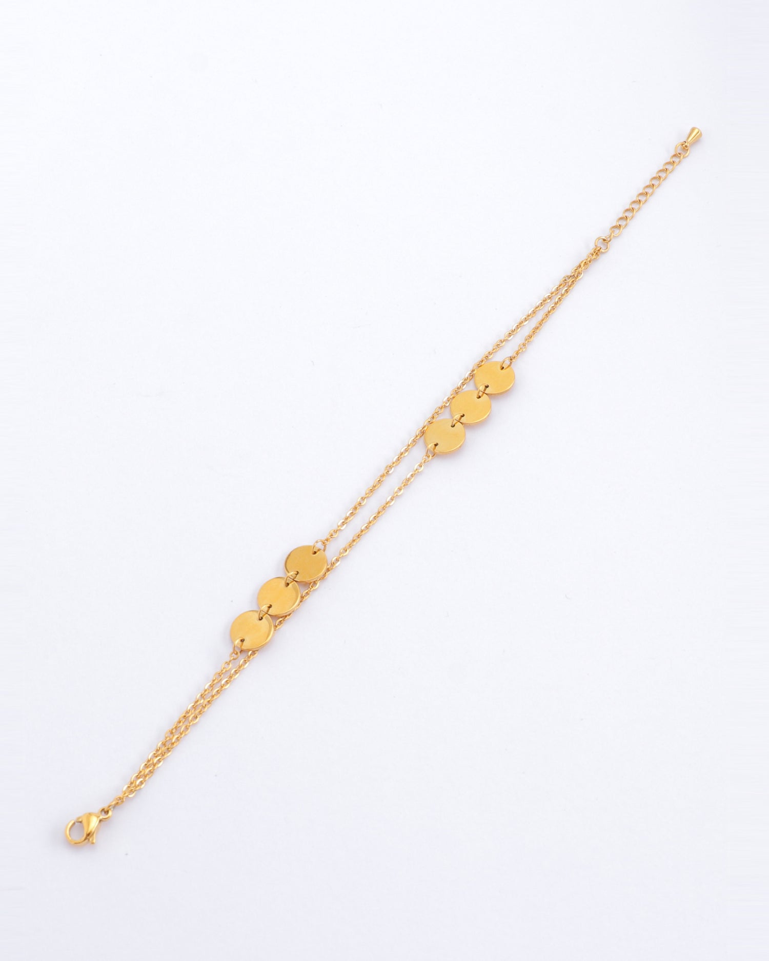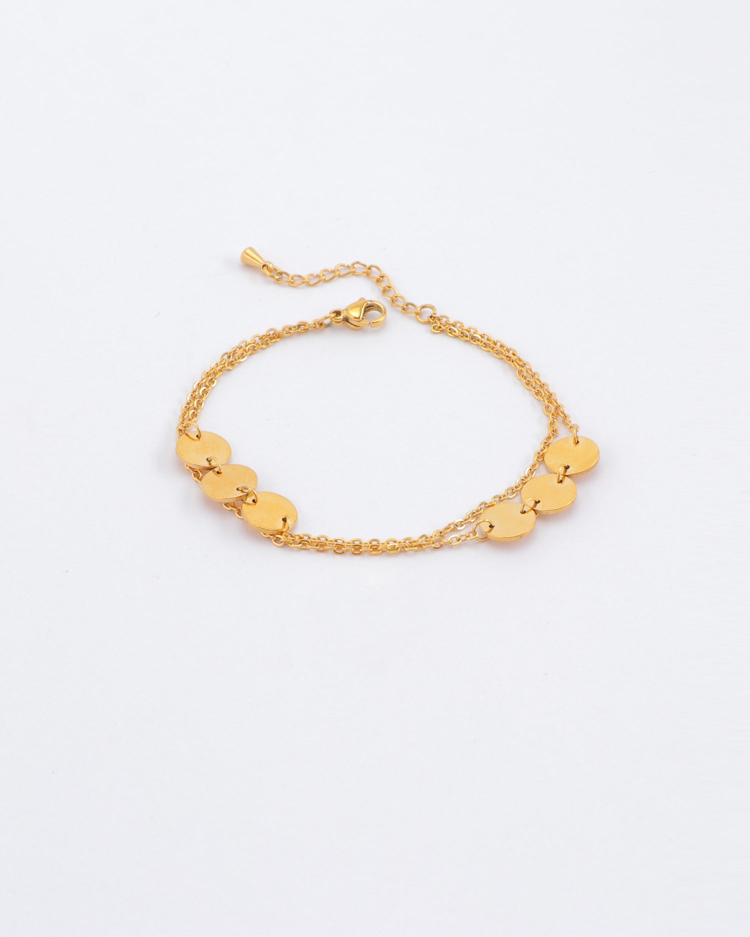 Embrace the free-spirited charm of the Mara Gold Circle Chain Bracelet — a Bohemian-inspired masterpiece that seamlessly blends style and elegance. Crafted from premium 18k gold-plated stainless steel, this bracelet features a captivating Bohemian design adorned with mini disc details, adding a touch of artful sophistication to your wrist. The lobster clasp closure ensures a secure fit, while the fingerprint-resistant finish preserves the bracelet's luminous allure. With an adjustable chain length, the Mara bracelet offers versatility to suit your individual style. Elevate your look with this exquisite piece, a statement accessory that captures the essence of carefree beauty.