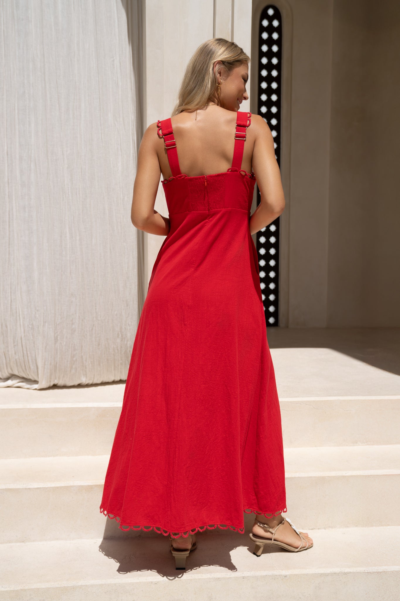 Cut in a soft A-line that floats from the waist and skims the ankles, this maxi moves with a bold, beautiful energy. No cling, no fuss, just swish. The scalloped hem peeks and dips with every step, giving “Spanish fiesta meets sunset dinner.” Add gold hoops and a woven clutch for a garden party; swap to strappy heels and a touch of bronzer and, surprise, she’s evening-ready too. If you’ve been hunting for that one red summer dress that turns heads and feels even better IRL… you’re looking at her.