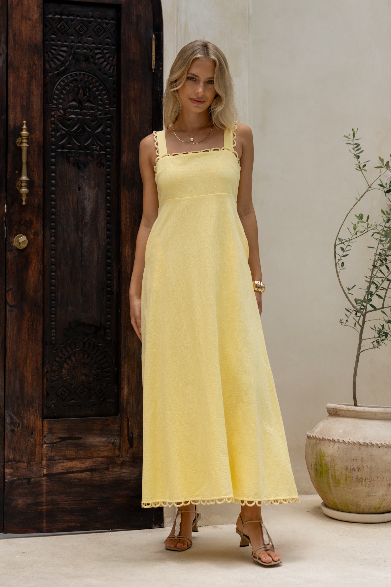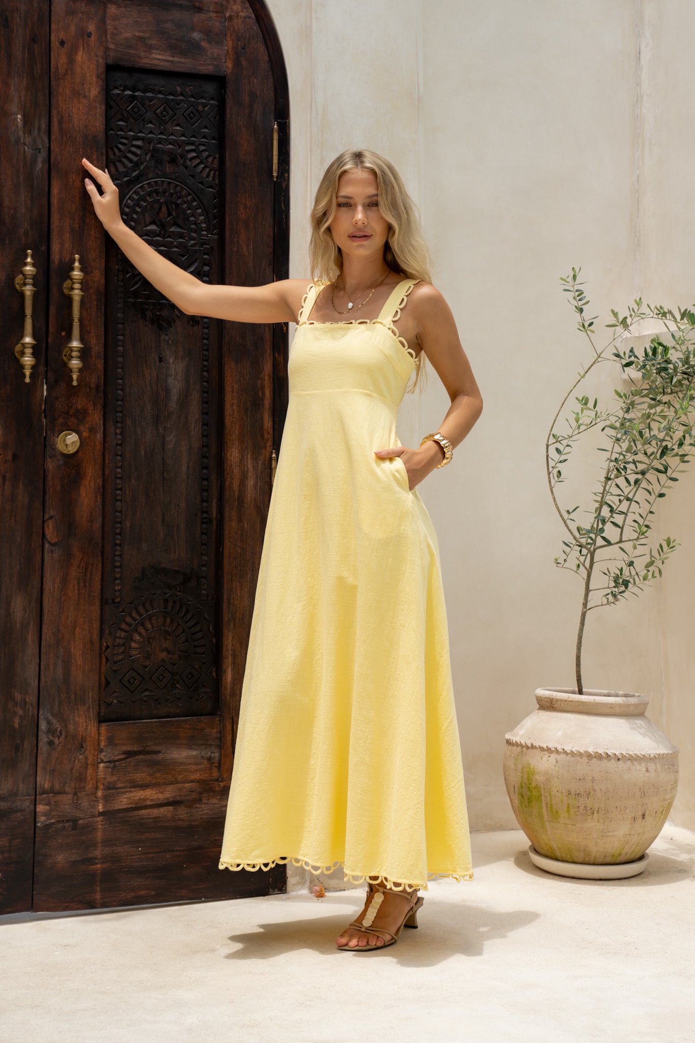Cut in a soft A-line that floats from the waist and skims the ankles, this maxi moves like a warm breeze. No cling, no fuss, just swish. The scalloped hem peeks and dips with every step, giving “Mediterranean holiday meets Sunday market.” Add hoops and a raffia tote for brunch; swap to strappy heels and a red lip and, surprise, she’s evening-ready too. If you’ve been hunting for that one yellow summer dress that photographs beautifully and feels even better IRL… you’re looking at her.
