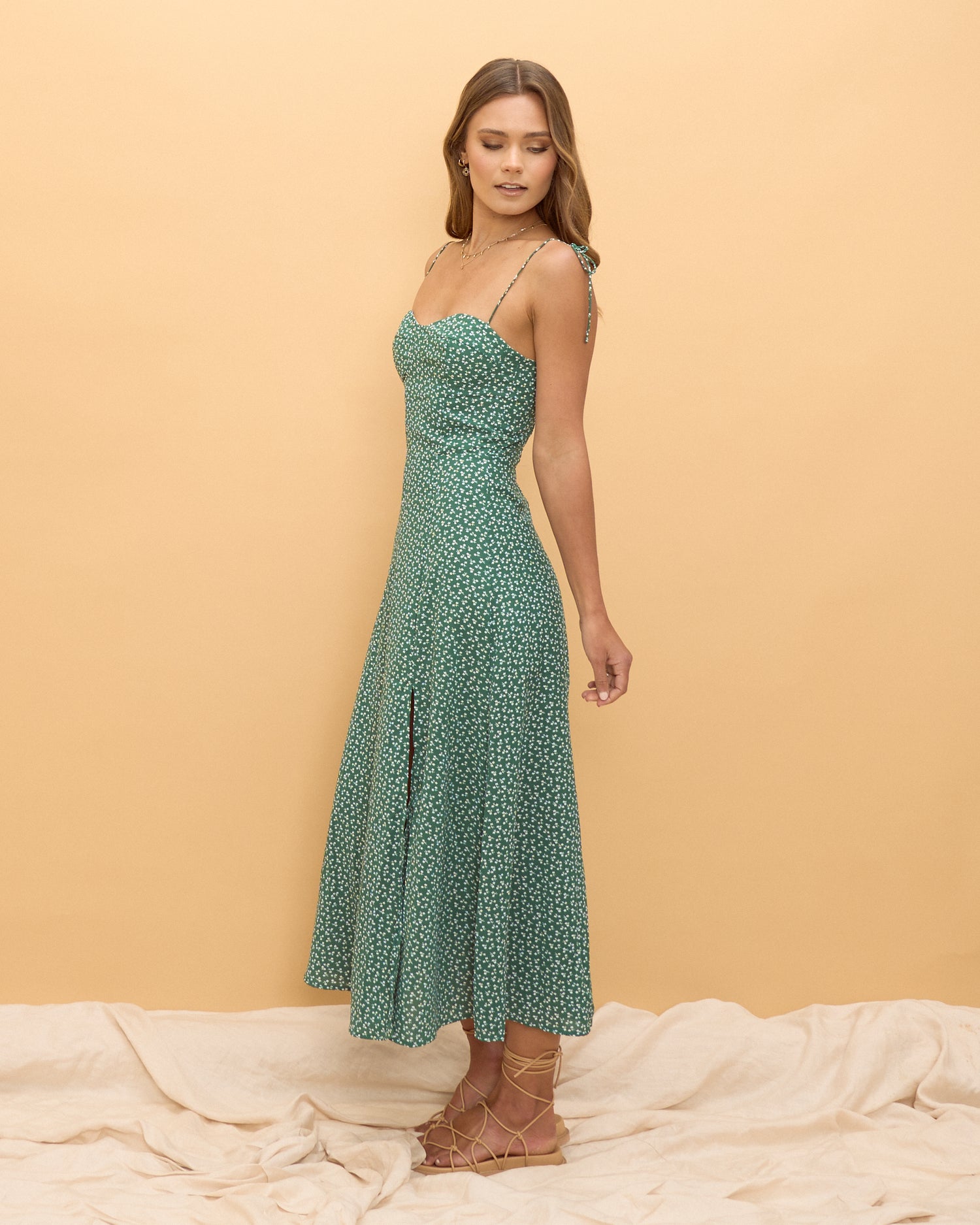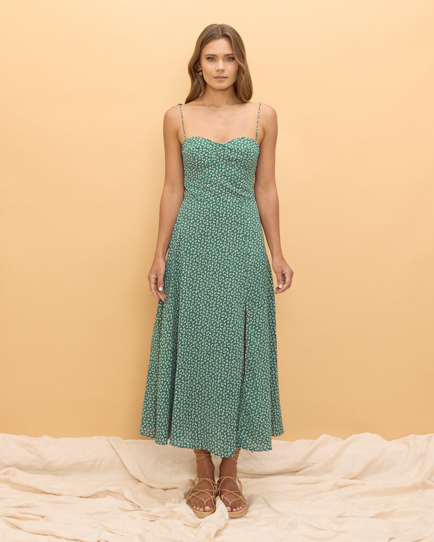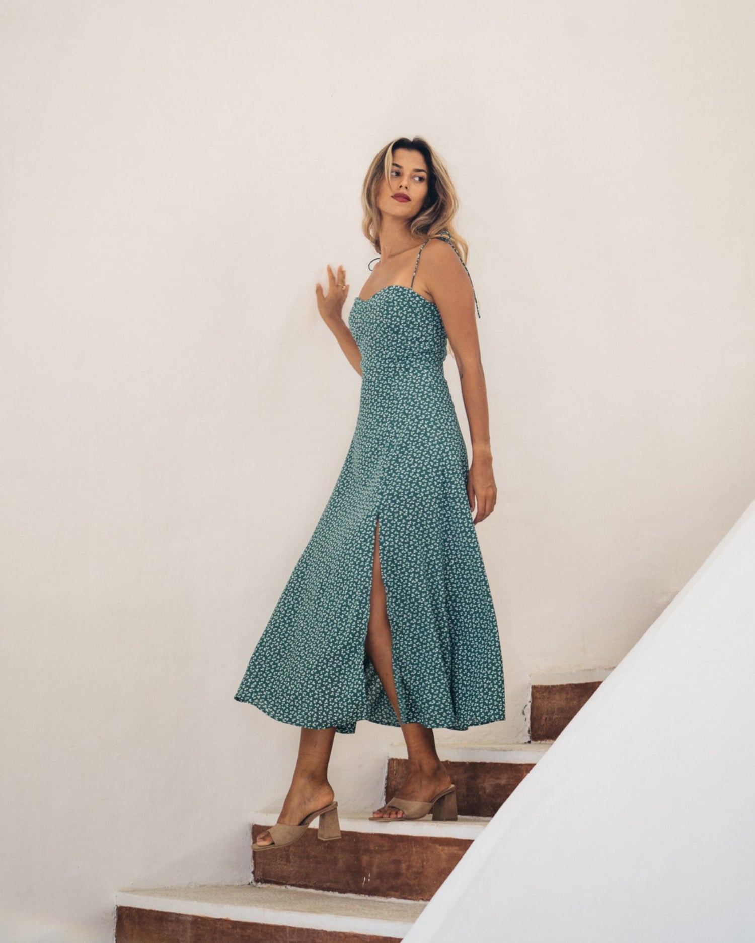 The Miriam dress is perfect for any summer event! The sweetheart neckline and adjustable spaghetti straps make it flattering and comfortable, while the slit adds a touch of sexy. The shirred bodice ensures a perfect fit, while the green floral print makes you stand out from the crowd.