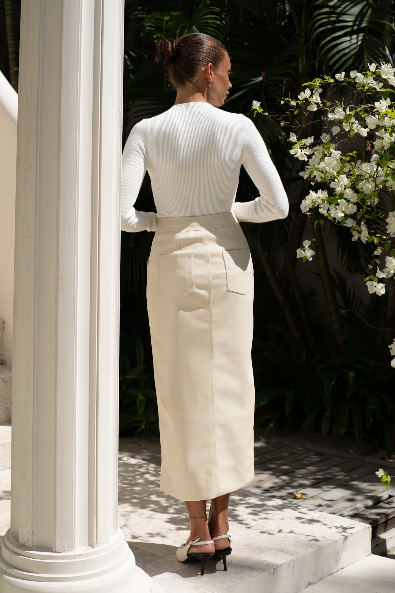 Structured. Sleek. Slightly smug in how effortlessly cool it is, Mollie isn’t your average midi. This faux leather number walks the line between boardroom boss and downtown darling. It hugs just enough, falls just right, and throws in a cheeky front split for good measure (because, yes, we like to move).