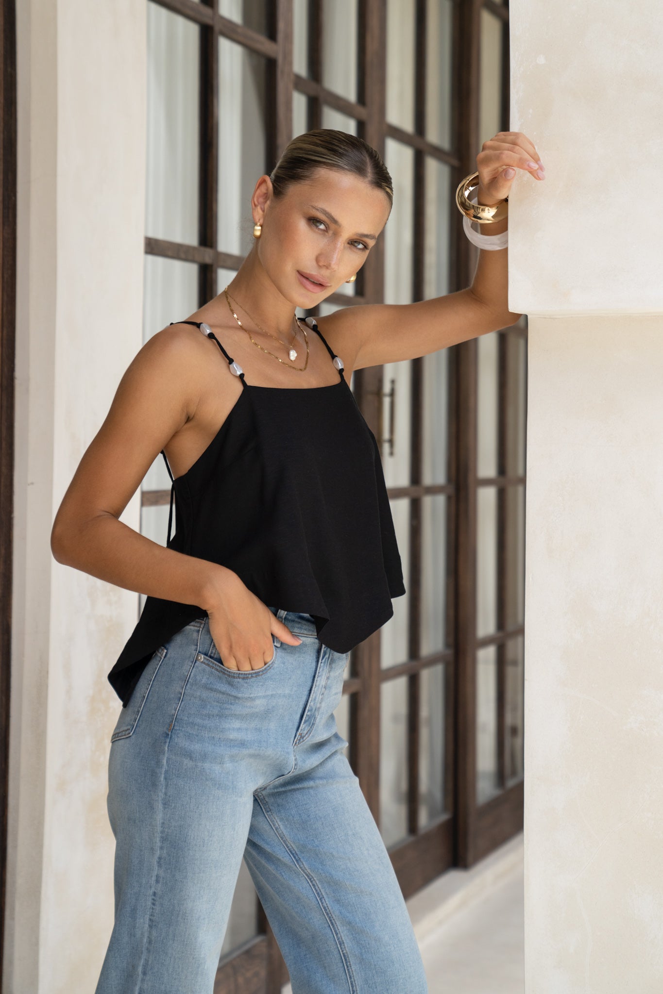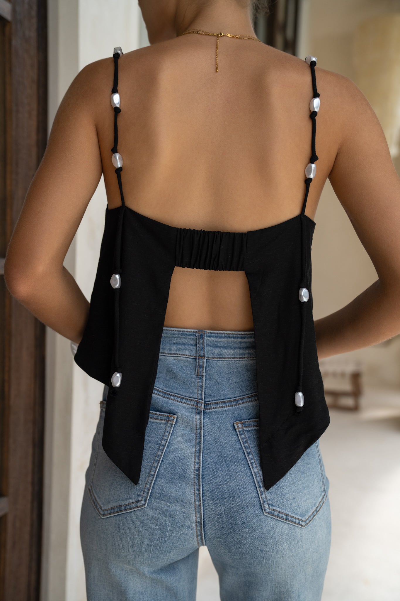 From the front, she keeps things chic and simple: a clean square neckline, fluid black fabric, an easy drape that lands in a soft pointed hem over your waistband. But then you clock the straps — delicate cords dotted with irregular pearl-style beads — and suddenly it’s giving “holiday cocktail on a rooftop somewhere warm.”