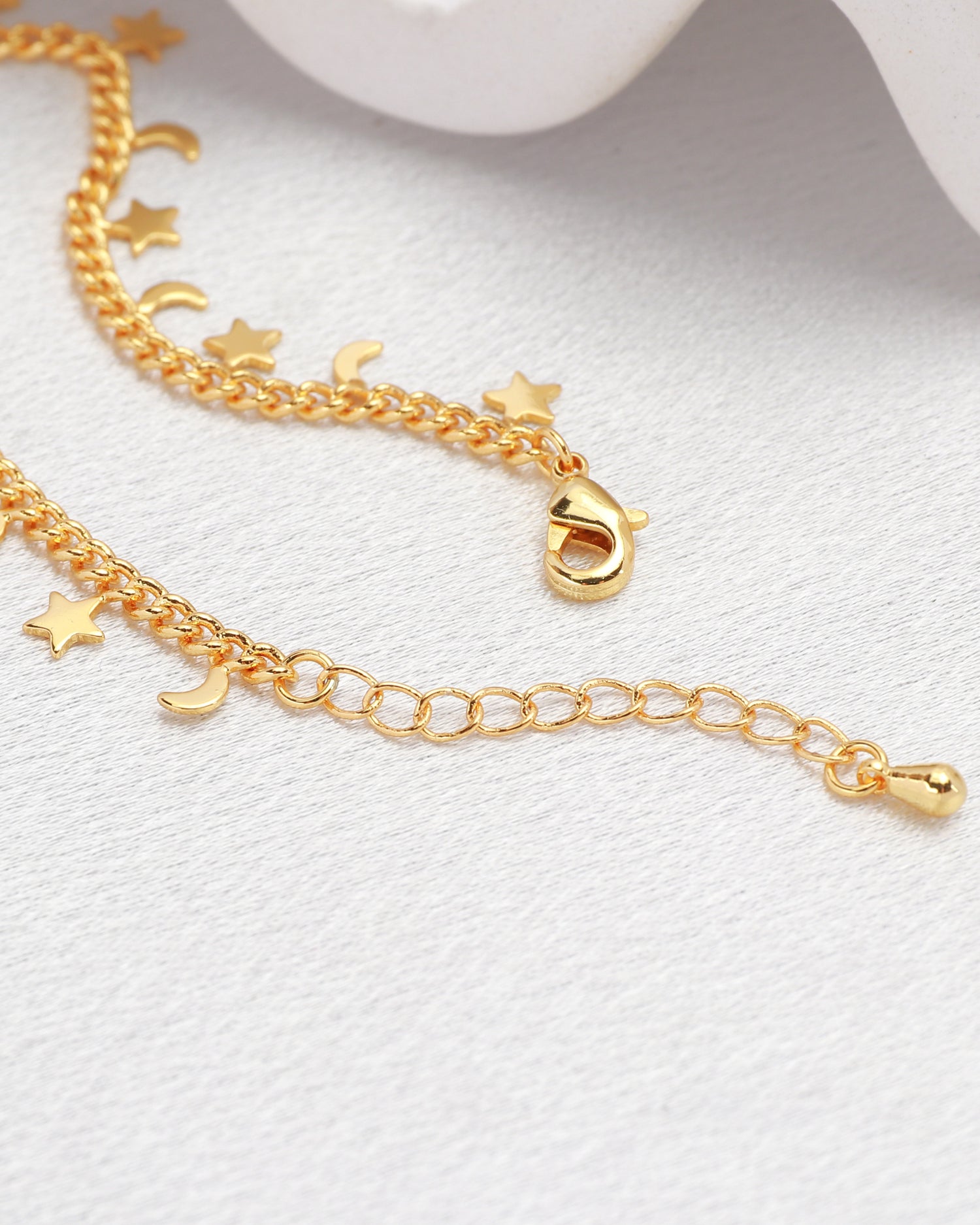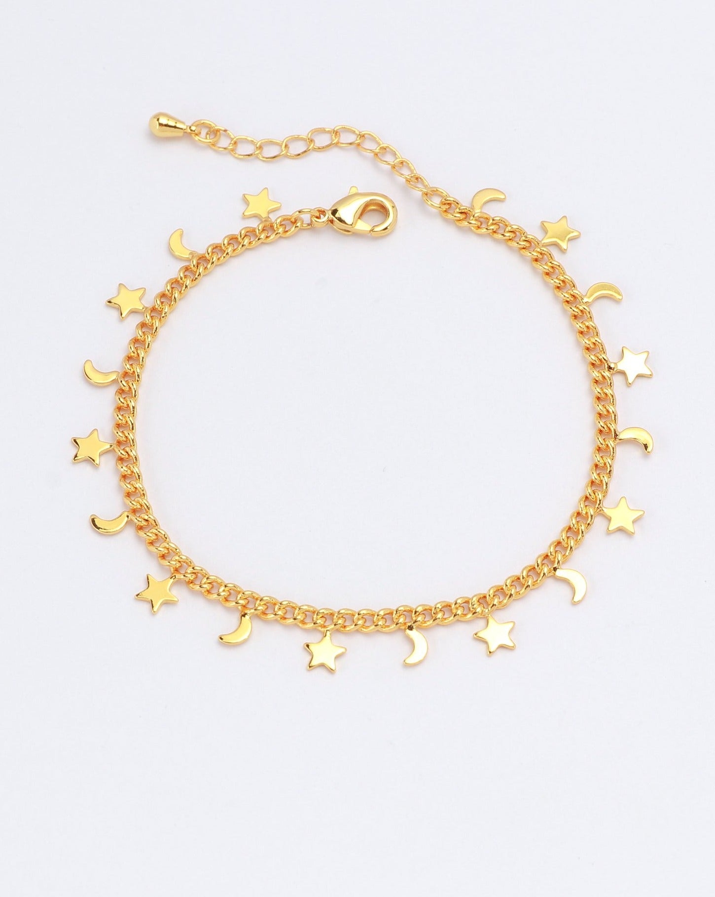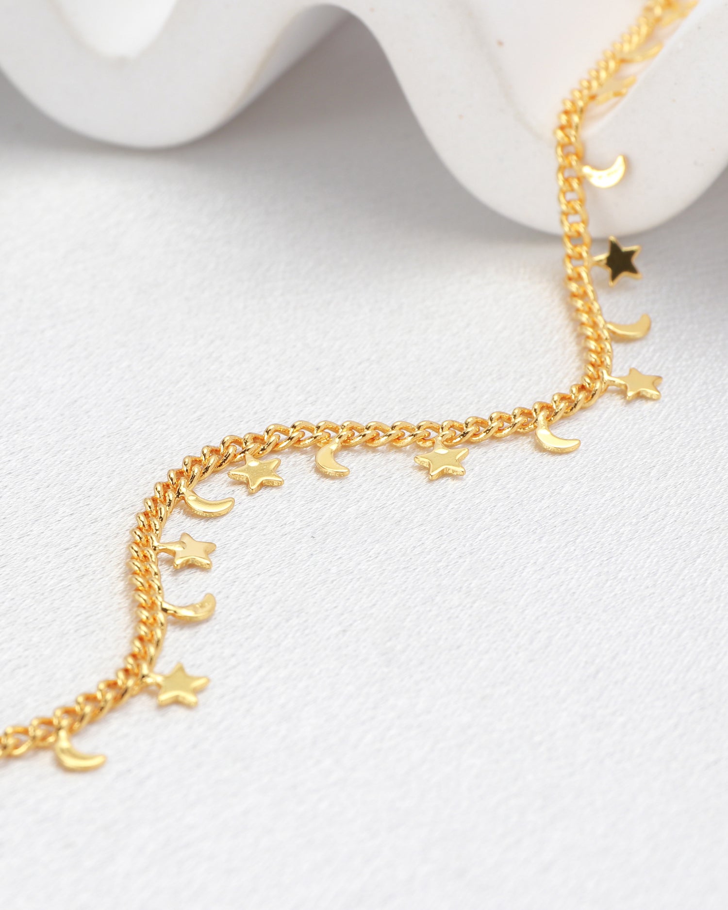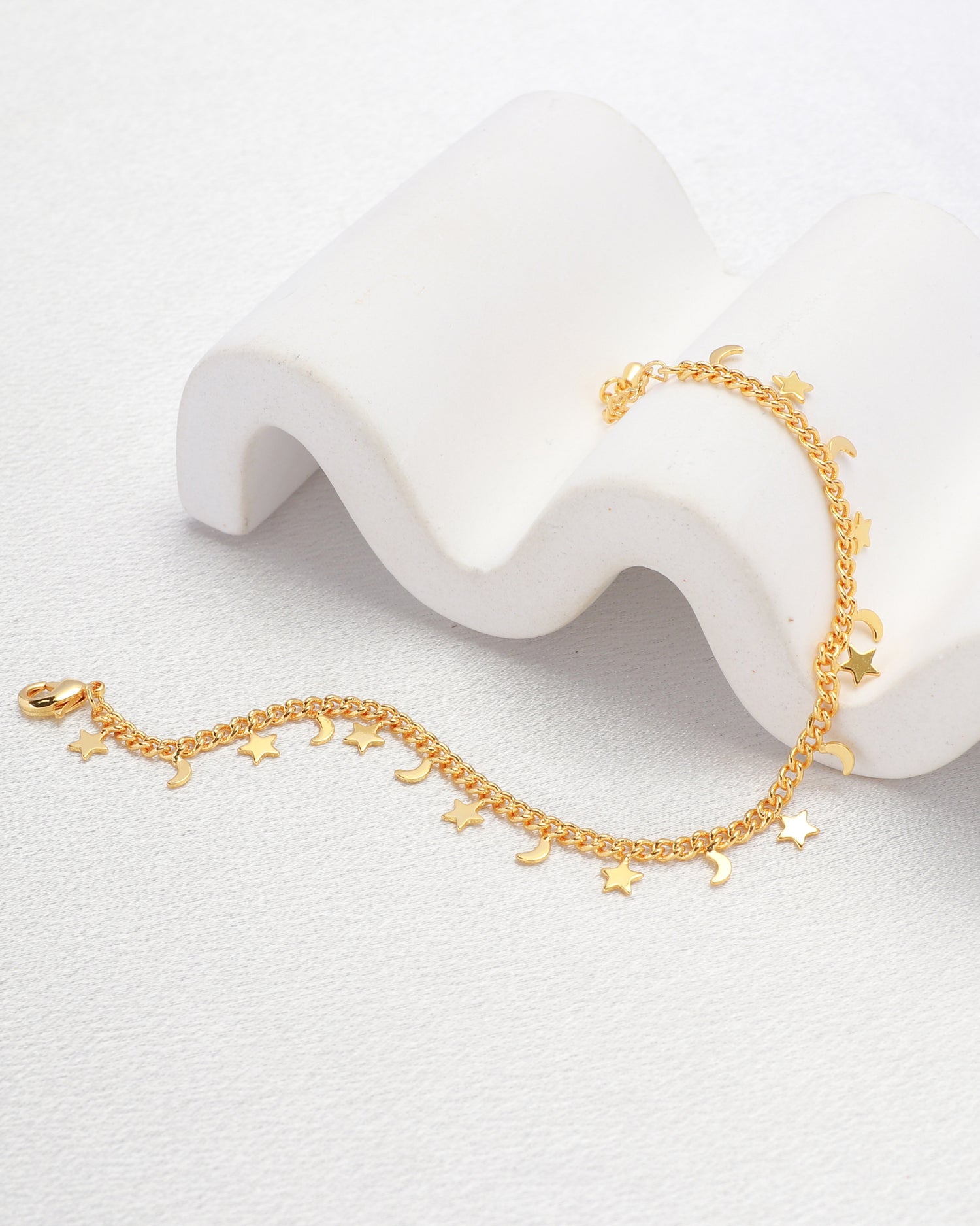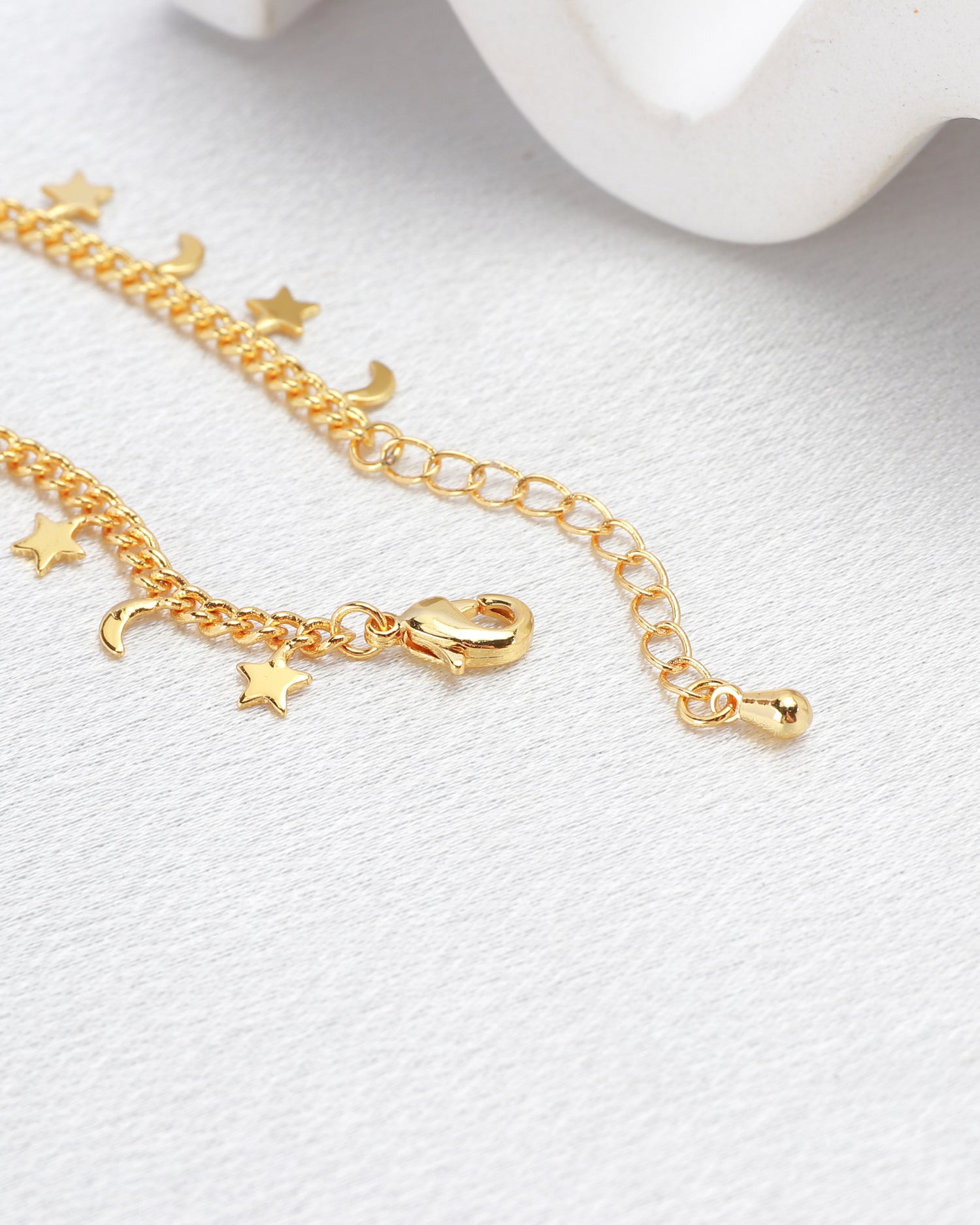 Illuminate your style with the Moon and Stars Gold Bracelet, a celestial-inspired adornment that seamlessly merges elegance with cosmic charm. Crafted from premium 18k gold-plated brass, this bracelet features an enchanting moon and star small charms, adding a touch of celestial whimsy to your wrist. The lobster clasp ensures a secure closure, while the adjustable chain length offers a customisable fit, allowing you to tailor the bracelet to your individual style. Elevate your look with this exquisite piece, seamlessly combining the opulence of gold with the celestial allure of the moon and stars for a bracelet that captures the magic of the night sky in a timeless design.